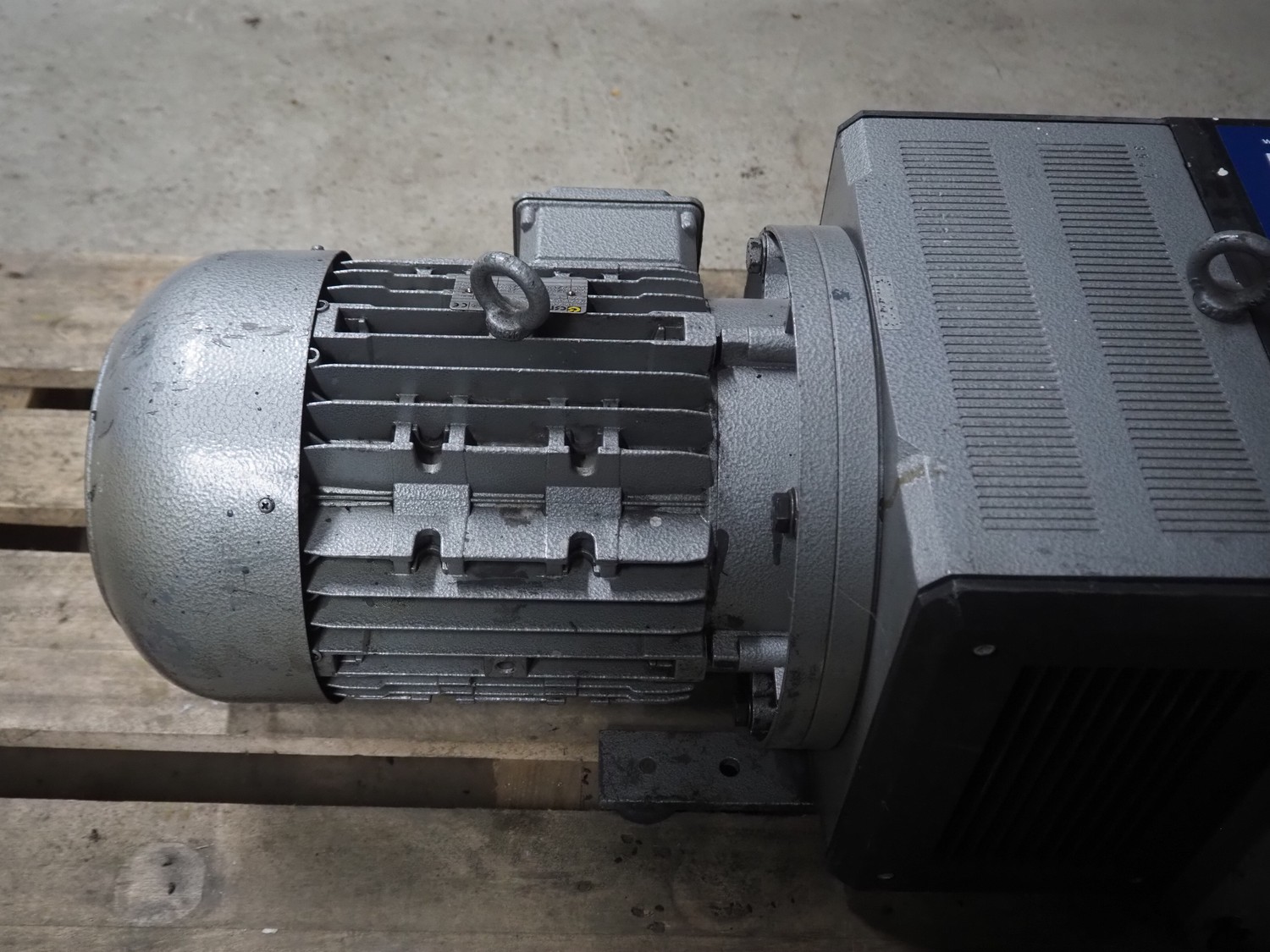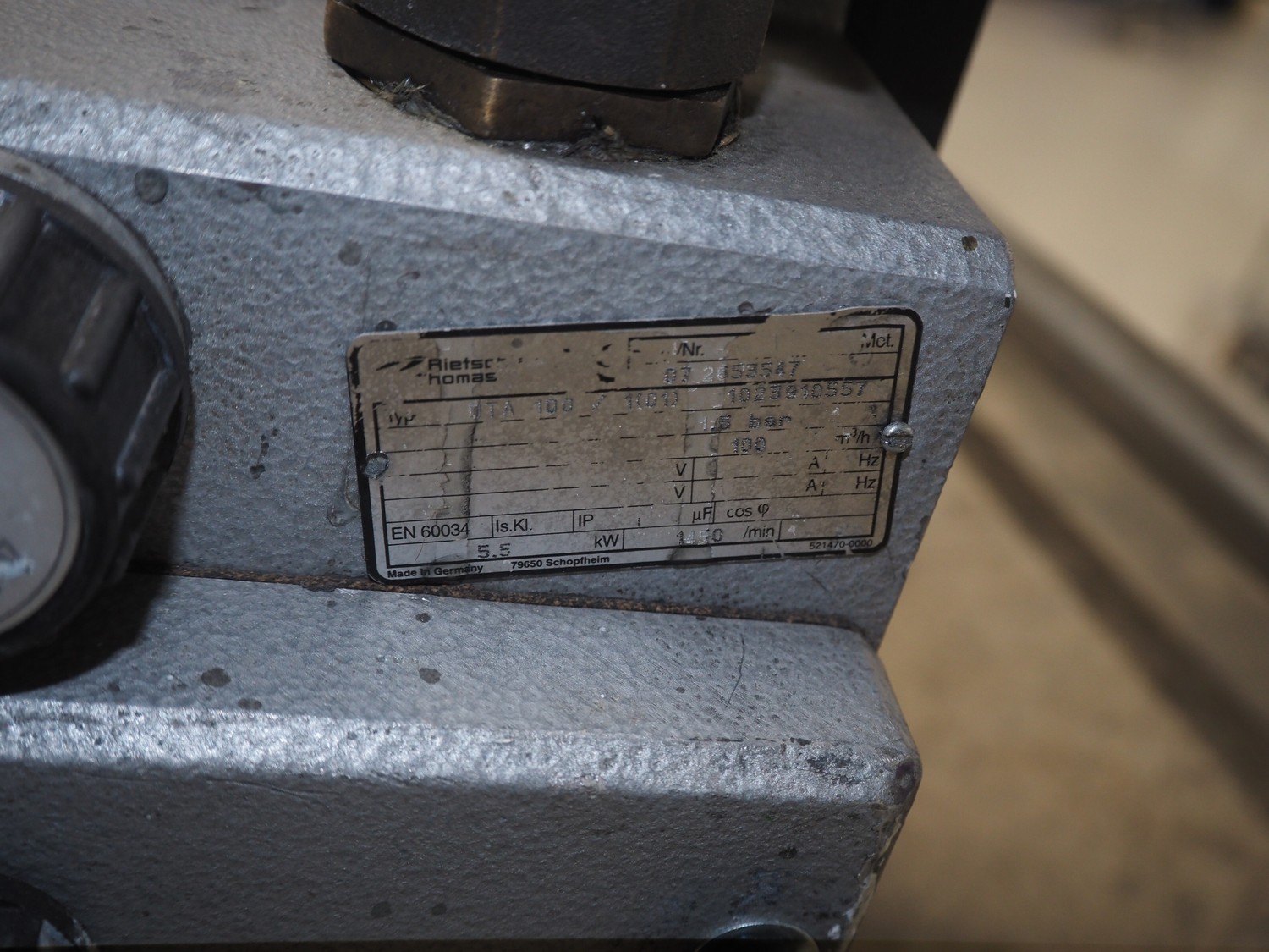 Rietschle vacuum pump, type: DTA 100/1(01), year of construction: 2007, serial number: 2553547, capacity: 100 m³ per hour, dimensions: 950 mm x 450 mm x 600 mm.