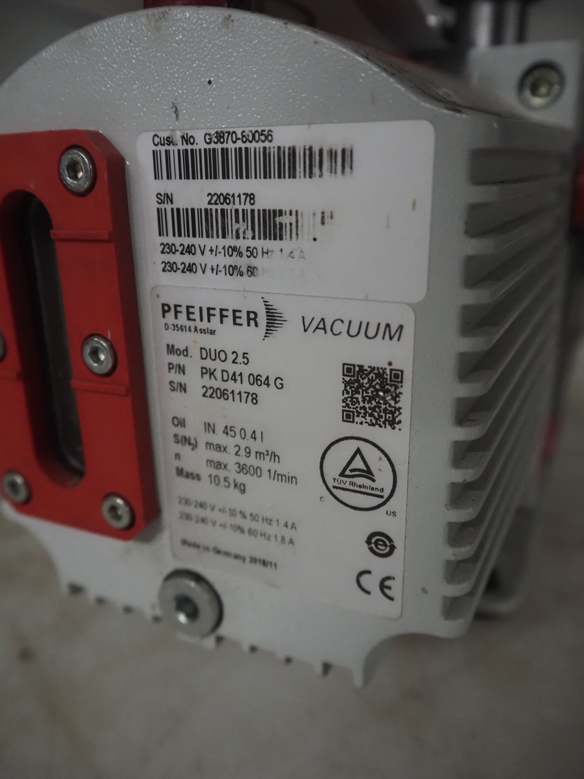 Pfeiffer Vacuum pump, model: DUO 2.5, serial number: 22061178, year of construction: 2018, capacity: 2.9 m³ per hour, weight: 10.5 kg, dimensions: (3x) 310 mm x 120 mm x 190 mm.