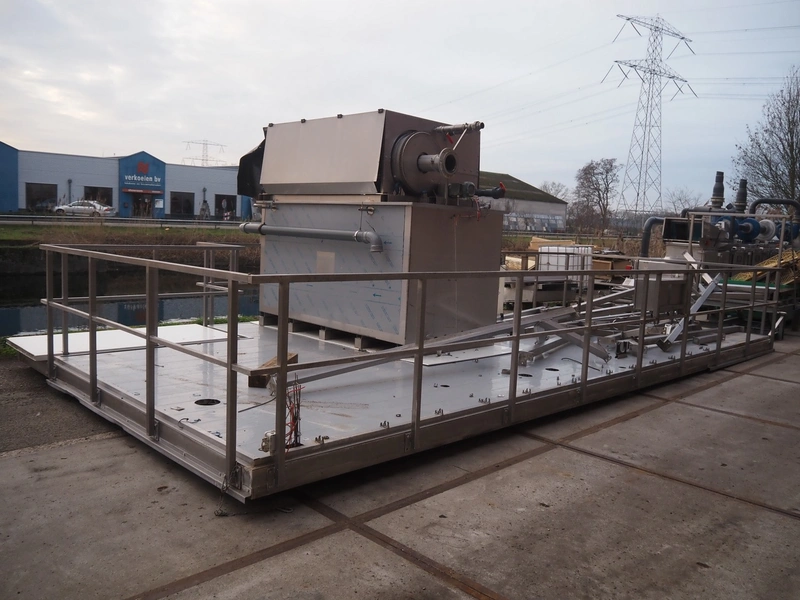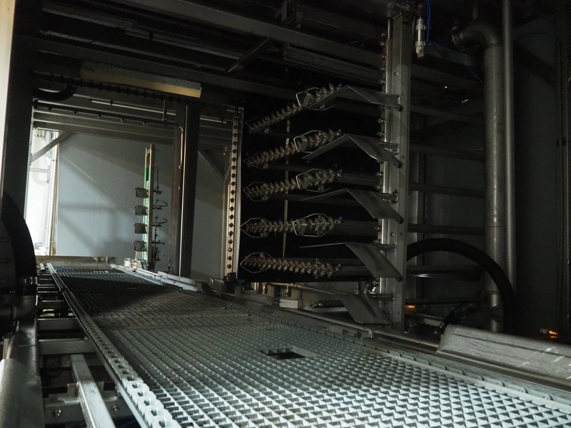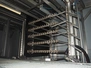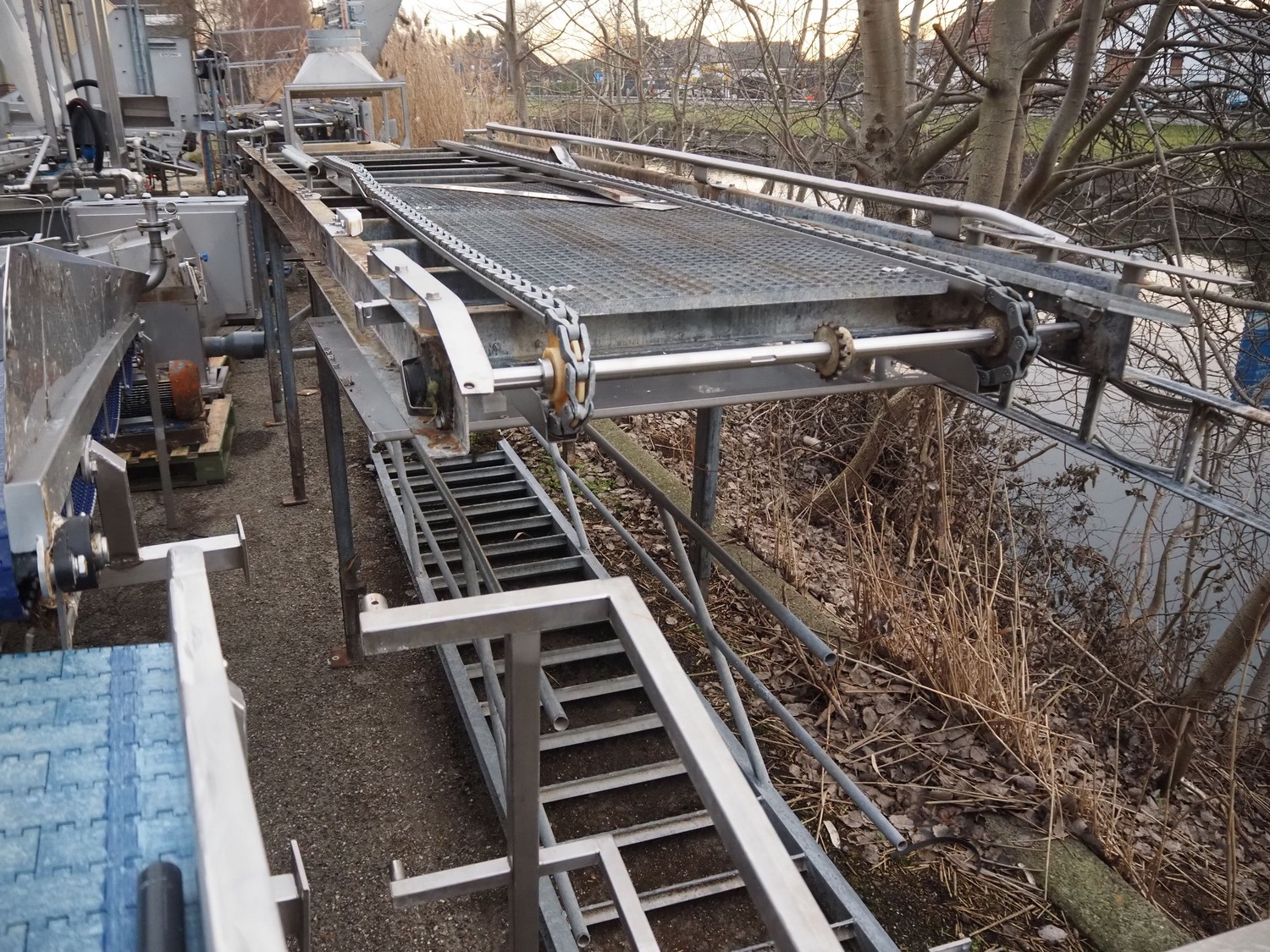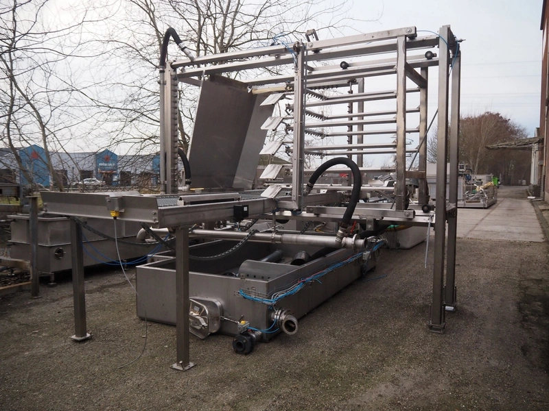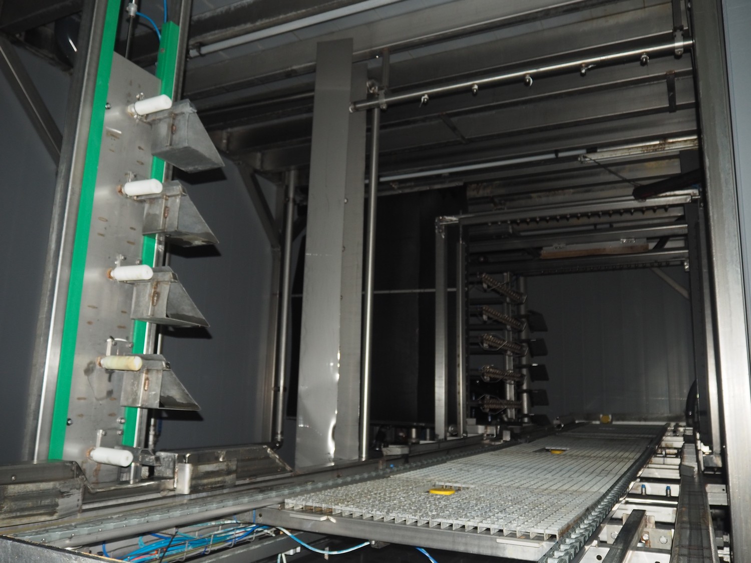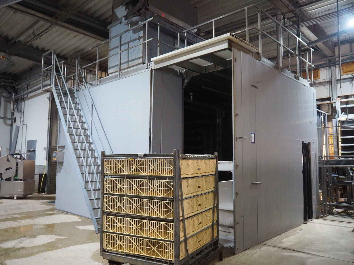 Washing machine for bird crates, total belt width: 1200 mm, clearance: 1200 mm x 1600 mm, total dimensions: 5000 mm x 10000 mm x 6400 mm. Lot already dismantled.