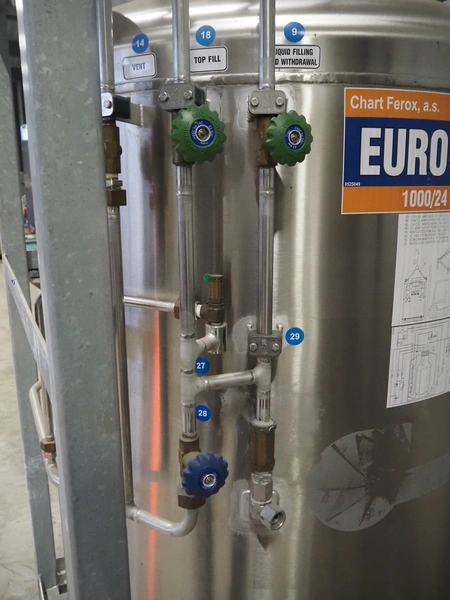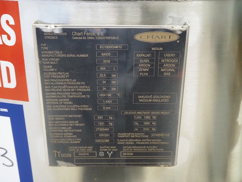 Chart Ferox, a.s. s/s tank for nitrogen, argon or natural gas, type: EC1000/24M12, serial number: 64933, year of construction: 2016, volume: 954 litres, dimensions: 1180 mm x 1180 mm x 2160 mm.