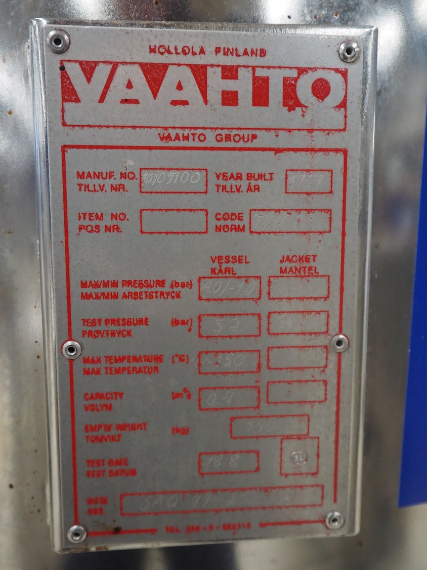 Vaahto s/s tank, manufacturing number: 10109700, year of construction: 1999, dimensions tank: Ø 900 mm x 930 mm, total dimensions: 1000 mm x 900 mm x 1800 mm.