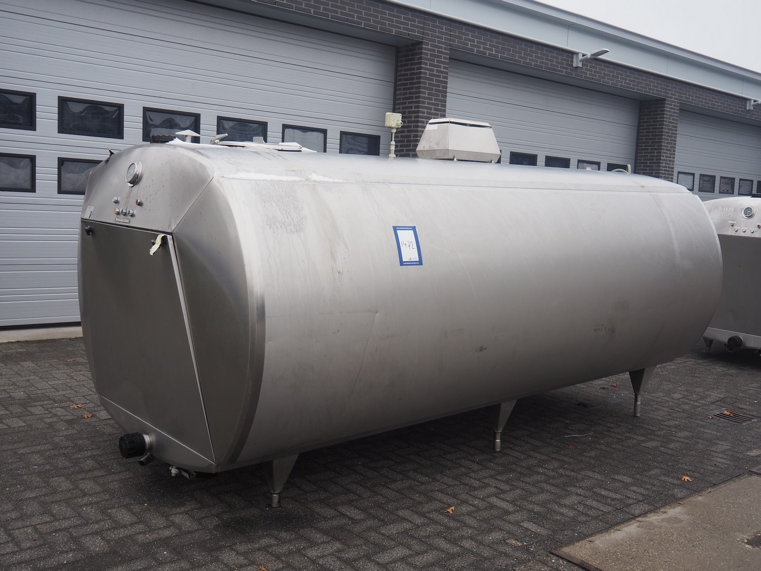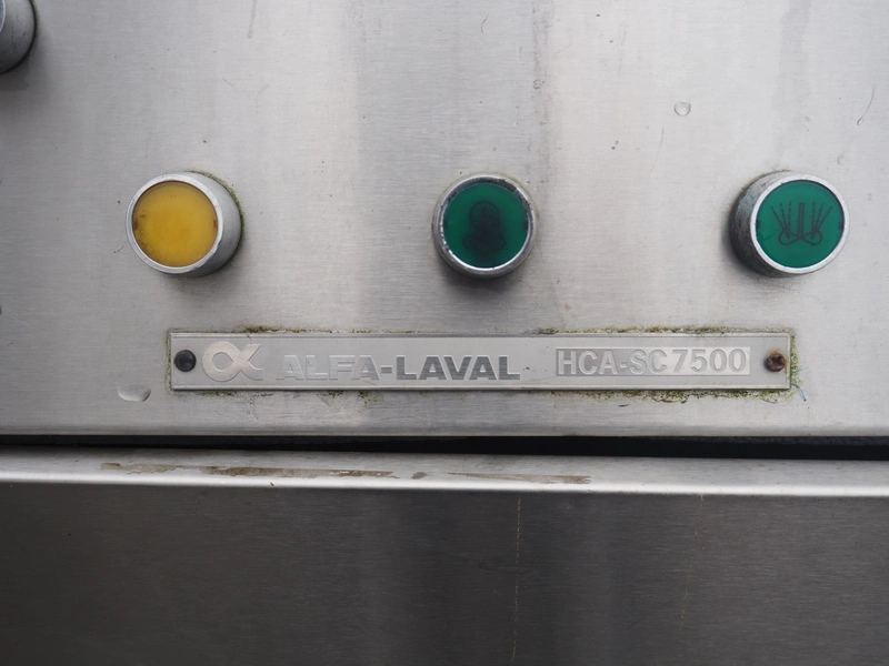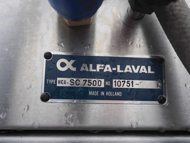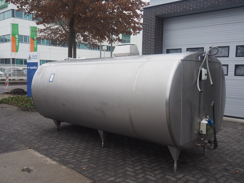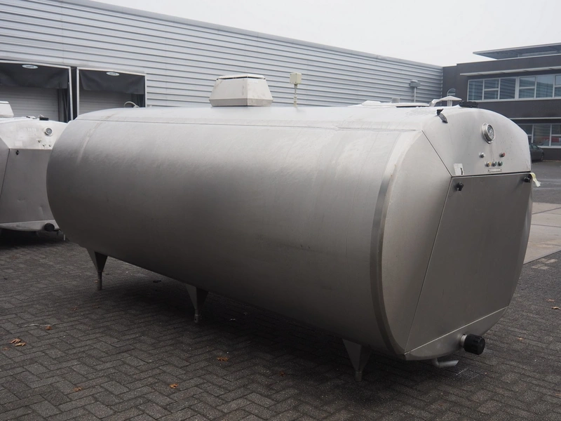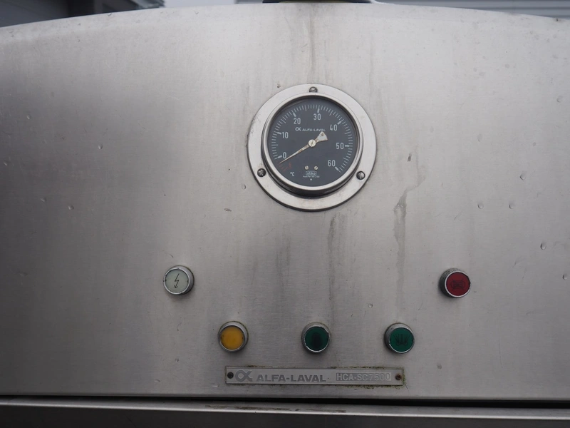 Alfa-Laval s/s milk cooling tank with mixing arm, type: HCA-C 7500, serial number: 10751, volume: 7800 litres, dimensions: 3350 mm x 1500 mm x 1750 mm. With integrated cooling system.