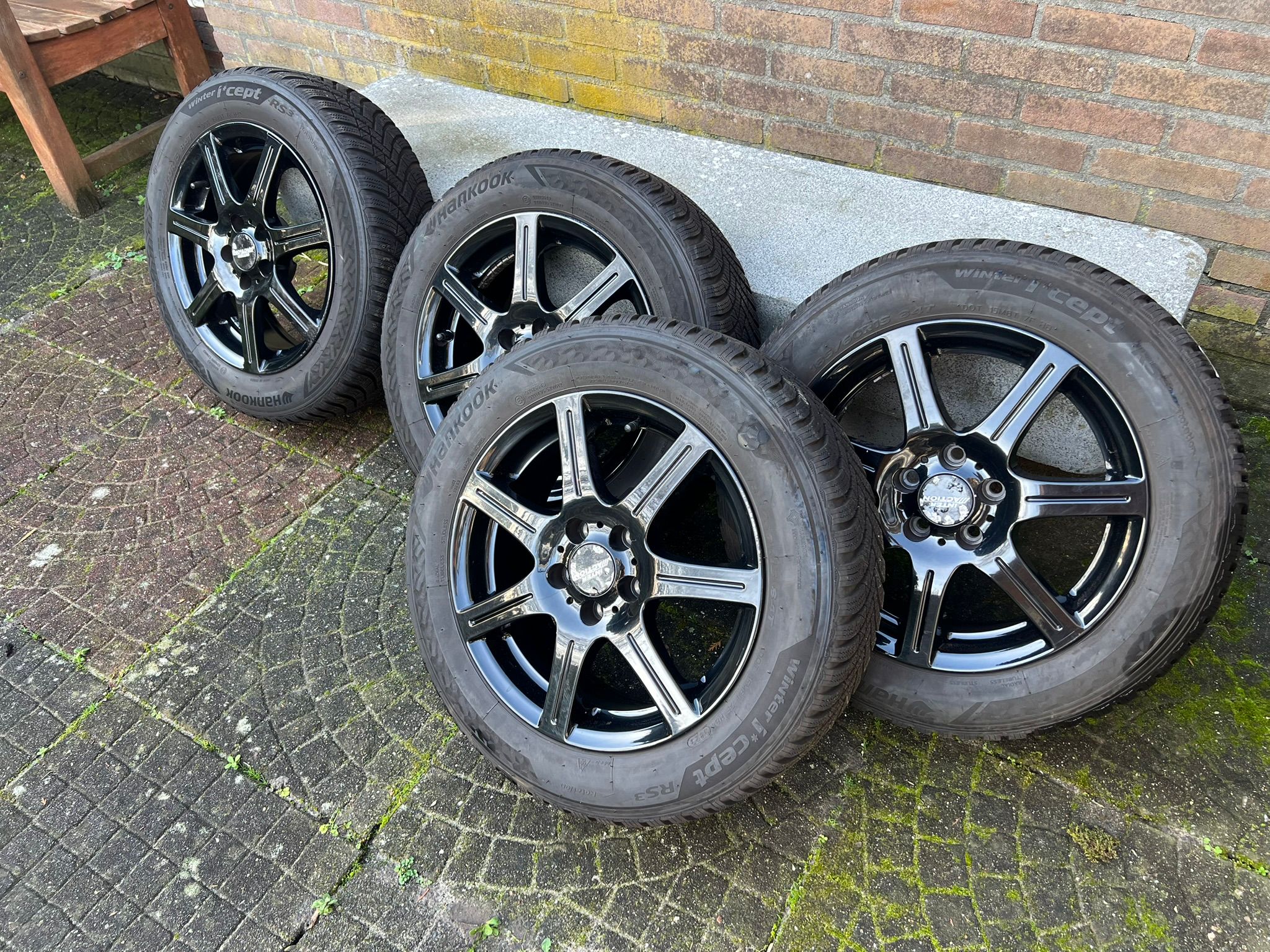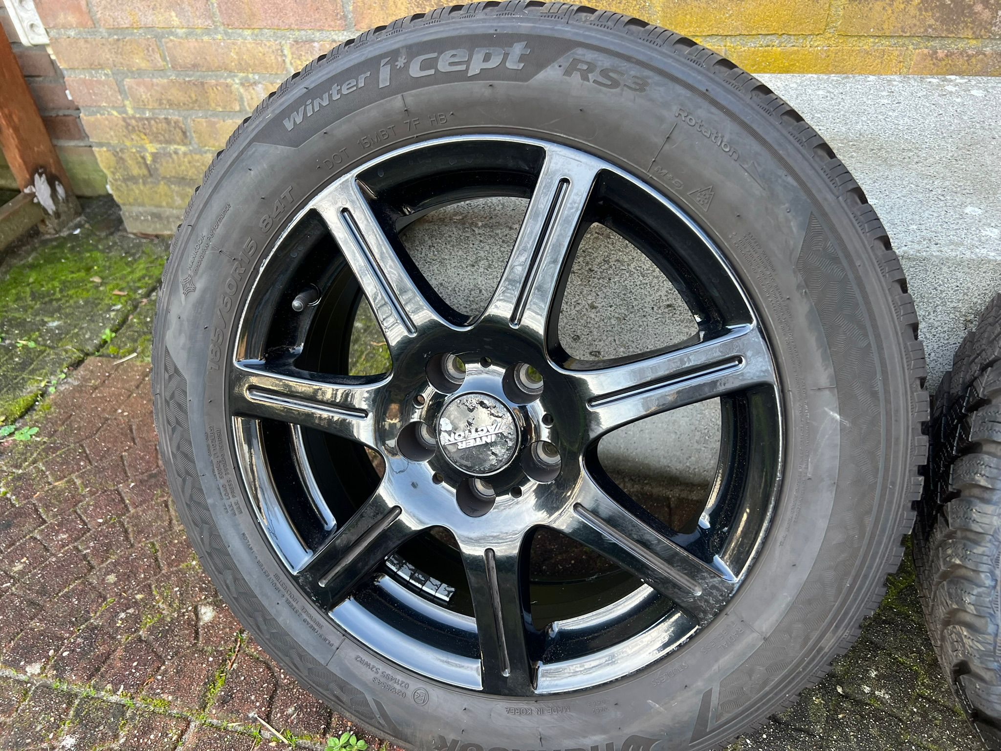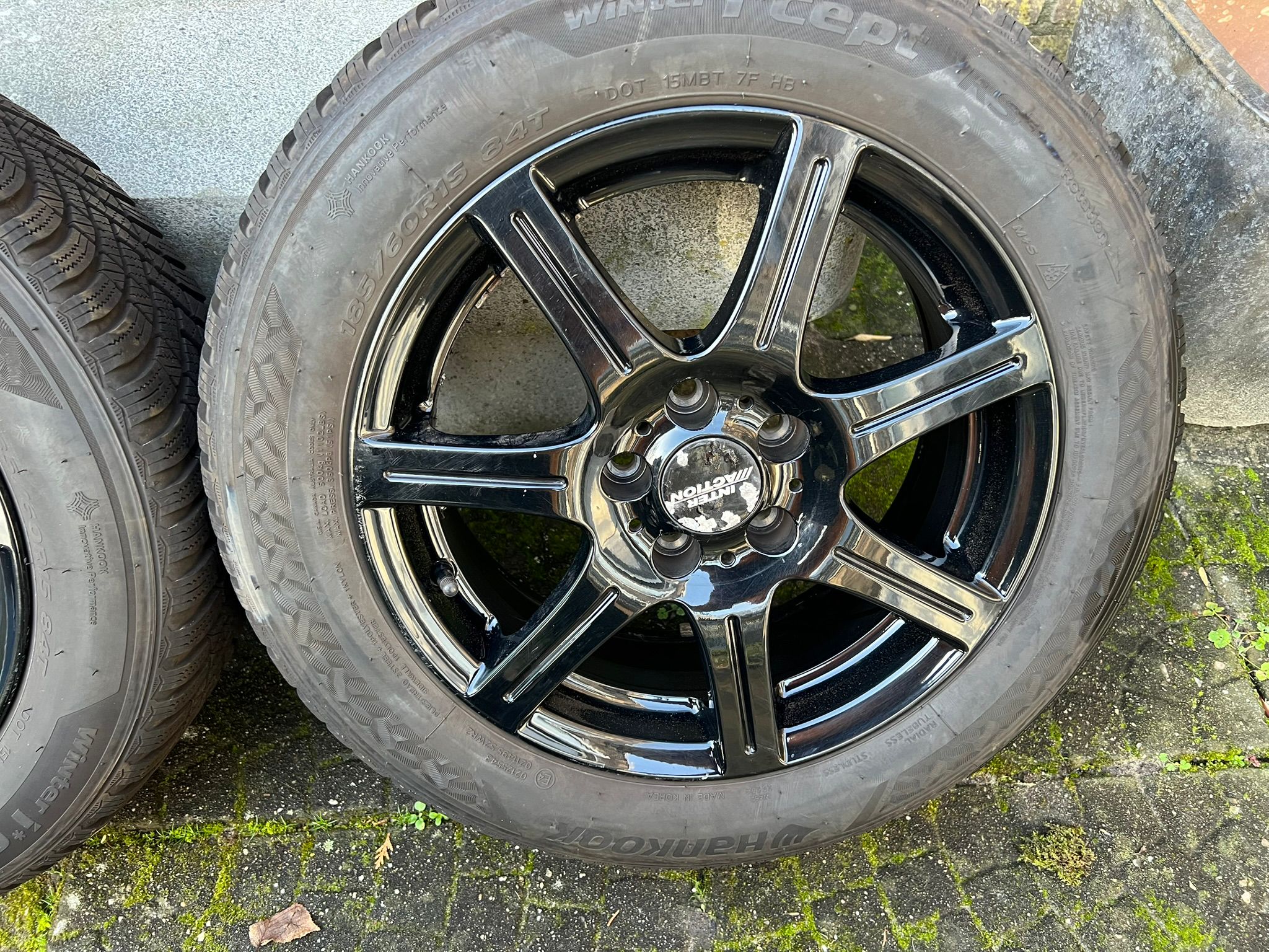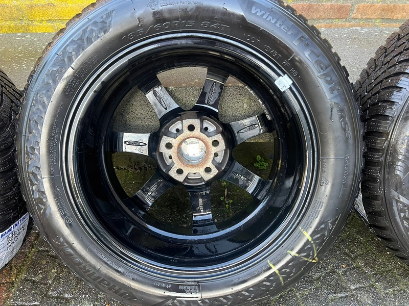 Inter Action Sirius Shiny Black 15 inch Alloy wheels with Hankook Winteri*cept winter tires, size: 185/60R15, tread depth: (2x) 7mm and (2x) 6,5 mm.
