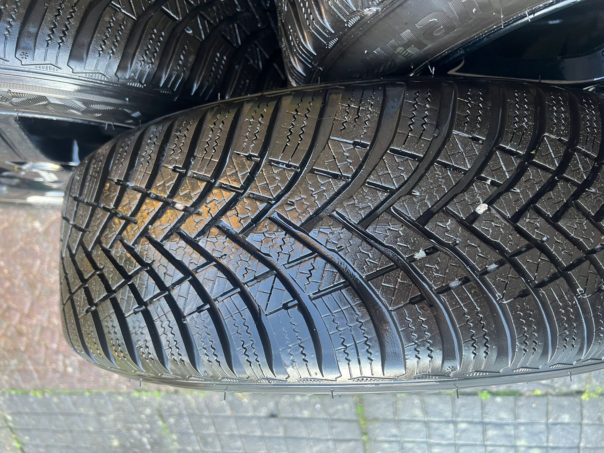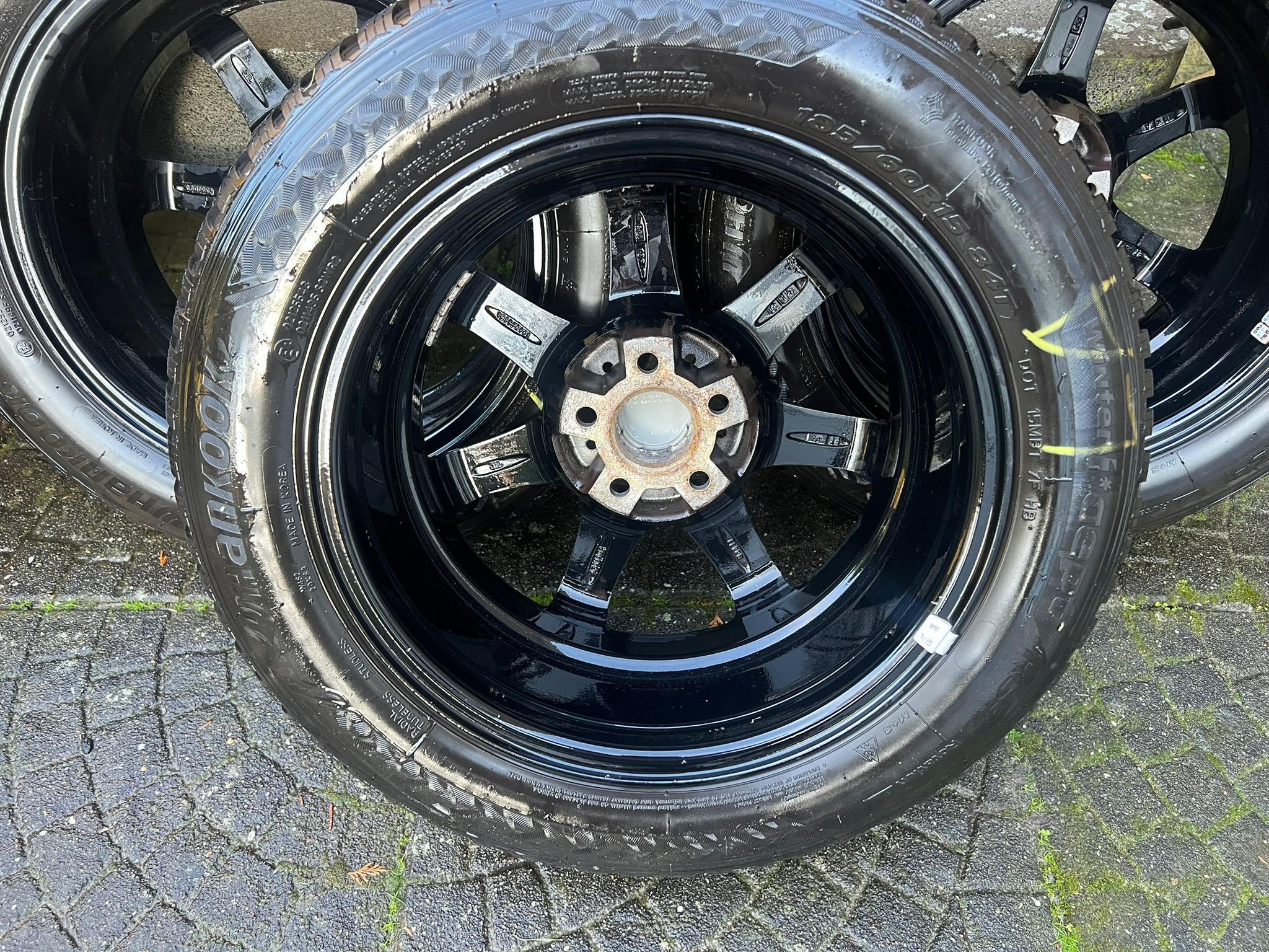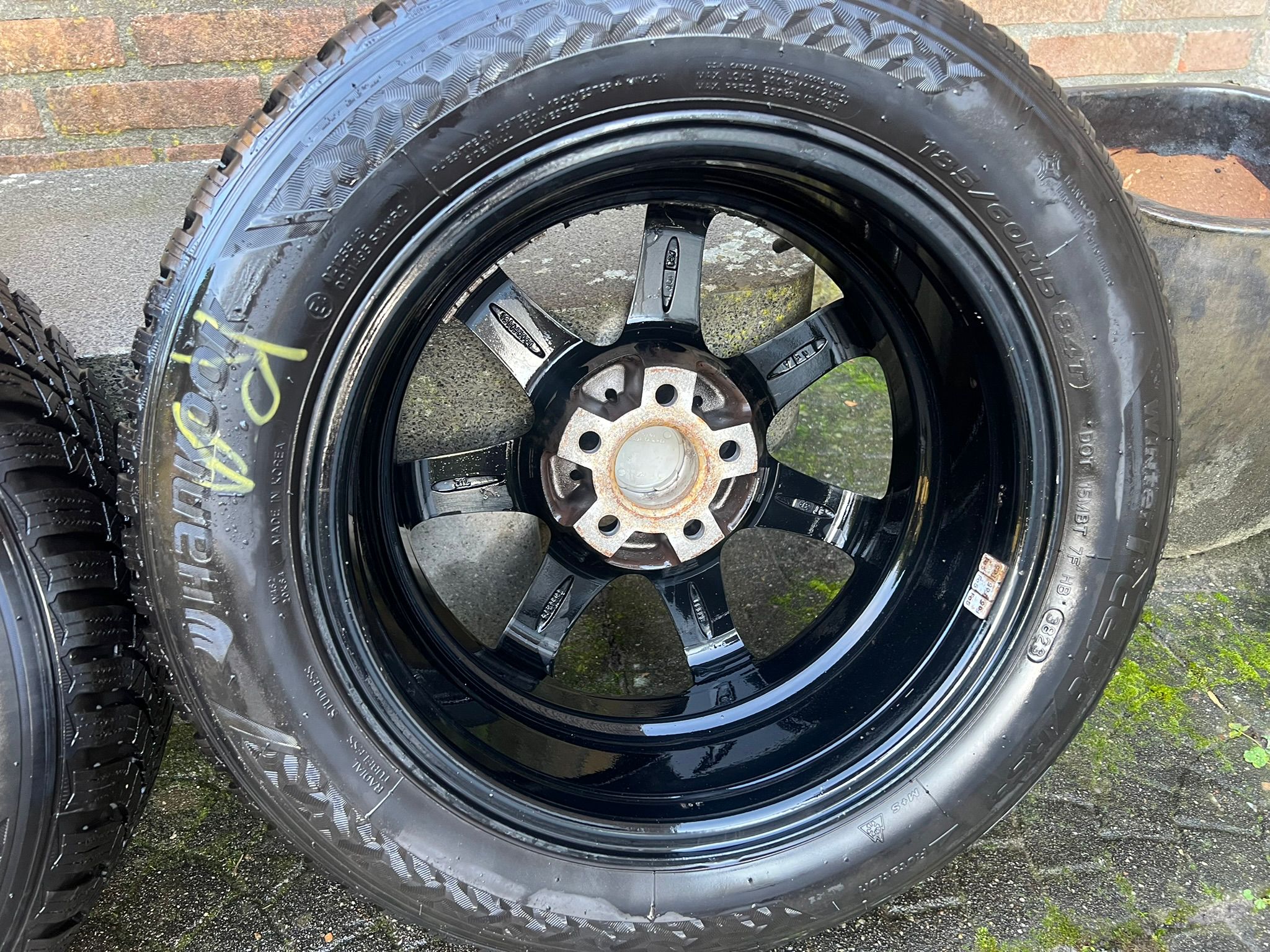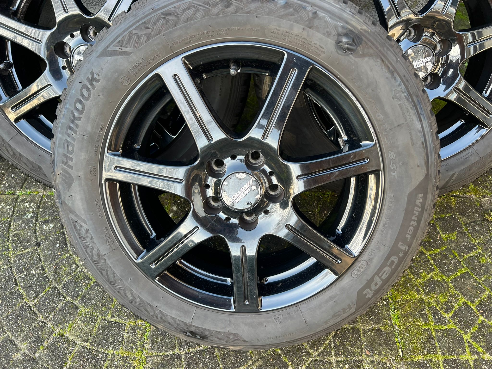 Inter Action Sirius Shiny Black 15 inch Alloy wheels with Hankook Winteri*cept winter tires, size: 185/60R15, tread depth: (2x) 7mm and (2x) 6,5 mm.