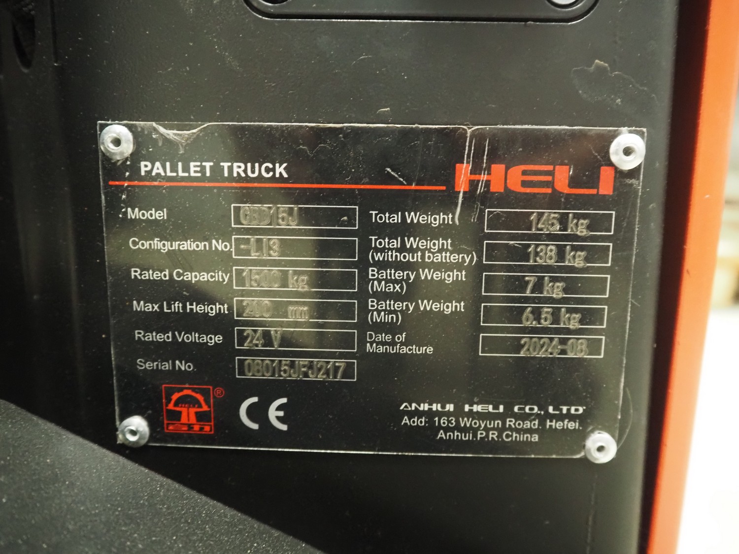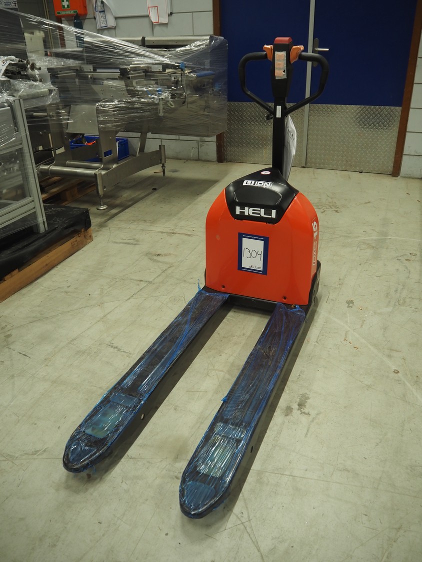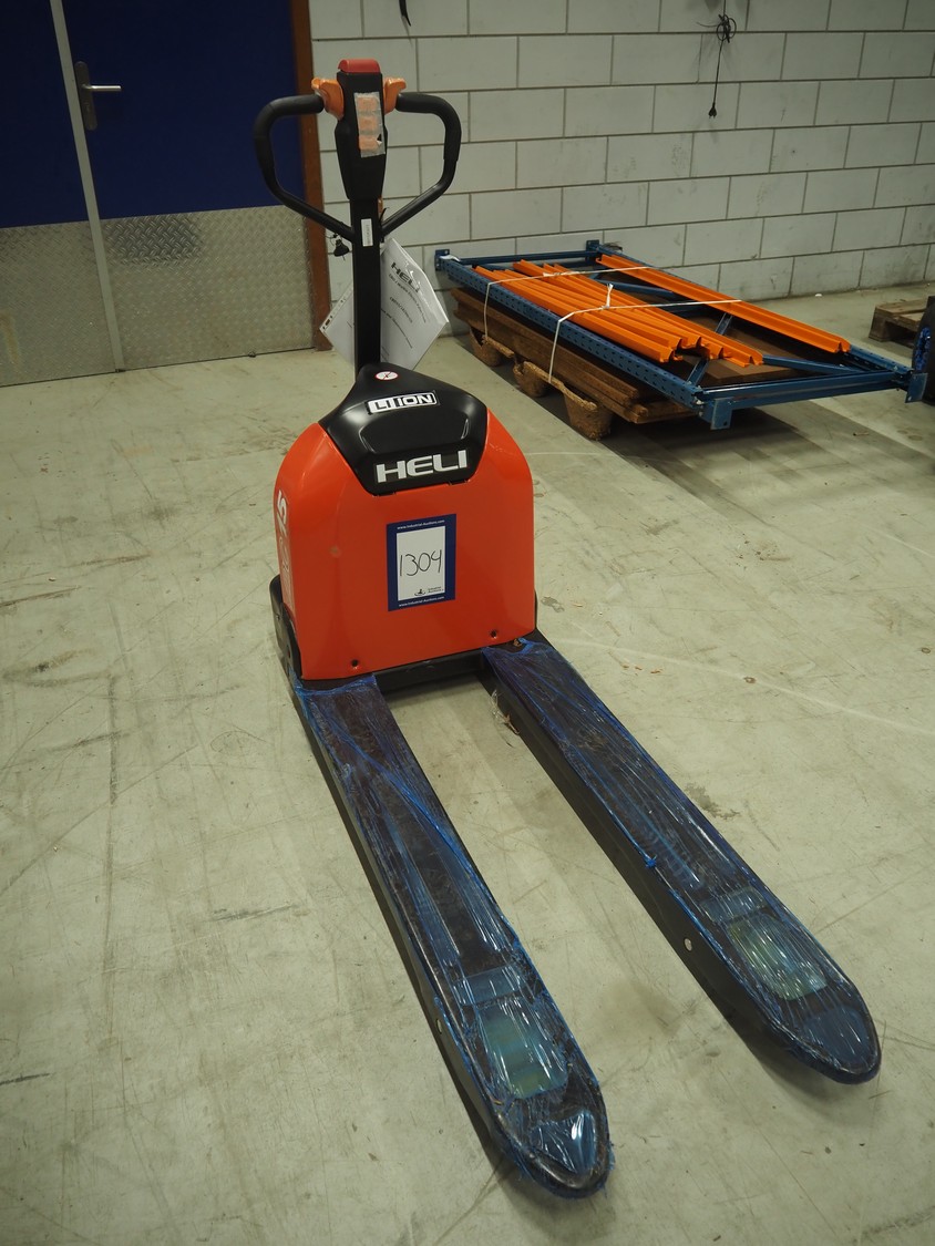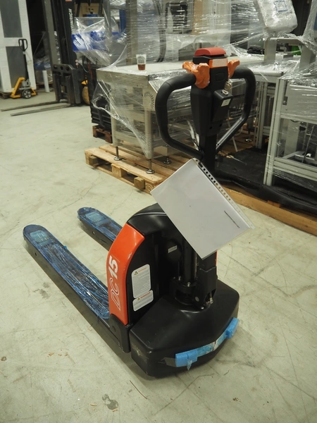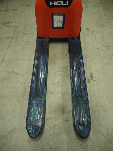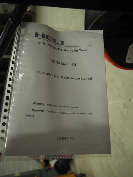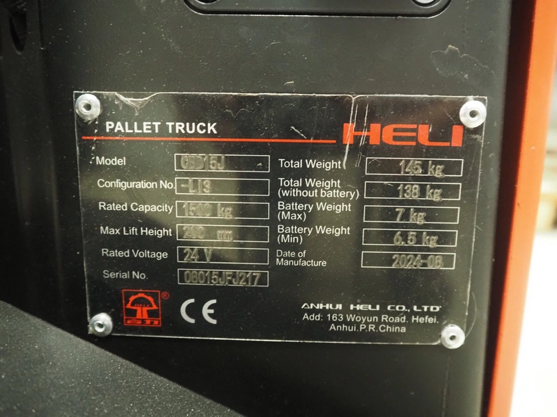 HELI electric pallet lifter, model: GBD15J, serial number: 08015JFJ217, year of construction: 2024, capacity: 1500 kg, fork length: 1150 mm, total dimensions: 1550 mm x 560 mm x 1220 mm.