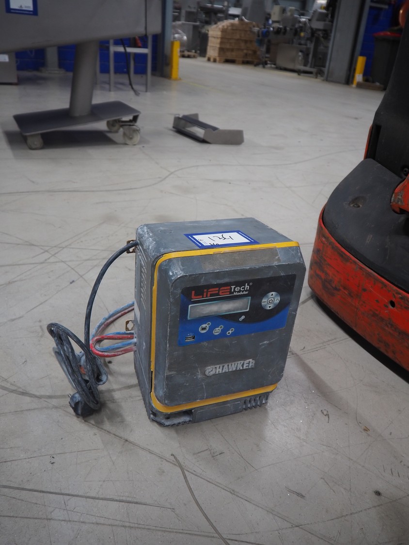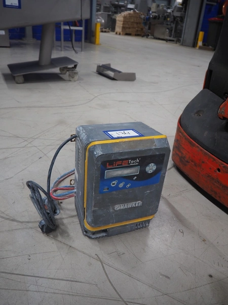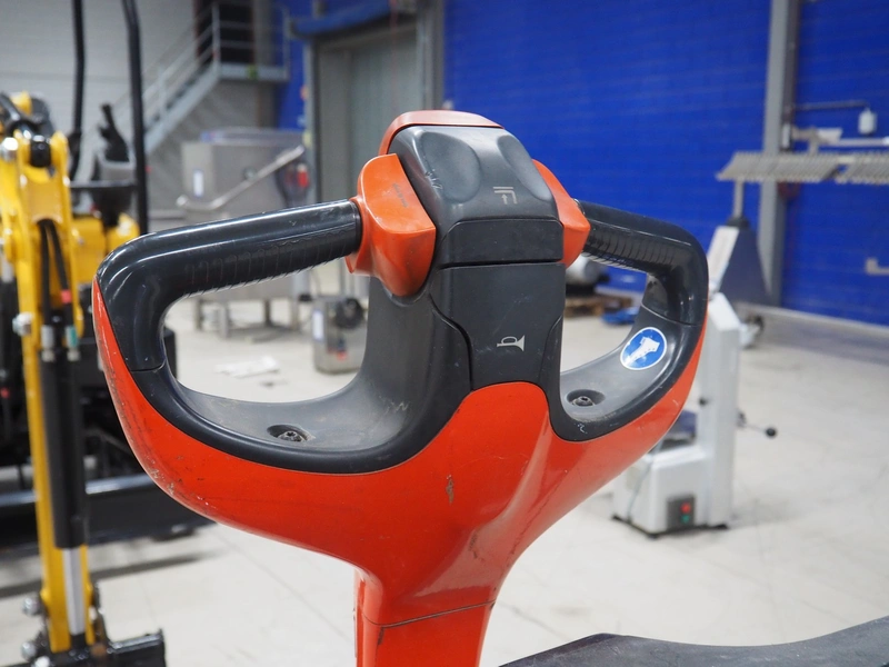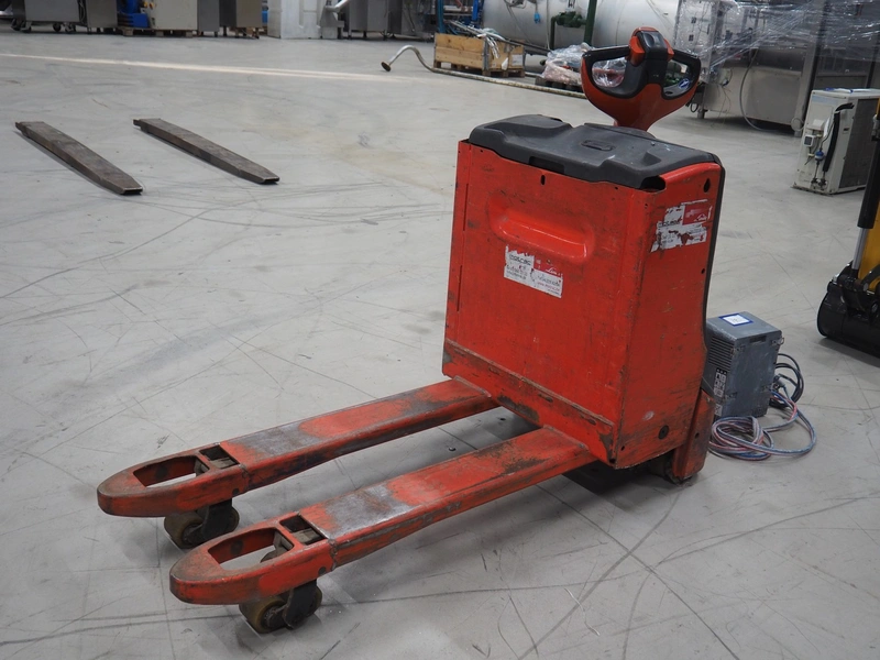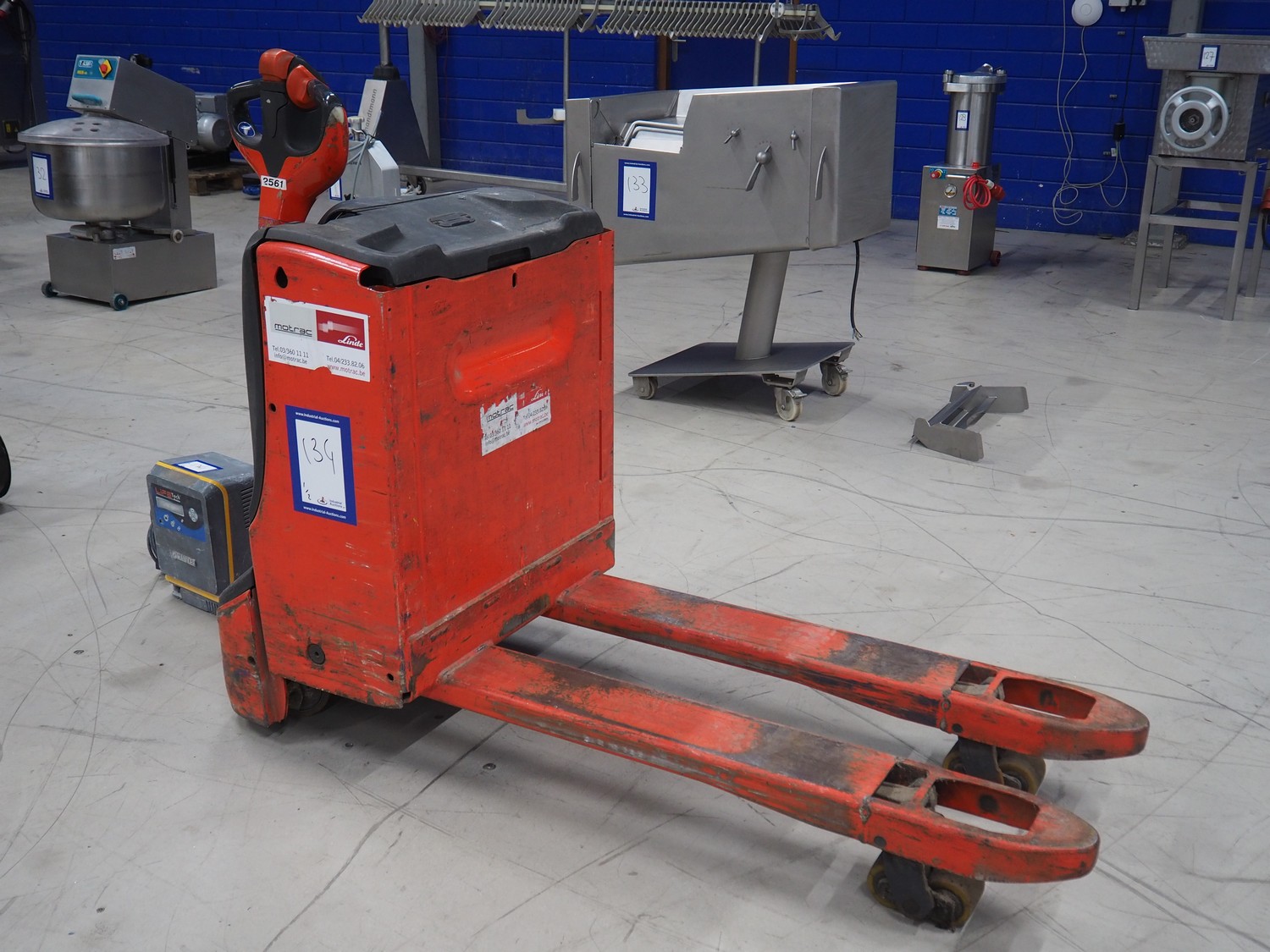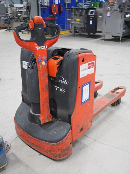 Linde Material Handling electric pallet lifter, type: T16, serial number: W41152C, year of construction: 2012, capacity: 1600 kg, fork length: 1150 mm, total dimensions: 1700 mm x 750 mm x 1300 mm. Including battery charger.