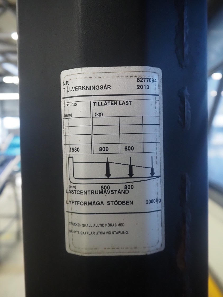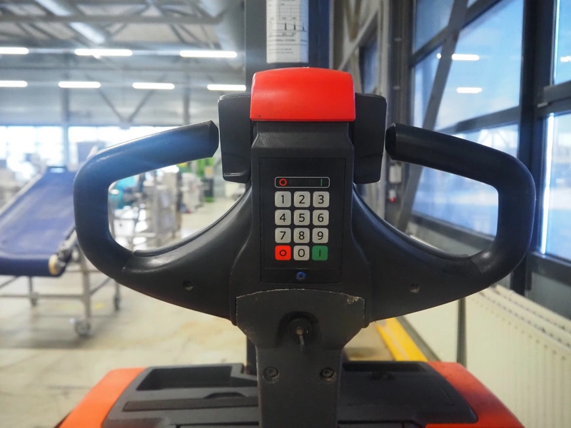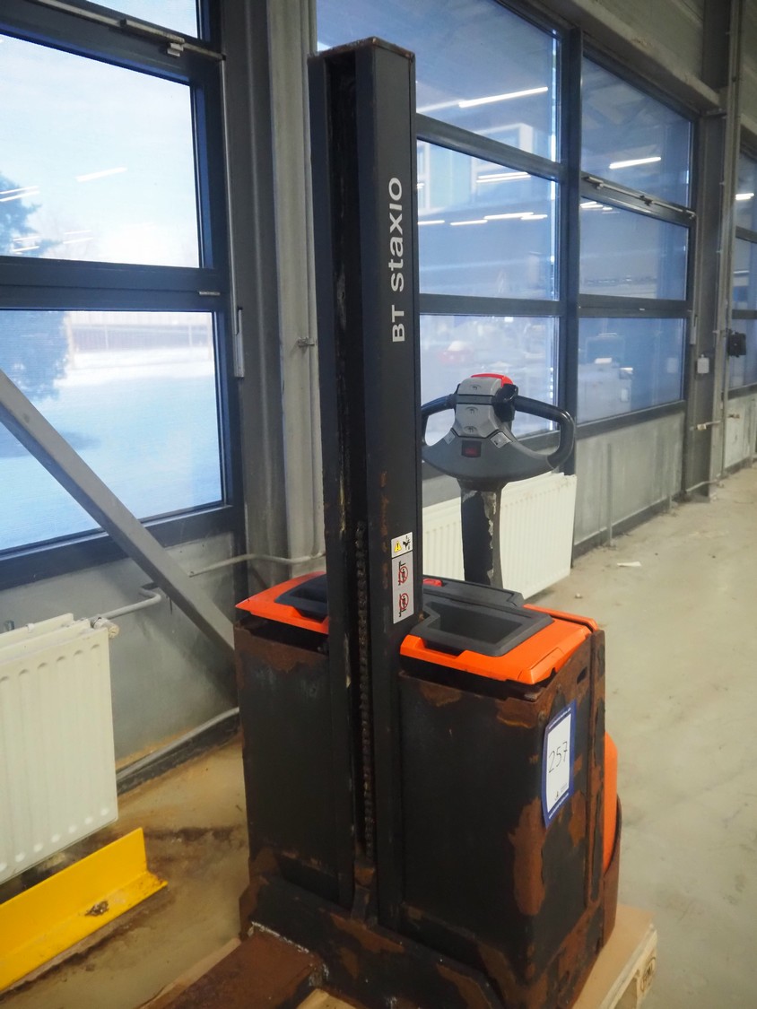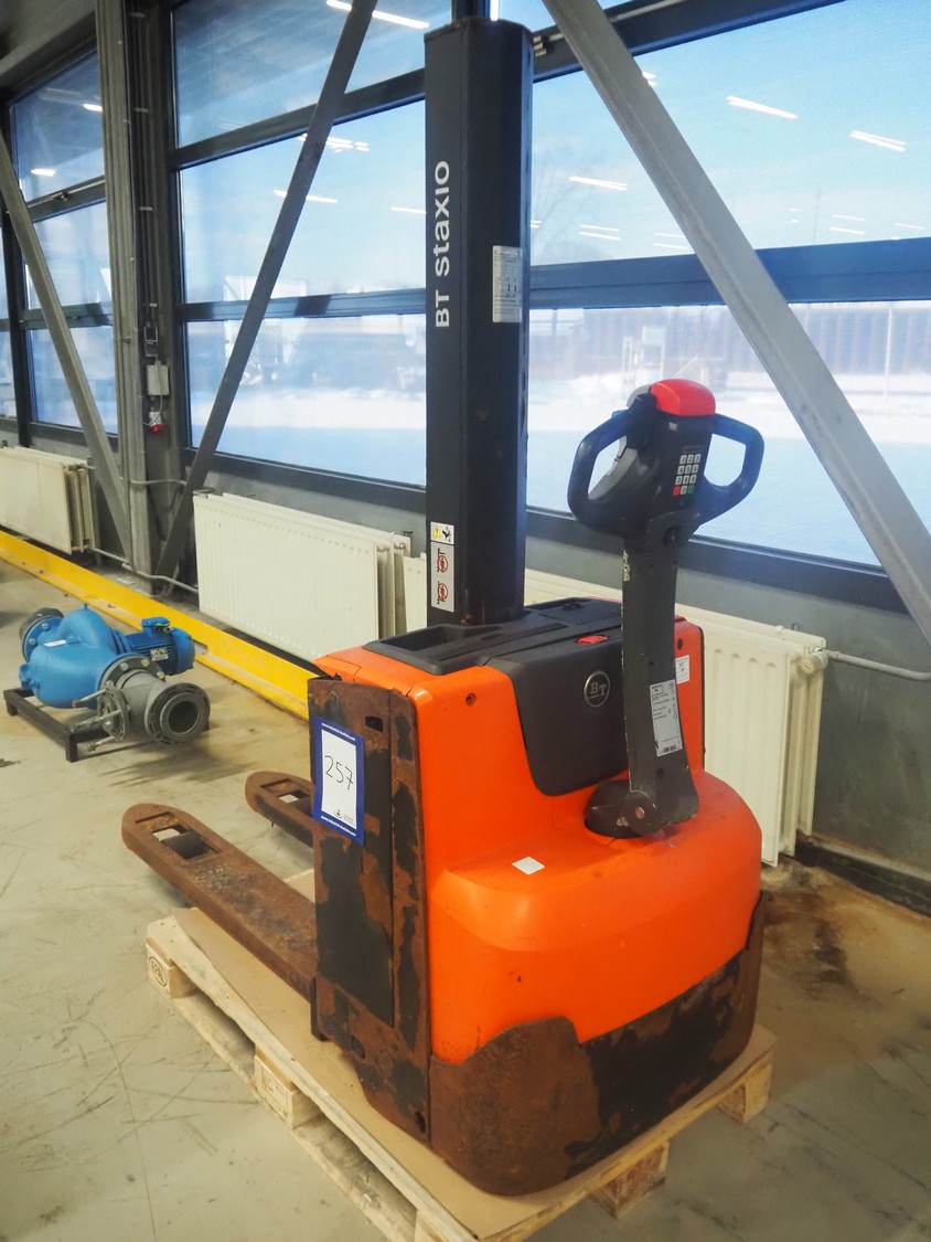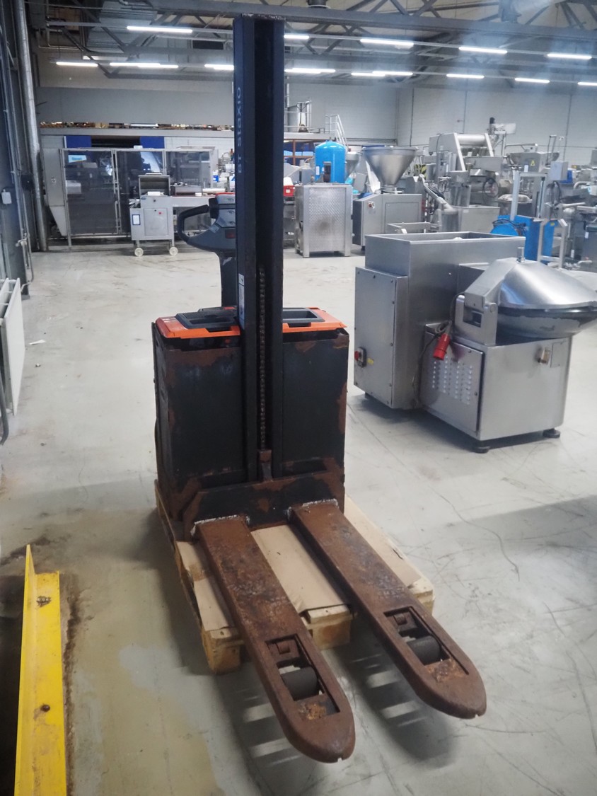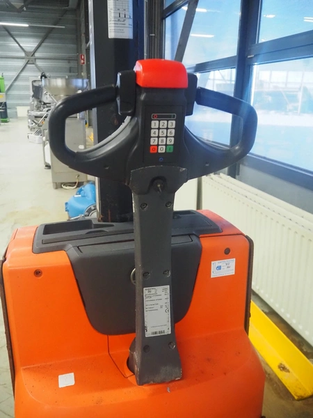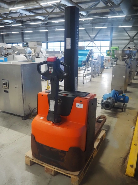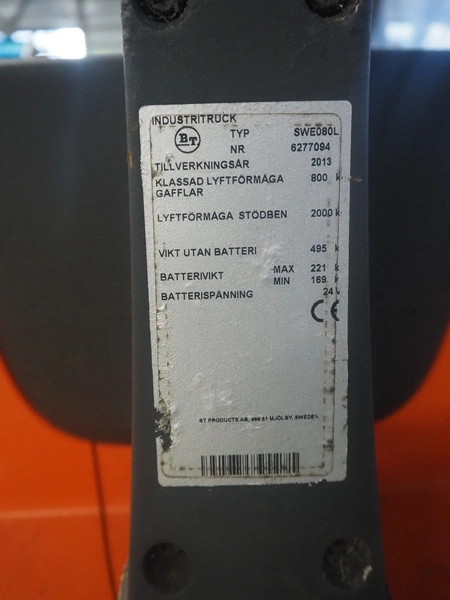 BT electric pallet lifter, type: SWE080L, number: 6277094, year of construction: 2013, capacity: 2000 kg, fork length: 1150 mm, total dimensions: 1800 mm x 750 mm x 1840 mm.