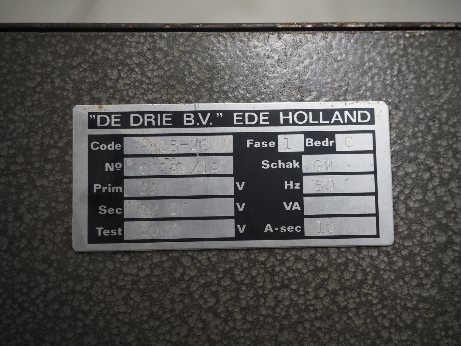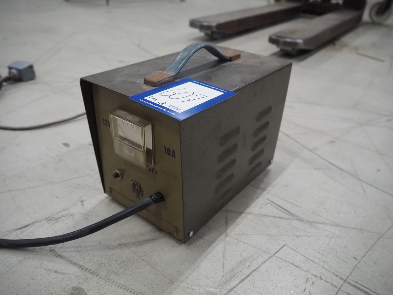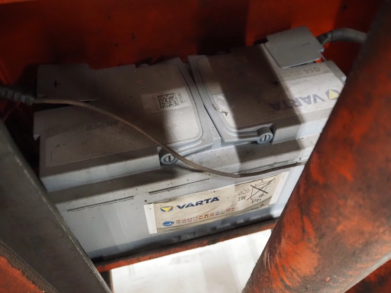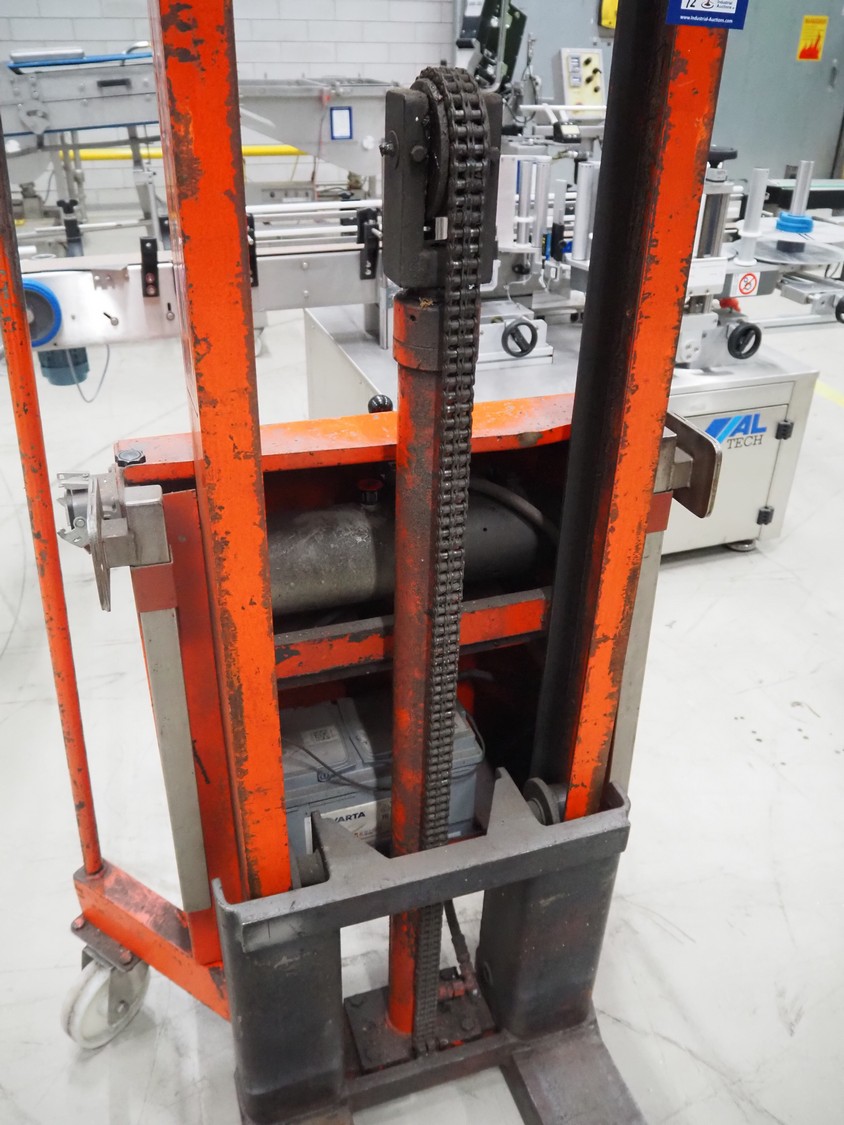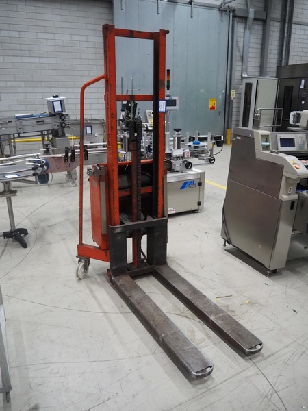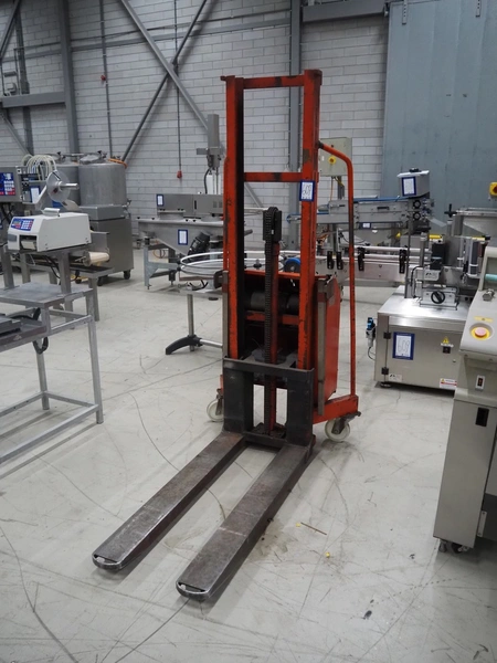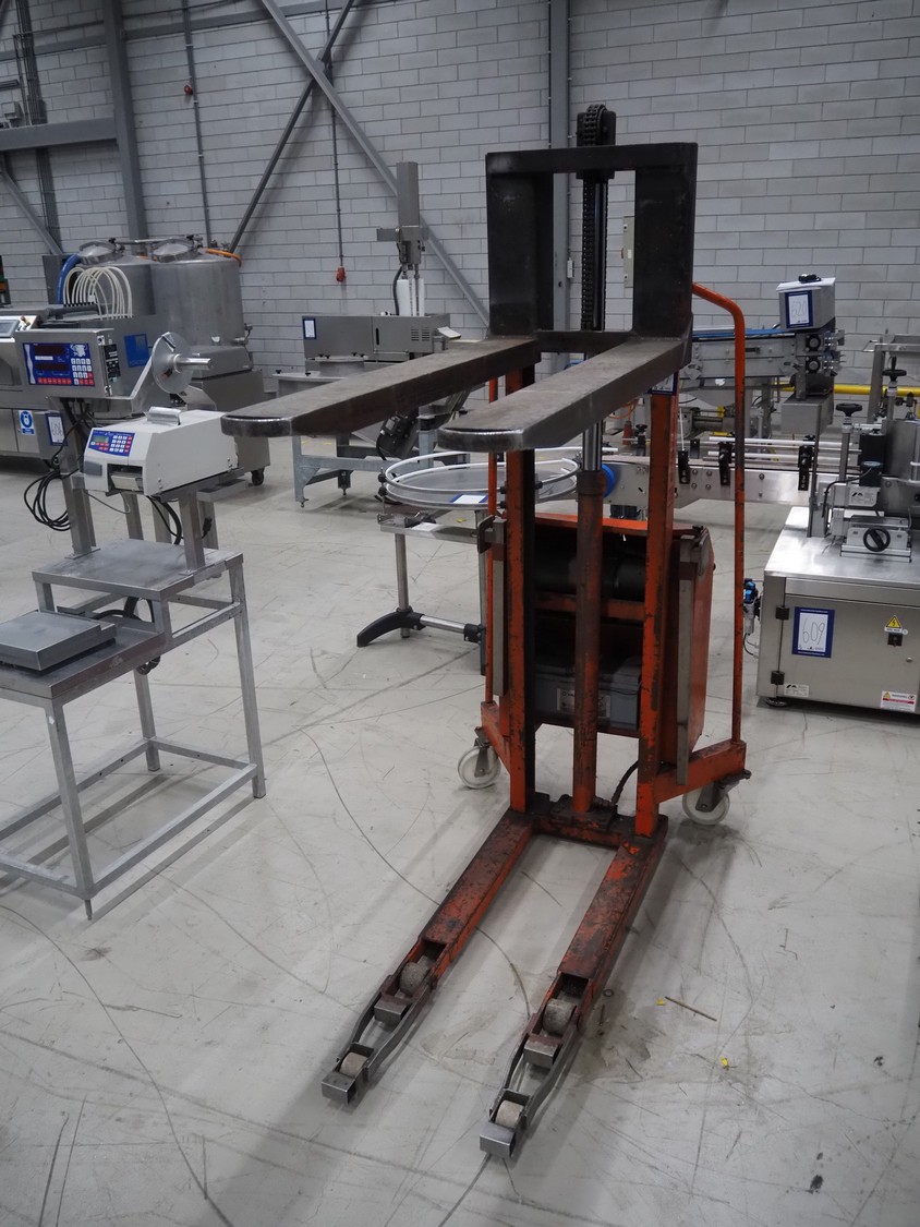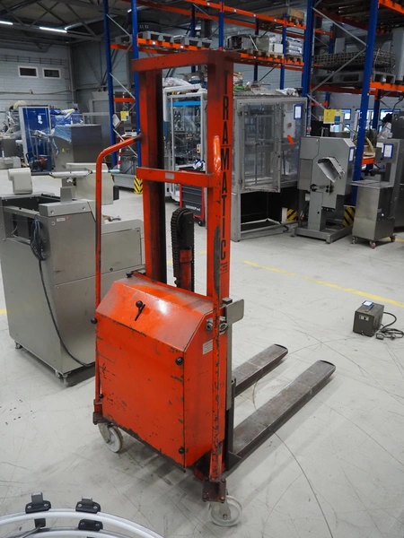 Tramatic electric pallet lifter, fork length: 1200 mm, lifting height: 1400 mm, total dimensions: 1650 mm x 900 mm x 2000 mm. Including De Drie B.V. battery charger, 220 V, 12 DC and VARTA battery.