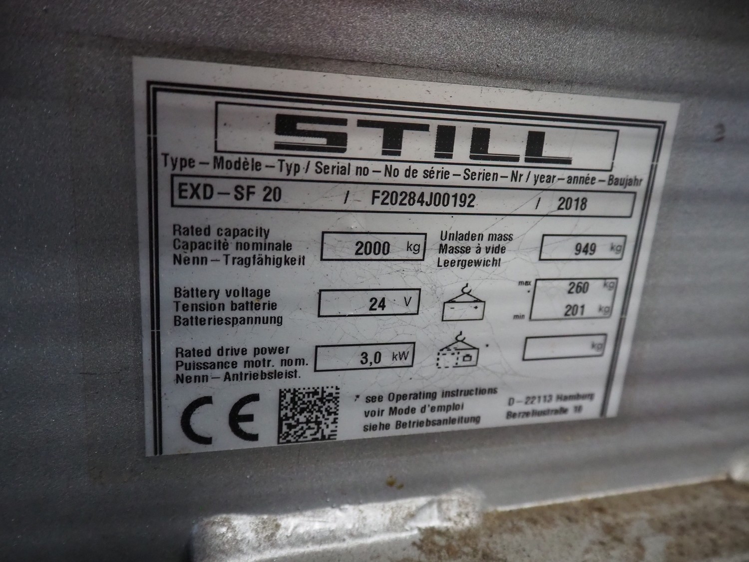 Still electric pallet lifter, type: EXD-SF 20, serial number: F20284J00192, year of construction: 2018, capacity: 2000 kg, fork length: (2x) 1150 mm, total dimensions: 2150 mm x 750 mm x 1500 mm.