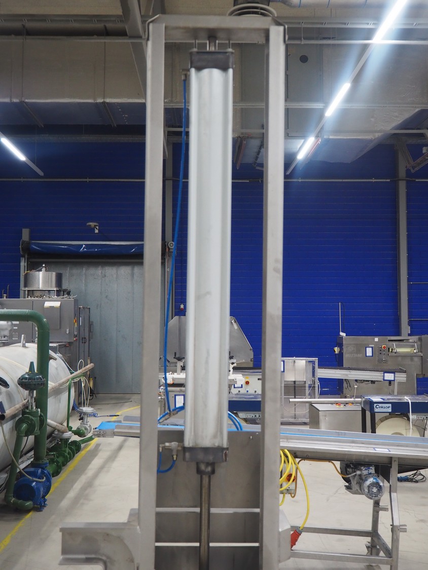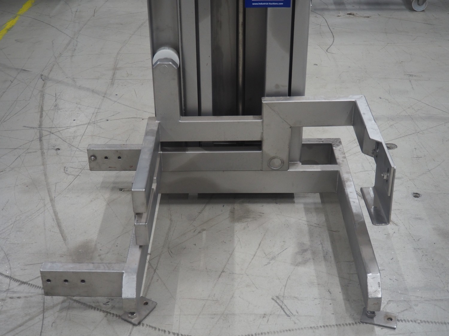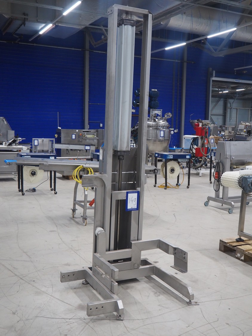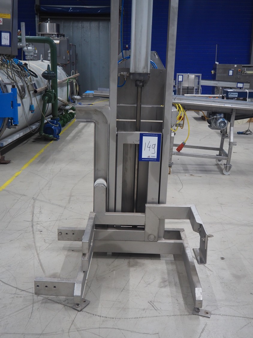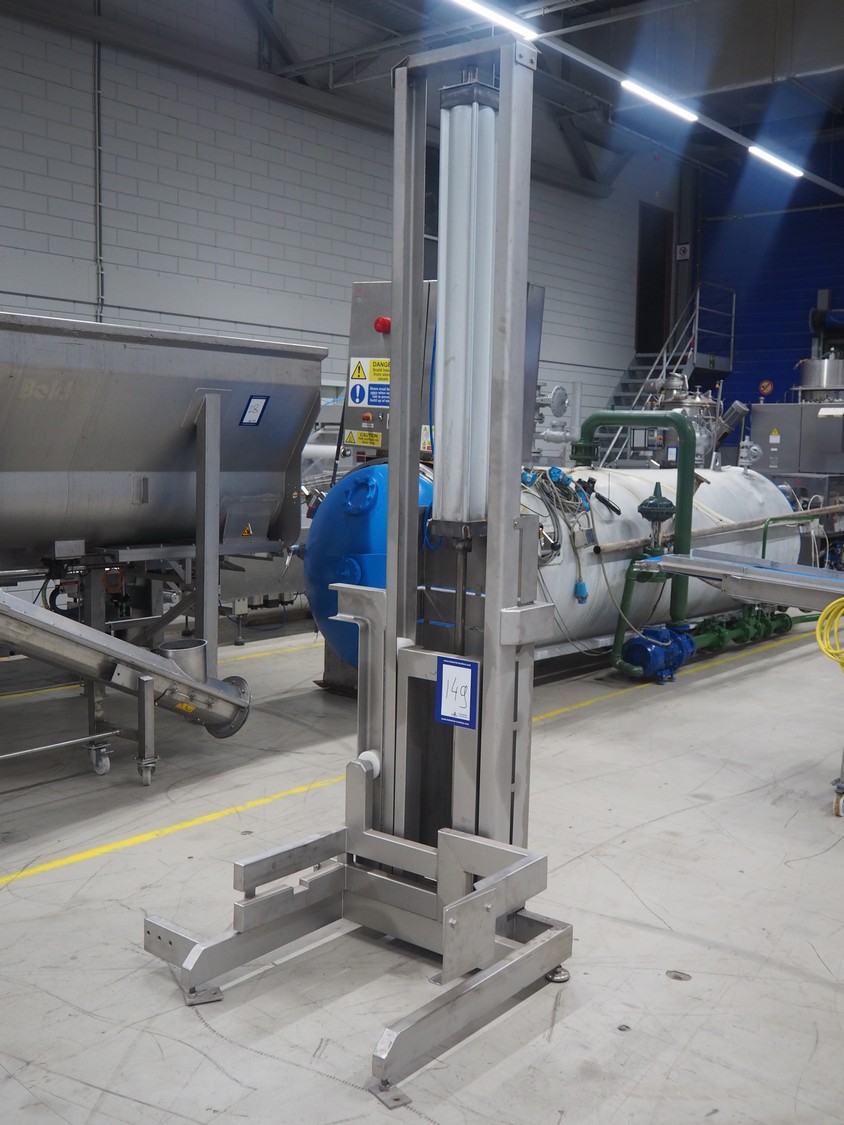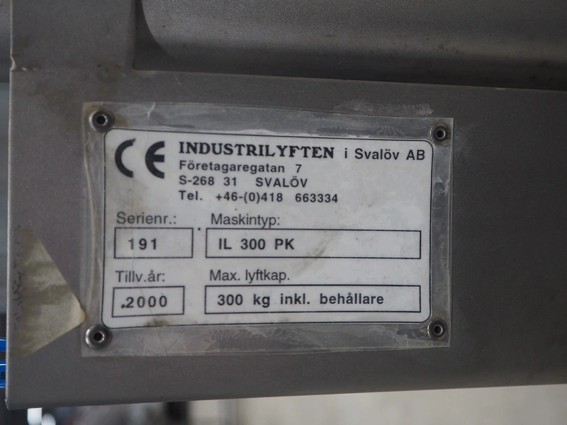 Industrilyften lifter for 200 liter meat bins, type: IL 300 PK, serial number: 191, year of construction: 2000, maximum capacity: 300 kg, lifting height: 1000 mm, total dimensions: 1000 mm x 840 mm x 2620 mm.