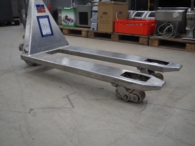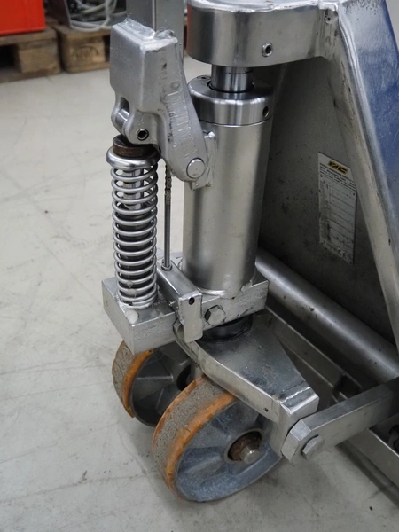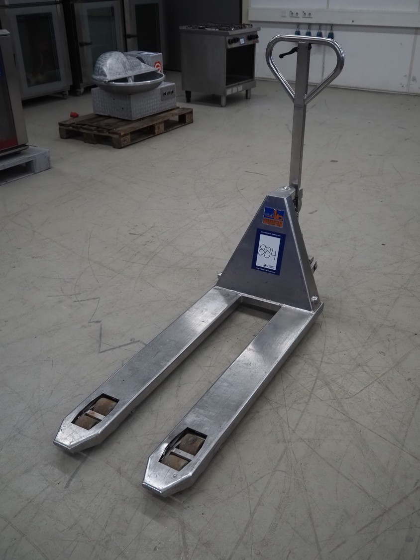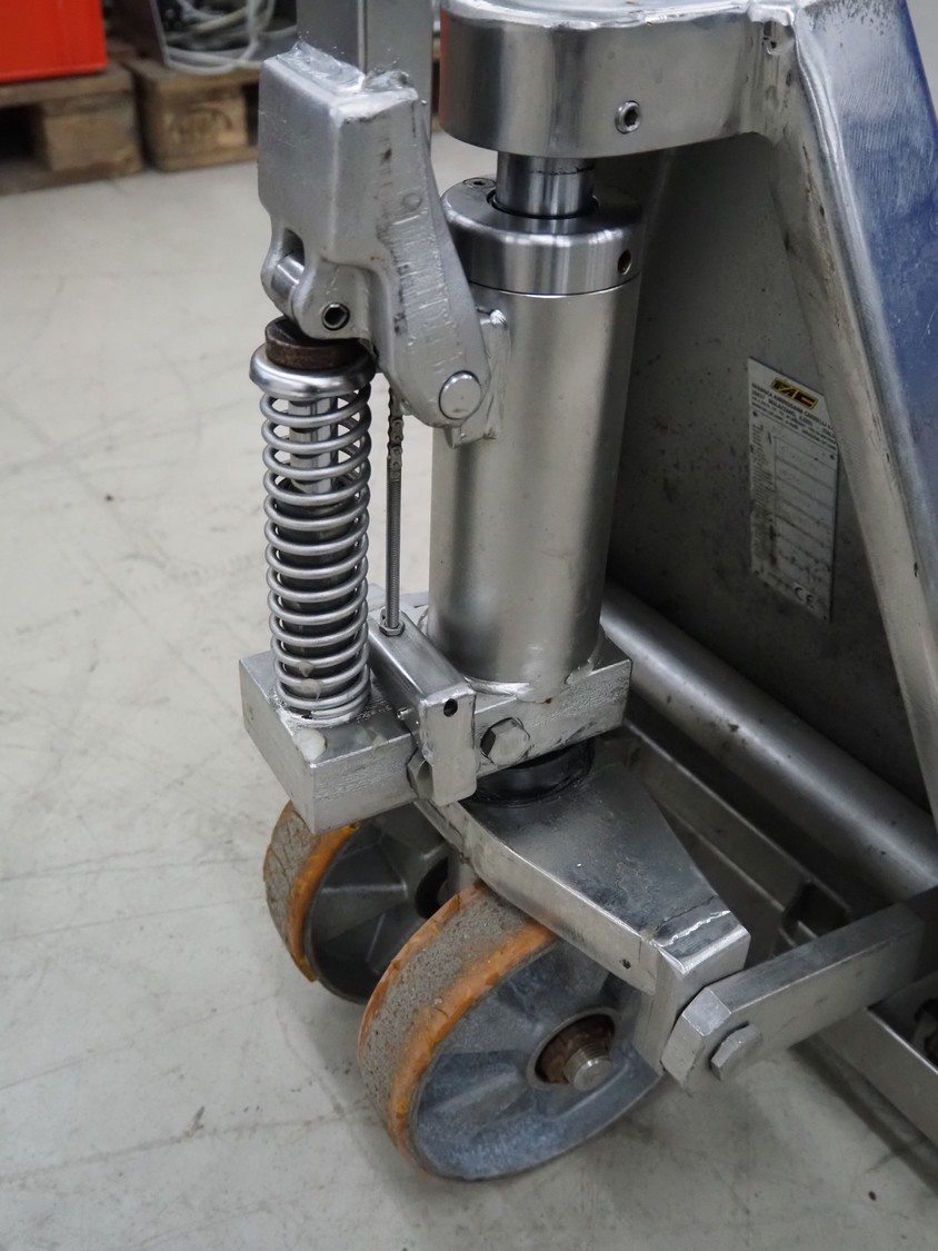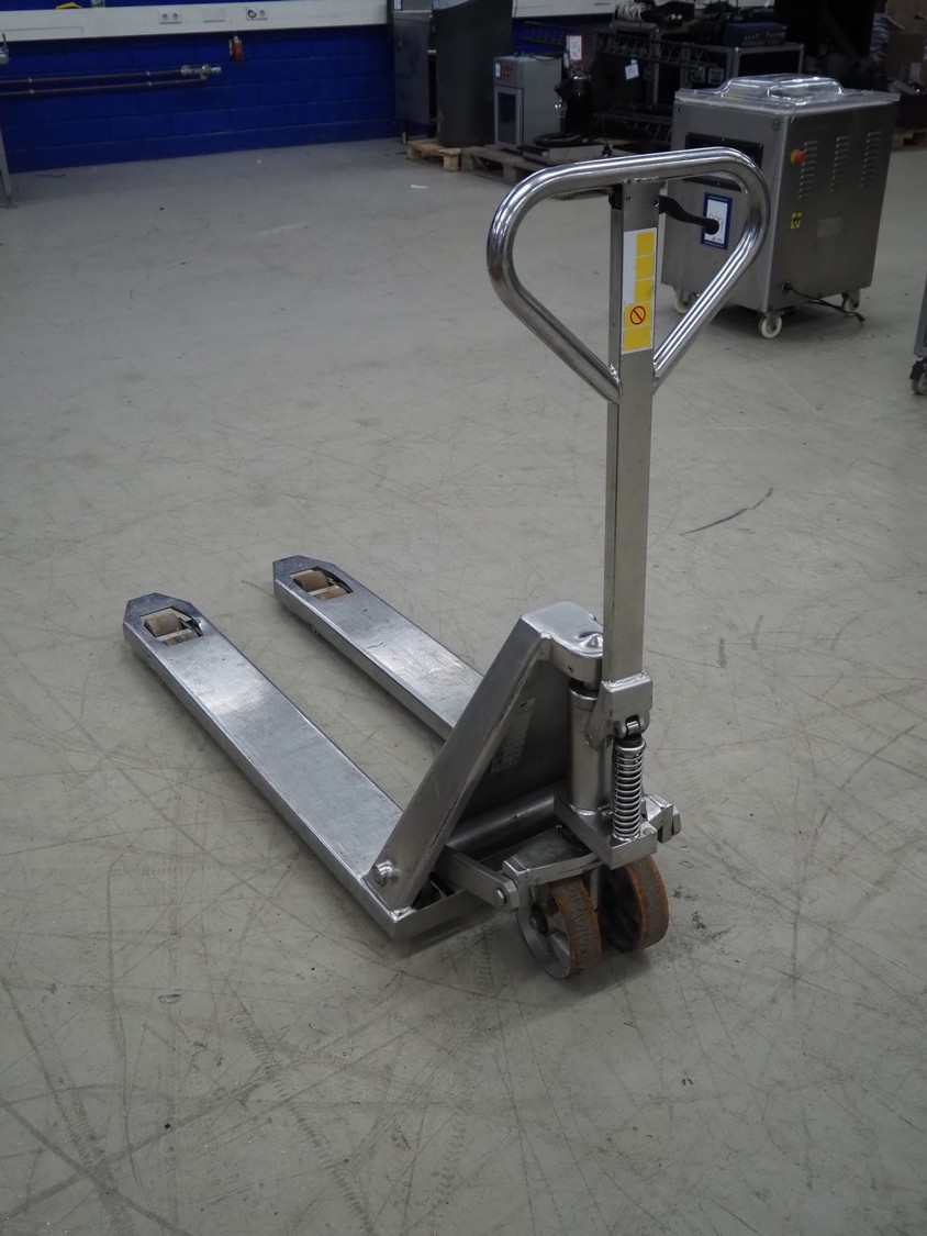 Carelli s.r.l. s/s pallet lifter, model: K9 INOX / 20, serial number: 08F00149, year of construction: 2008, capacity: 2000 kg, fork length: 1150 mm, total dimensions: 1450 mm x 540 mm x 1220 mm.
