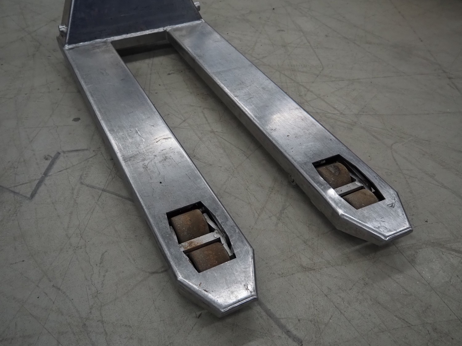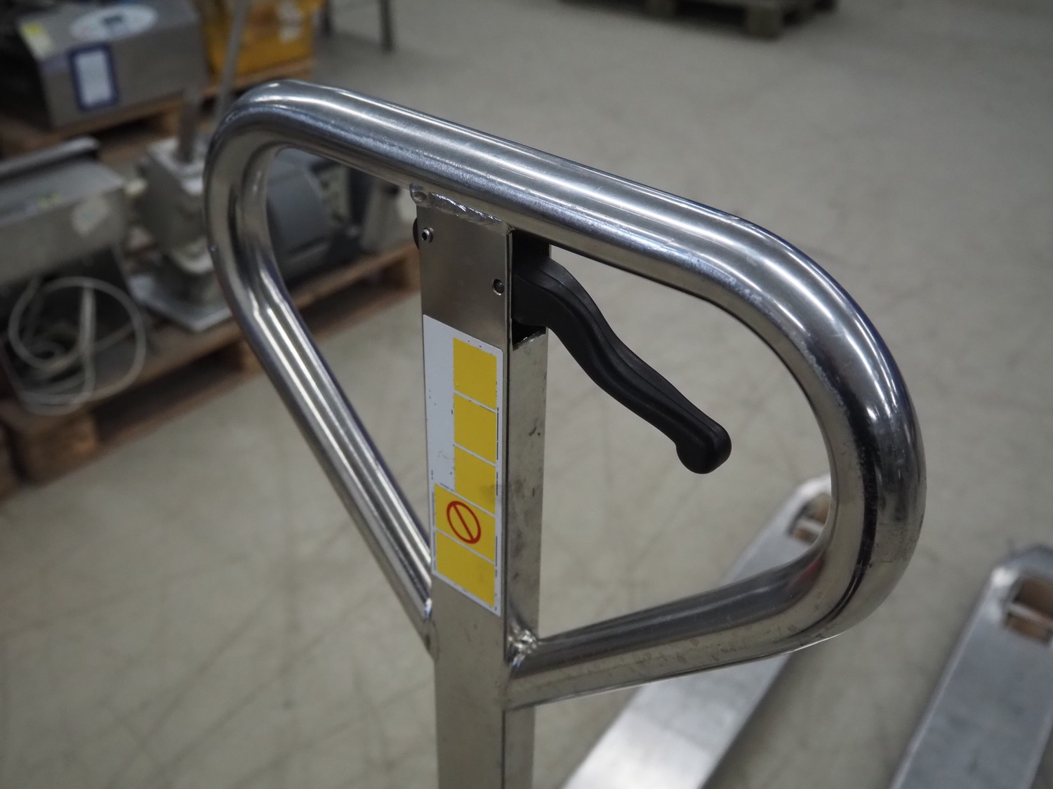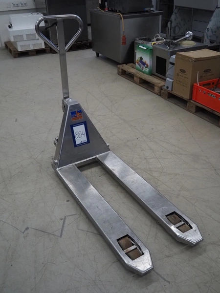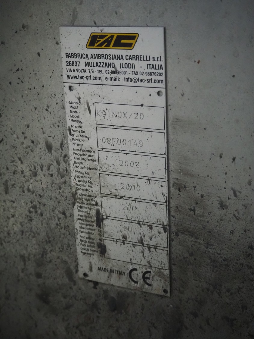 Carelli s.r.l. s/s pallet lifter, model: K9 INOX / 20, serial number: 08F00149, year of construction: 2008, capacity: 2000 kg, fork length: 1150 mm, total dimensions: 1450 mm x 540 mm x 1220 mm.