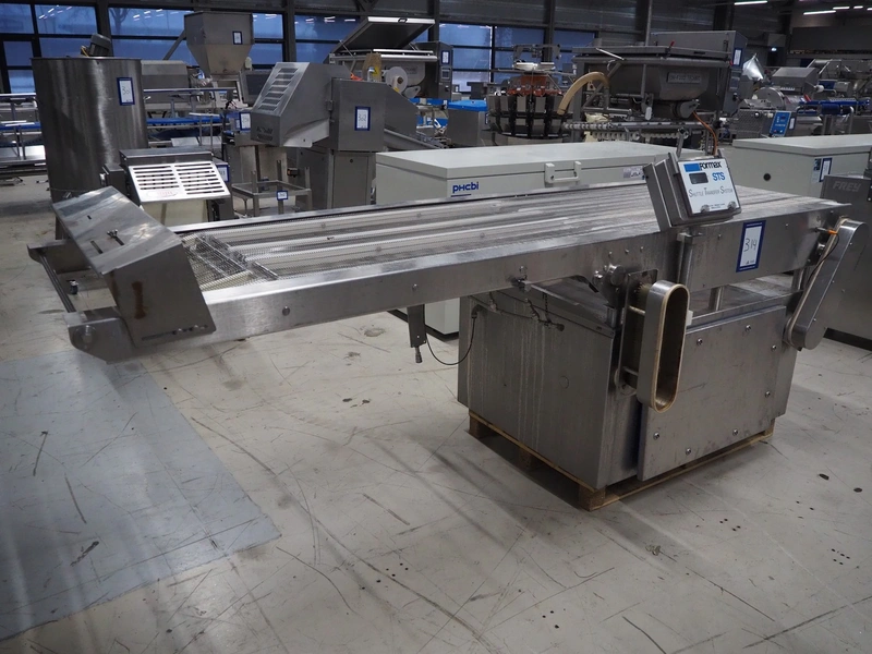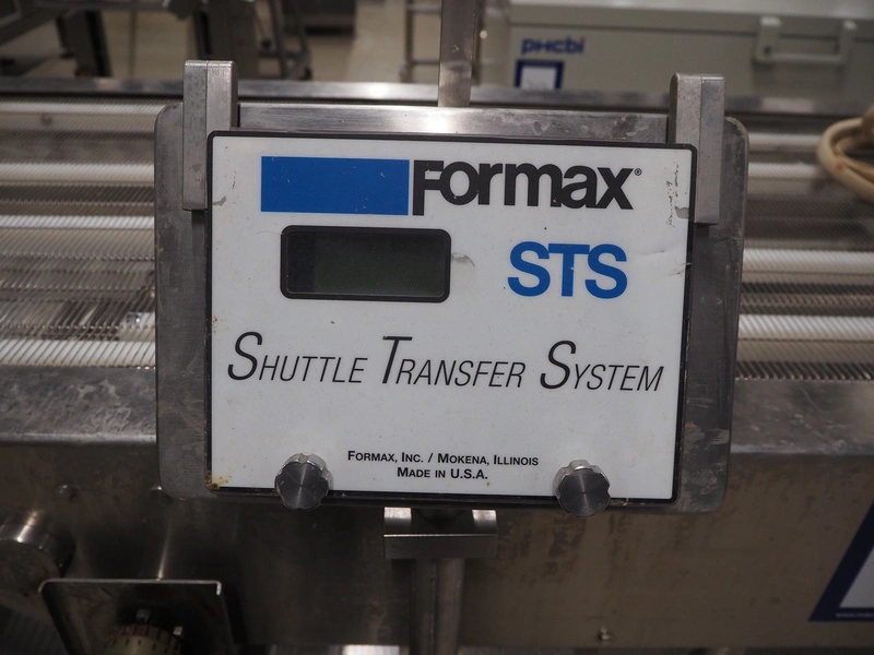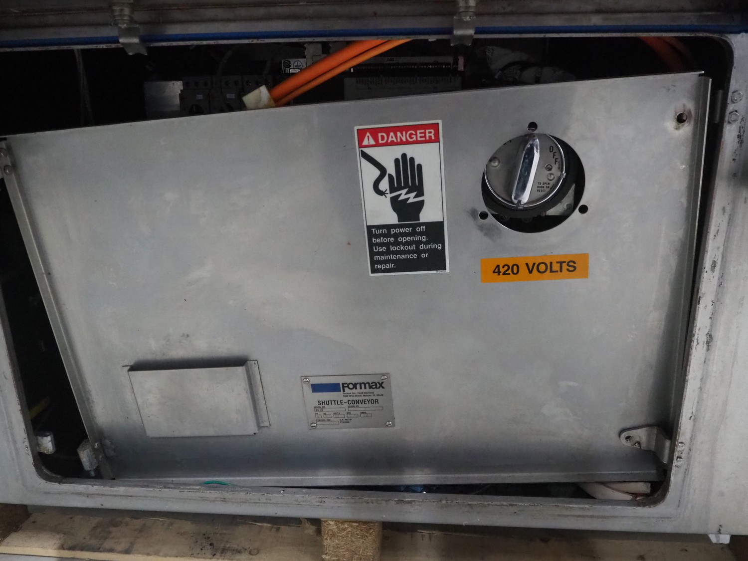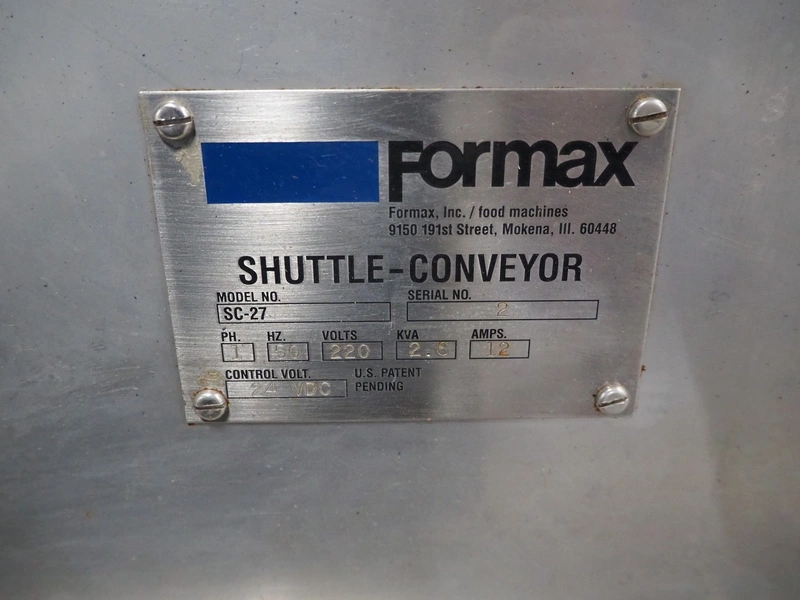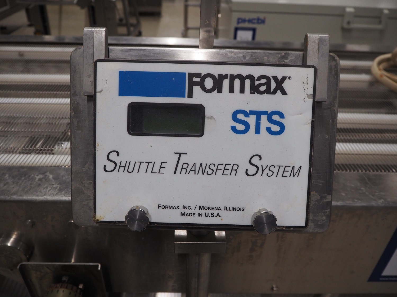 Formax shuttle conveyor, model: STS, serial number: 2, year of construction: 2001, 220 V, 50 Hz, 2.6 kVA, s/s belt, belt width: 740 mm, clearance: 740 mm x 50 mm, total dimensions: 3150 mm x 1100 mm x 1520 mm.