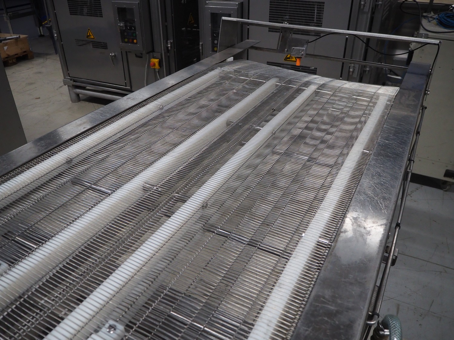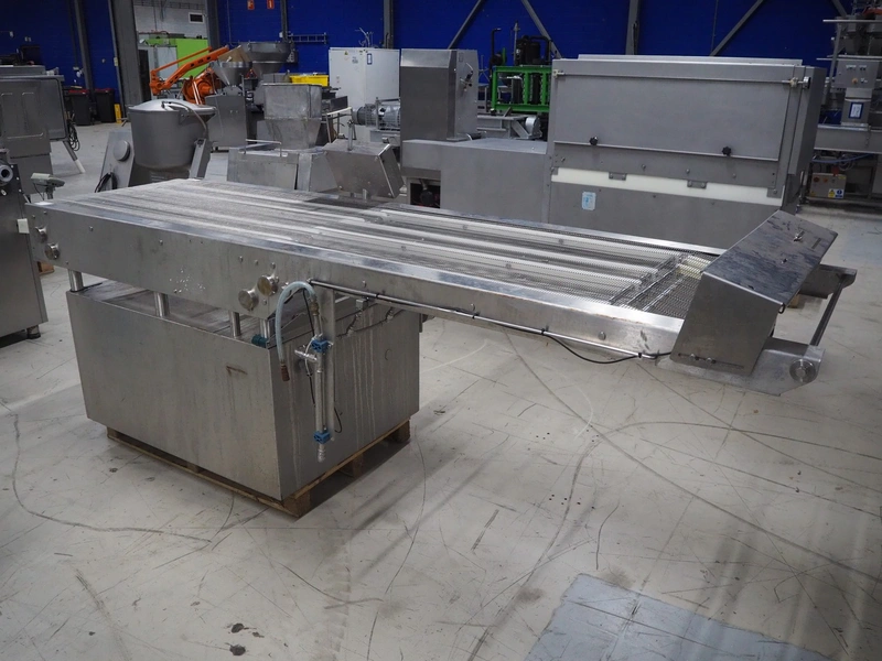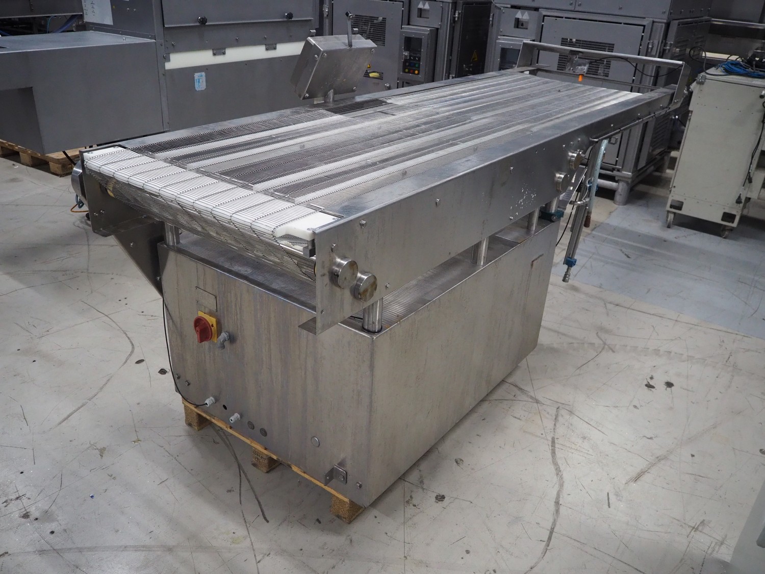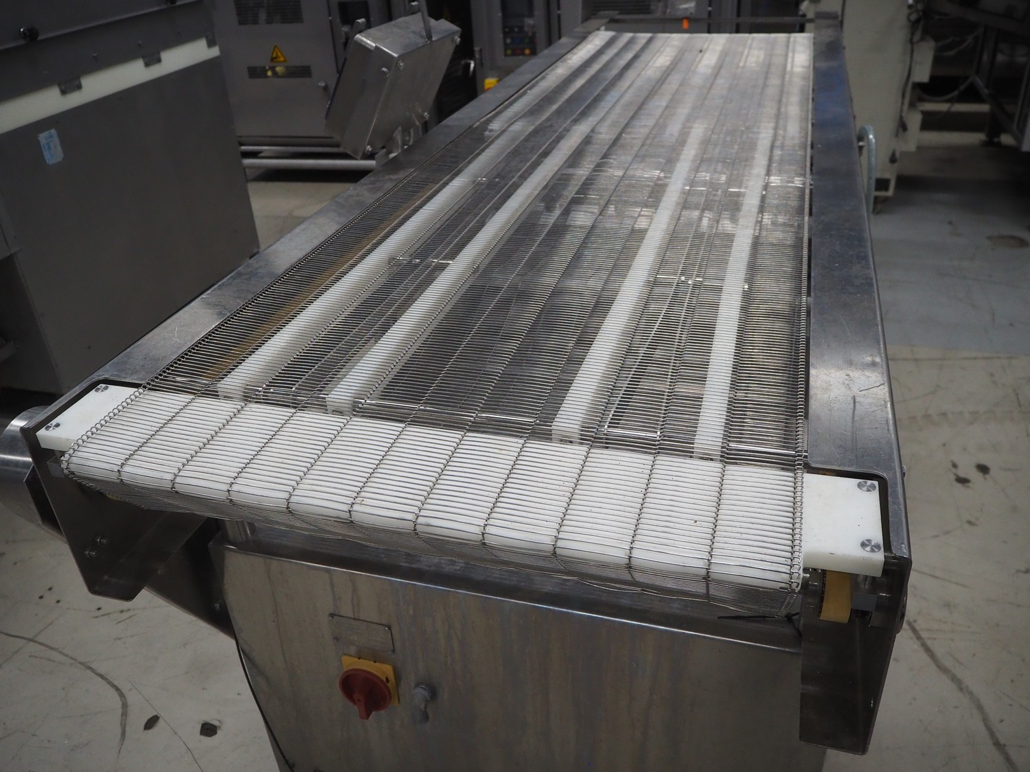 Formax shuttle conveyor, model: STS, serial number: 2, year of construction: 2001, 220 V, 50 Hz, 2.6 kVA, s/s belt, belt width: 740 mm, clearance: 740 mm x 50 mm, total dimensions: 3150 mm x 1100 mm x 1520 mm.