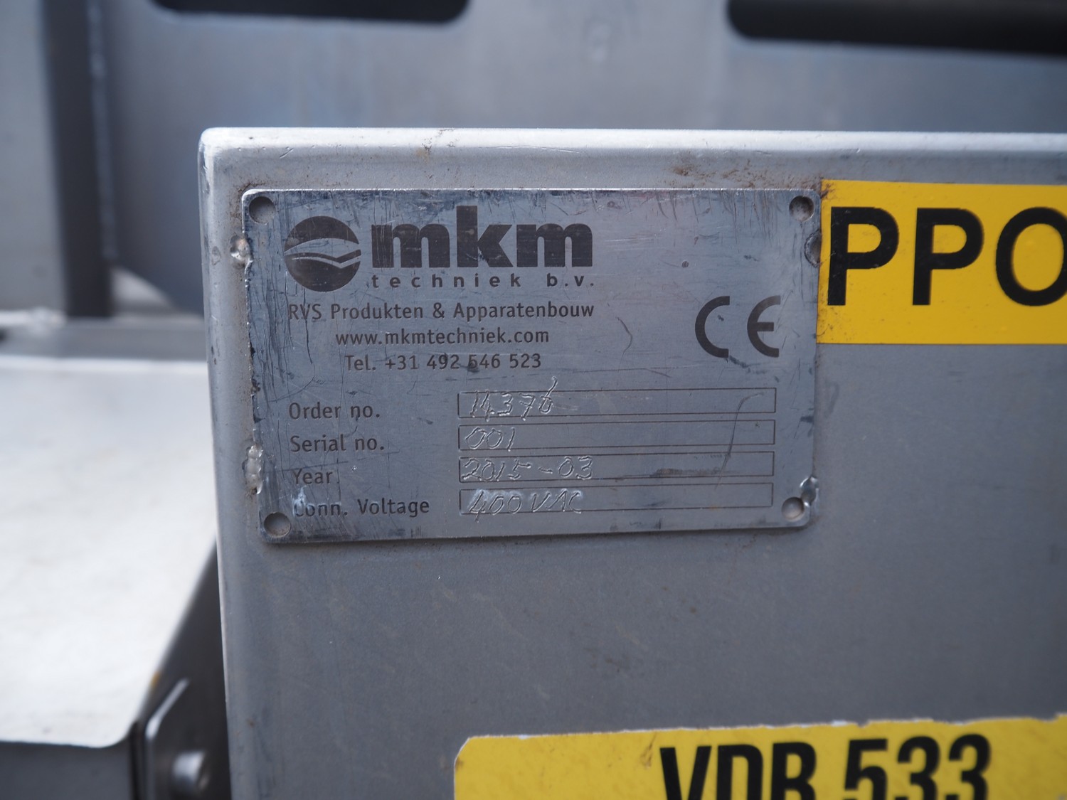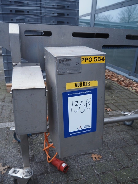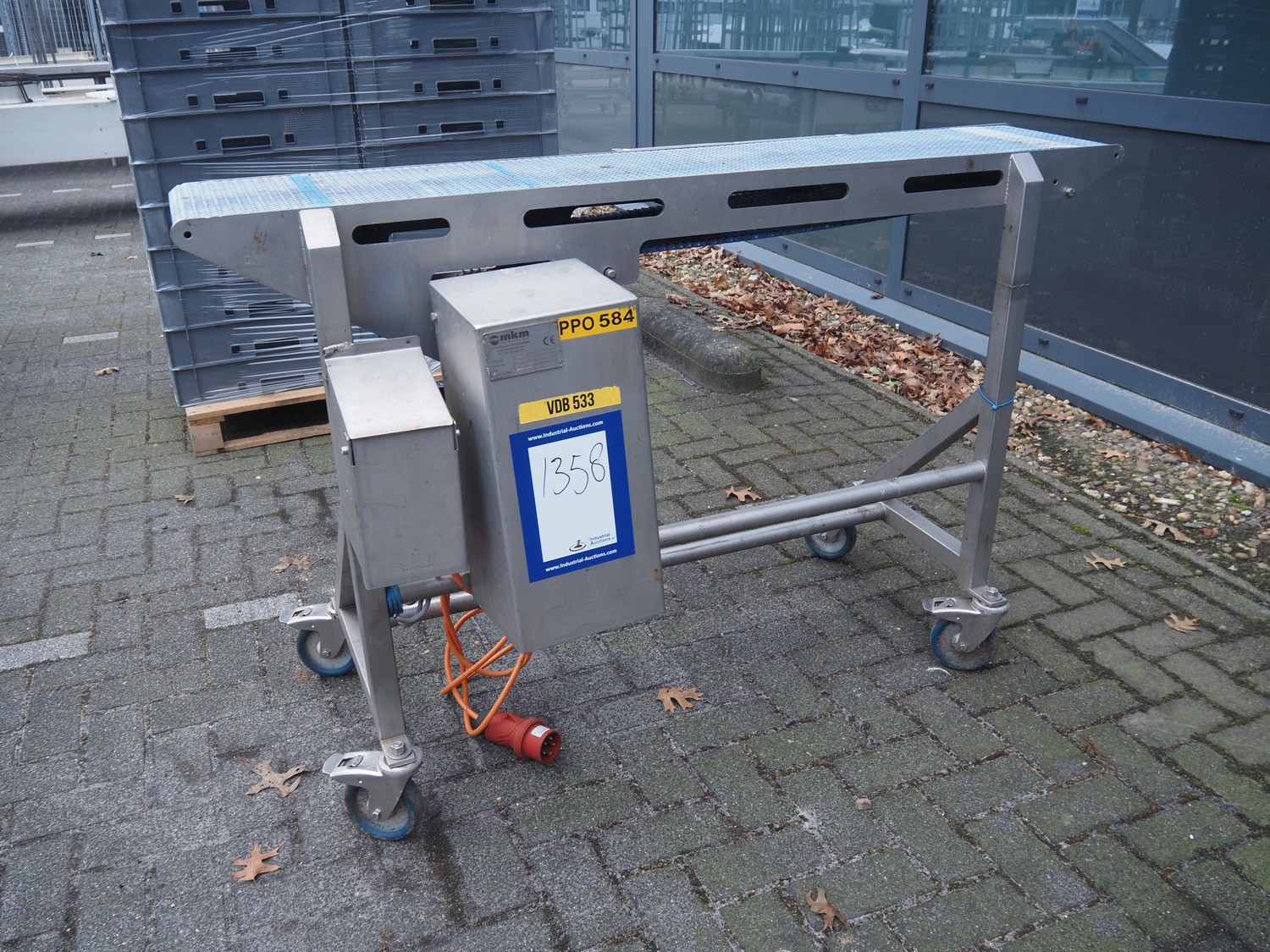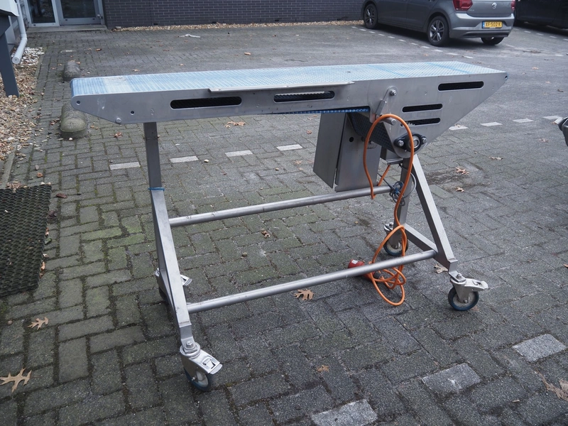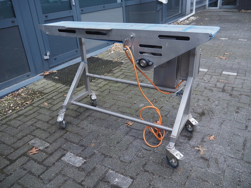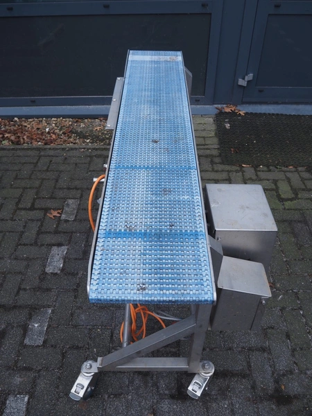 MKM mobile transport belt, serial number: 001, year of construction: 2015-03, 400 V, plastic belt, belt width: 260 mm, total dimensions: 1500 mm x 550 mm x 950 mm.