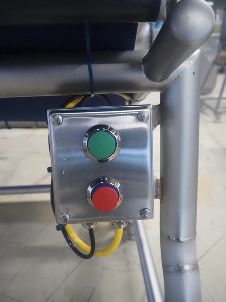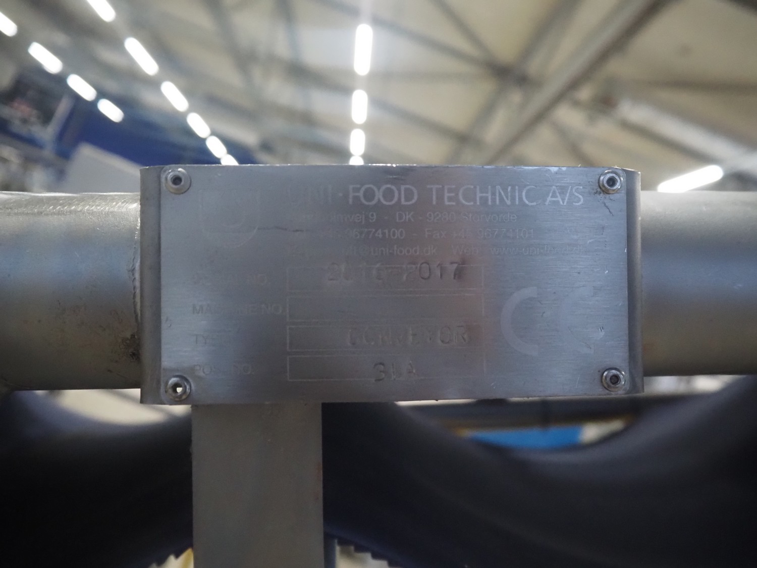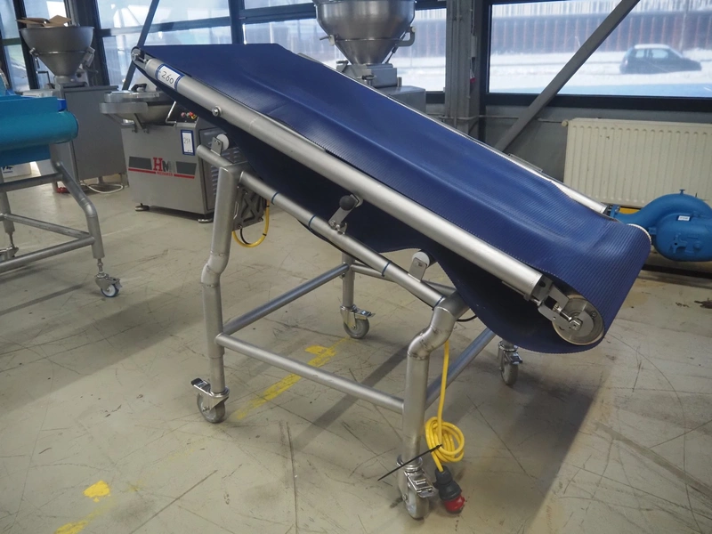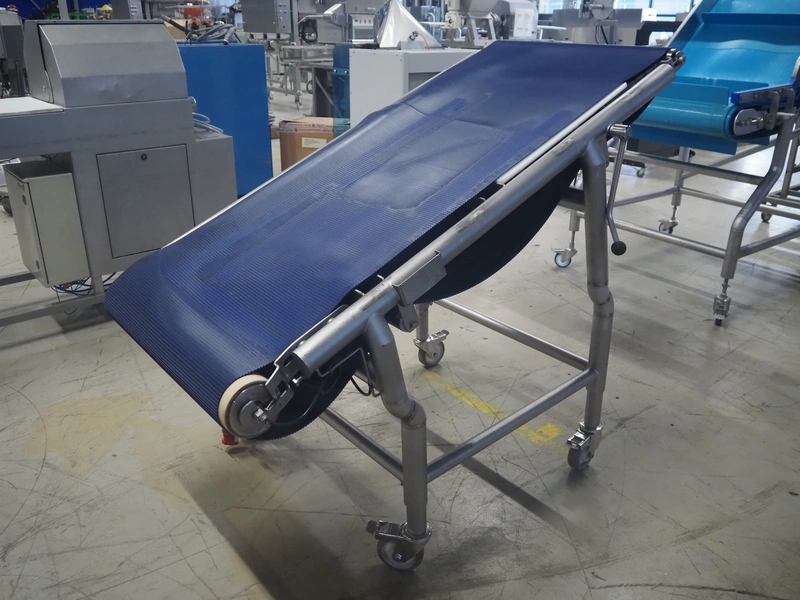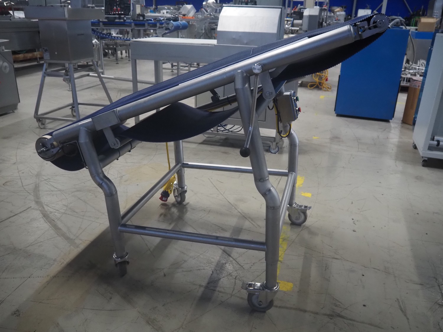 Food Technik mobile elevating belt, s/s frame, plastic belt, belt width: 700 mm, elevating height: 1300 mm, total dimensions: 1600 mm x 980 mm x 1300 mm.