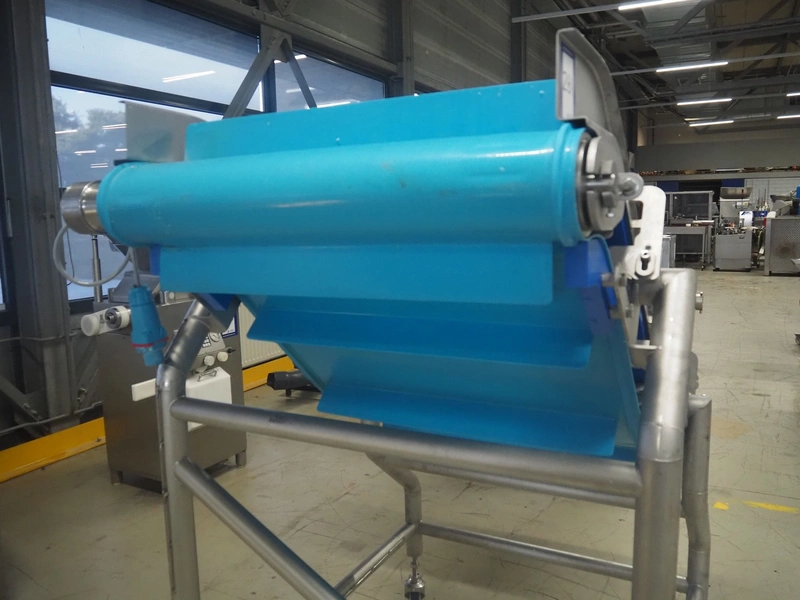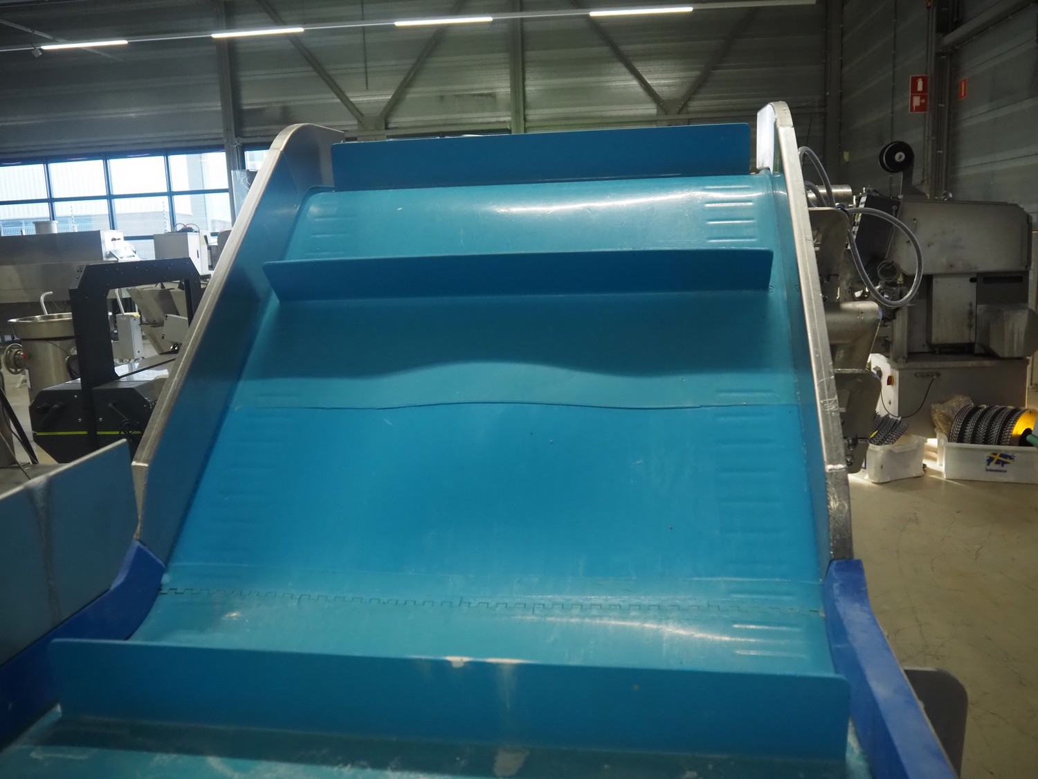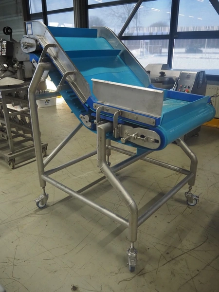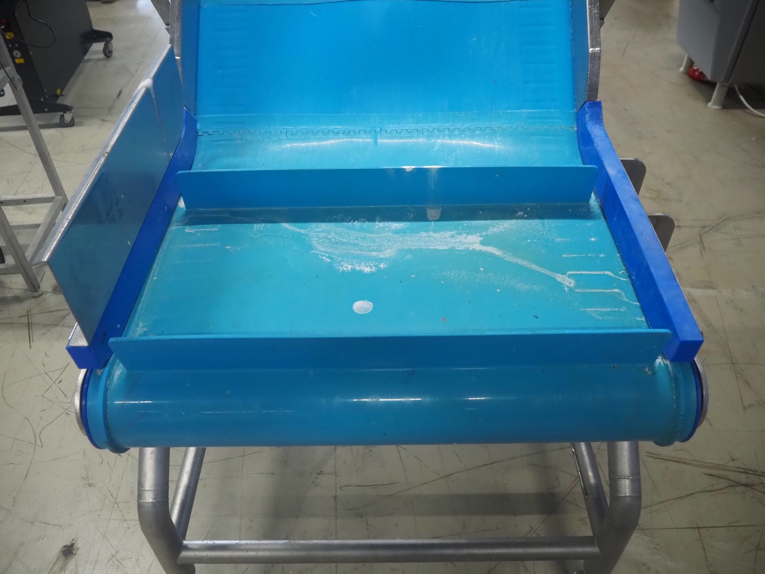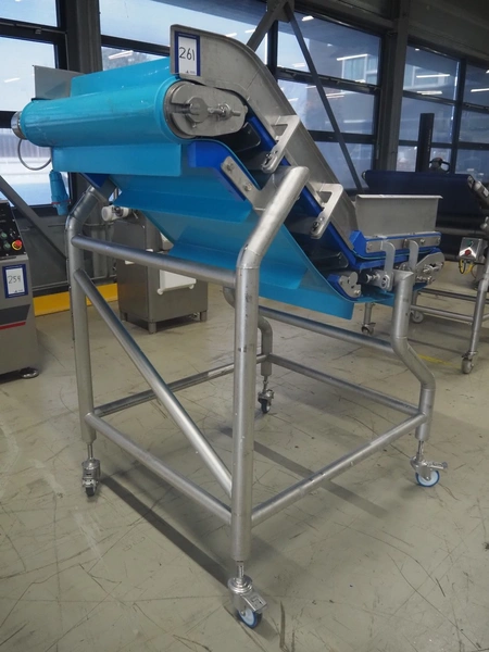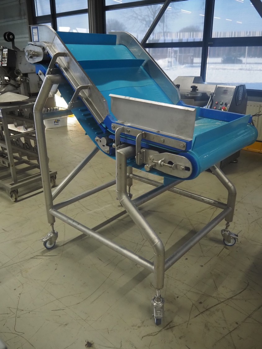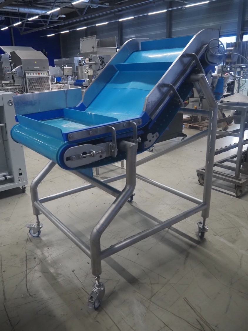 Mobile elevating belt, s/s frame, plastic belt with dividers, belt width: 800 mm, divider height: 80 mm, distance between dividers: 370 mm, elevating height: 1500 mm, total dimensions: 1500 mm x 1000 mm x 1670 mm.