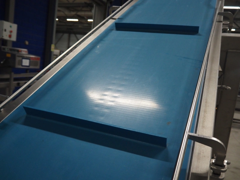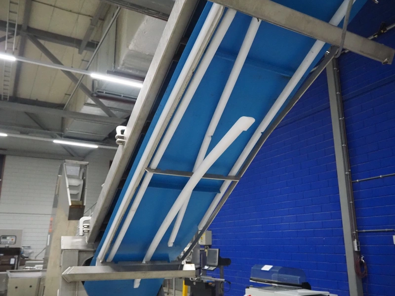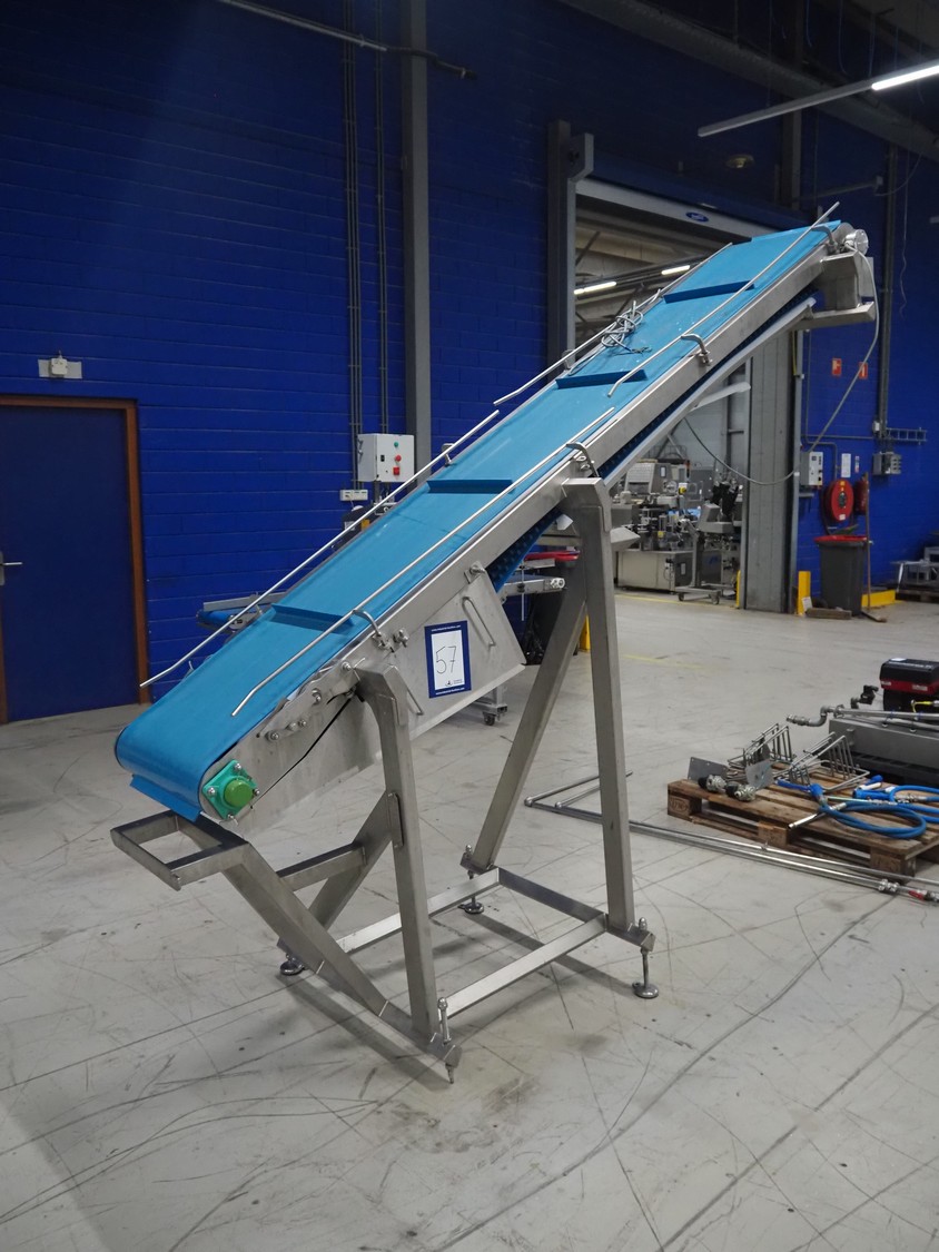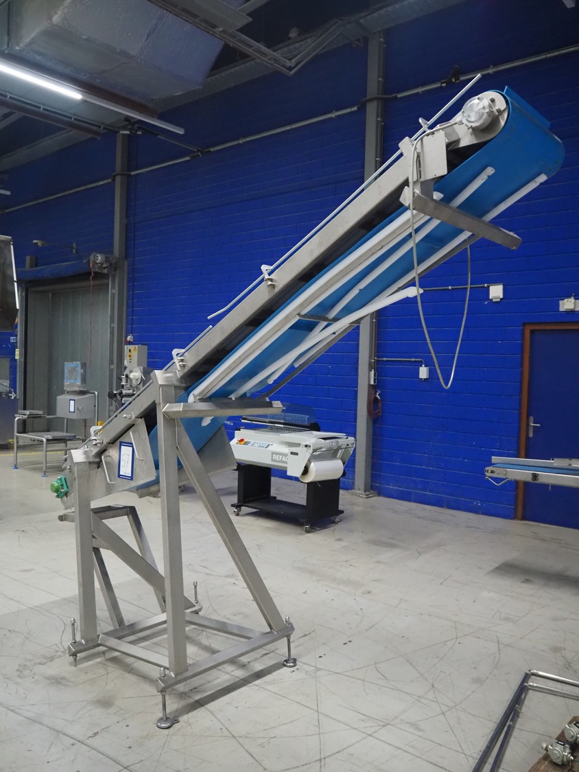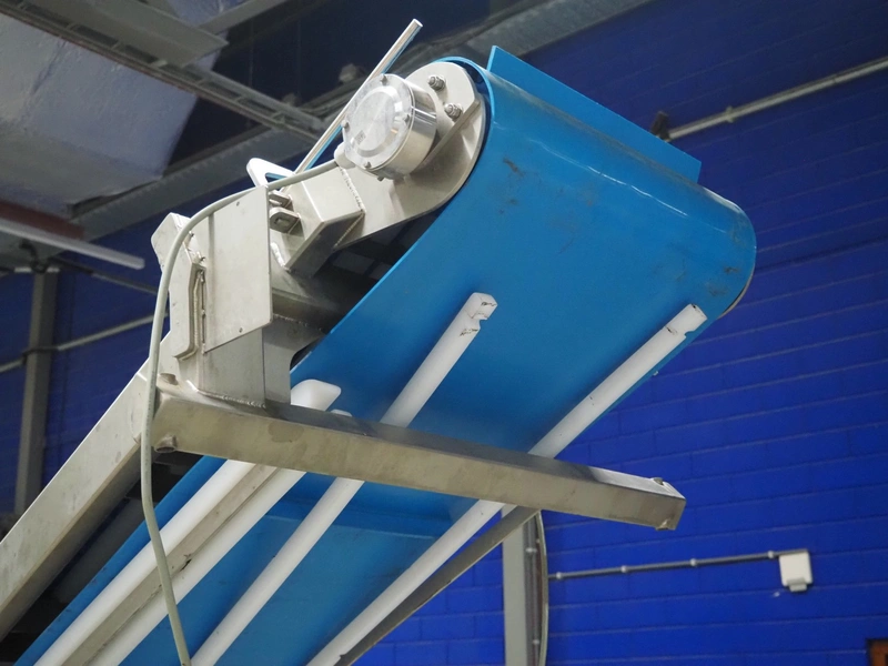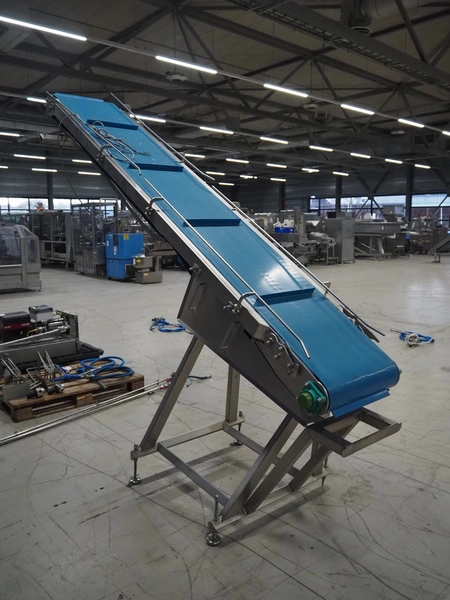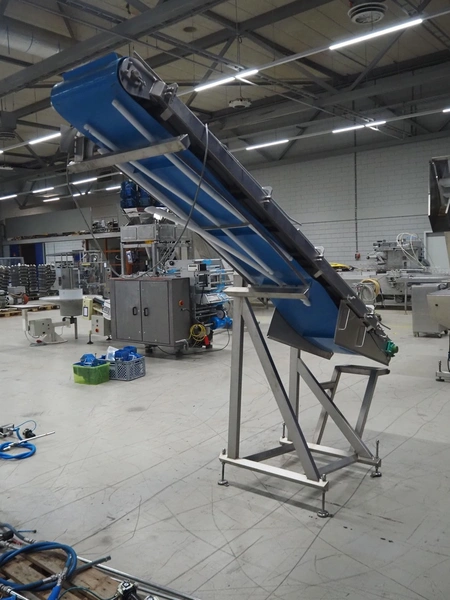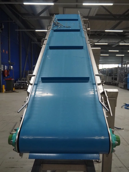 Elevating belt, plastic belt with dividers, belt width: 500 mm, divider height: 30 mm, distance between dividers: 656 mm, elevating height: 2550 mm, total dimensions: 2850 mm x 900 mm x 2600 mm.