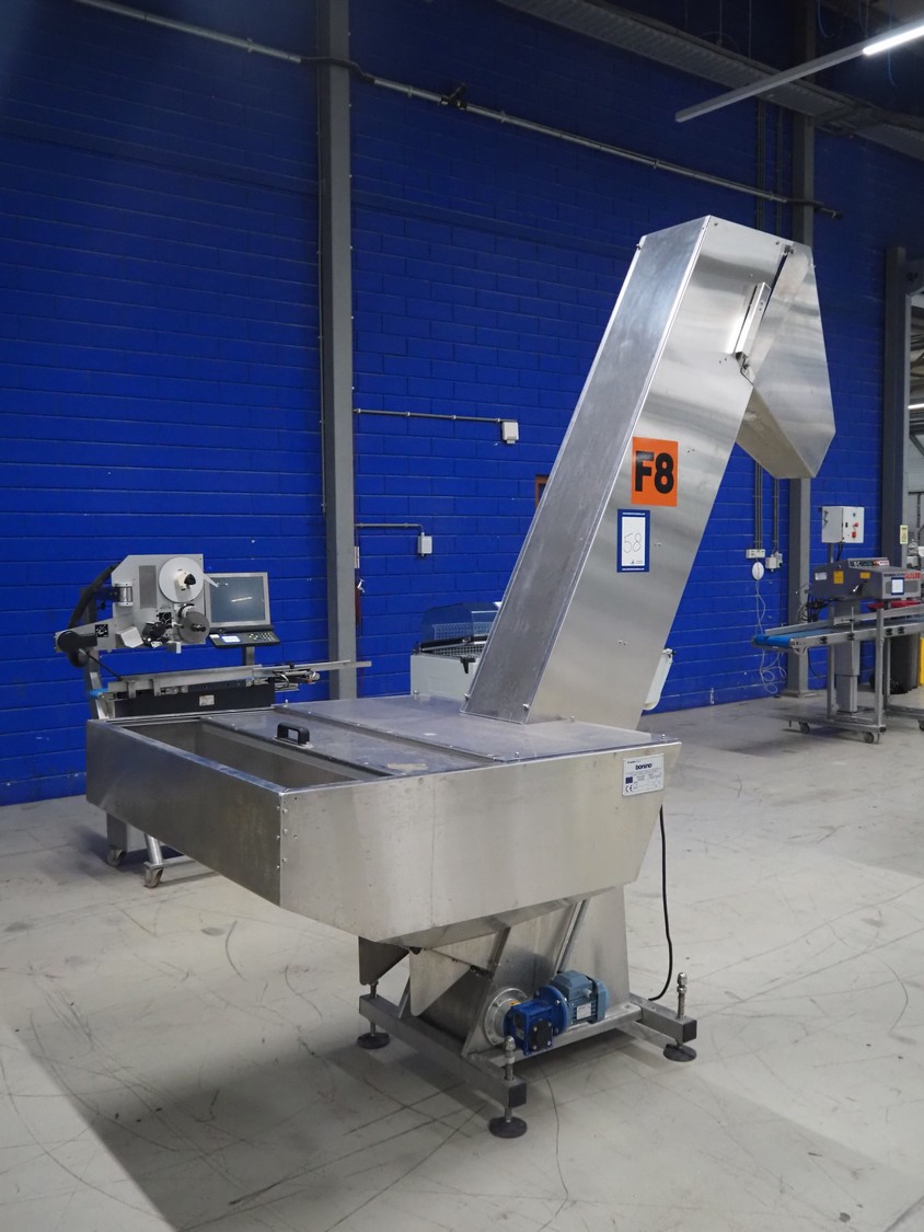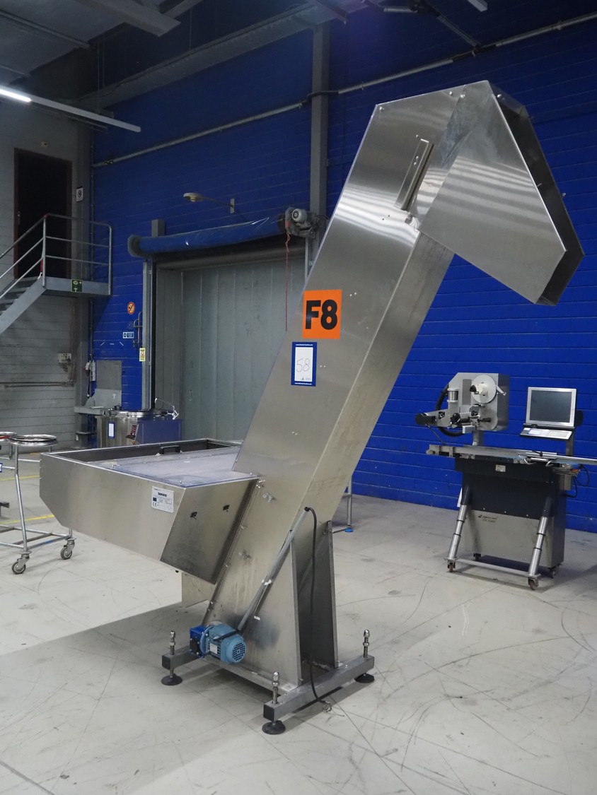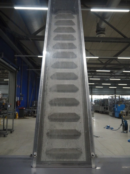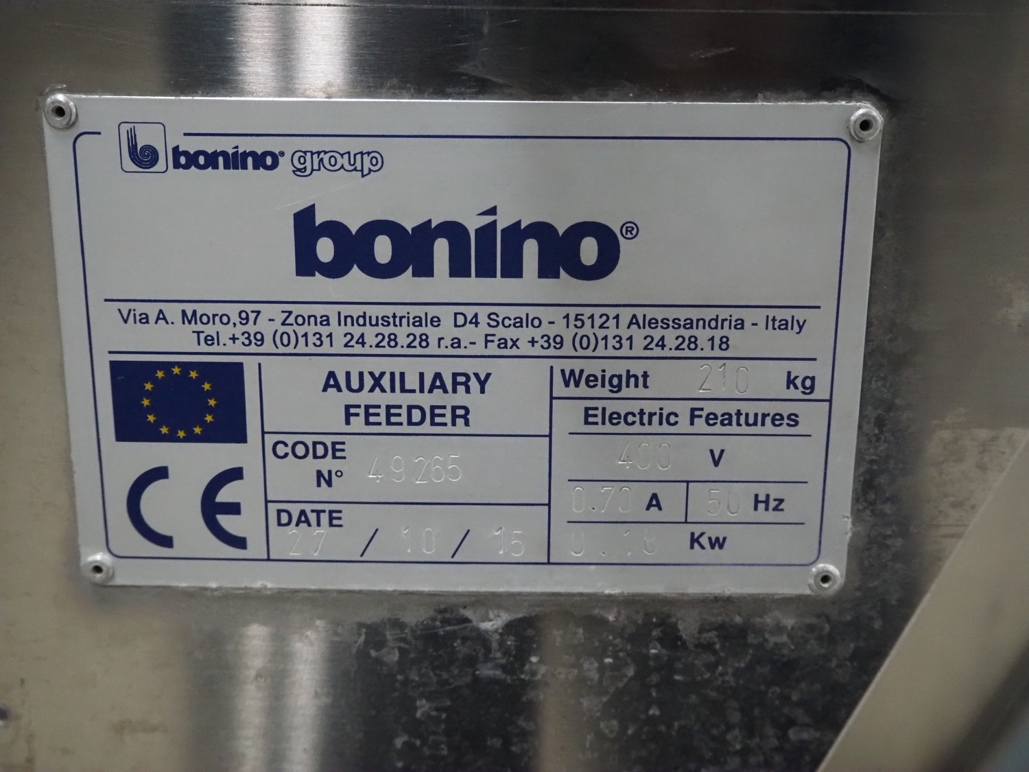 Bonino cap feeding conveyor, serial number: 49265, year of construction: 2015, 400 V, 50 Hz, 0.7 A, 0.18 kW, weight: 210 kg, plastic belt with dividers: 300 mm, divider height: 50 mm, distance between dividers: 125 mm, elevating height: 2450 mm, total dimensions: 2700 mm x 1200 mm x 2650 mm.