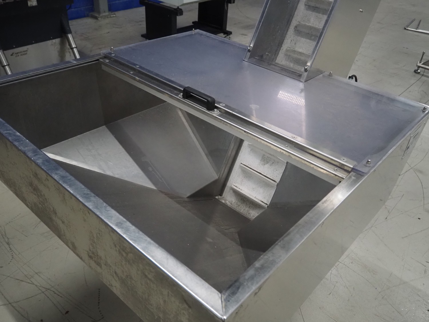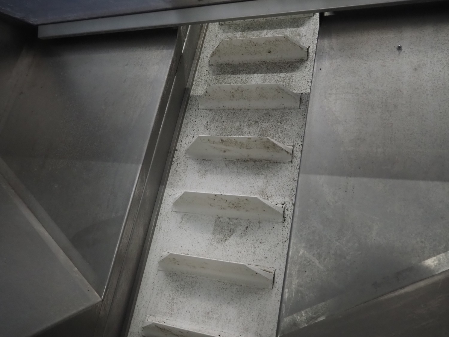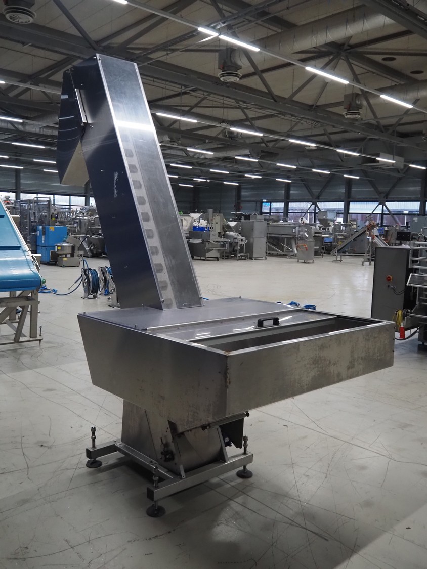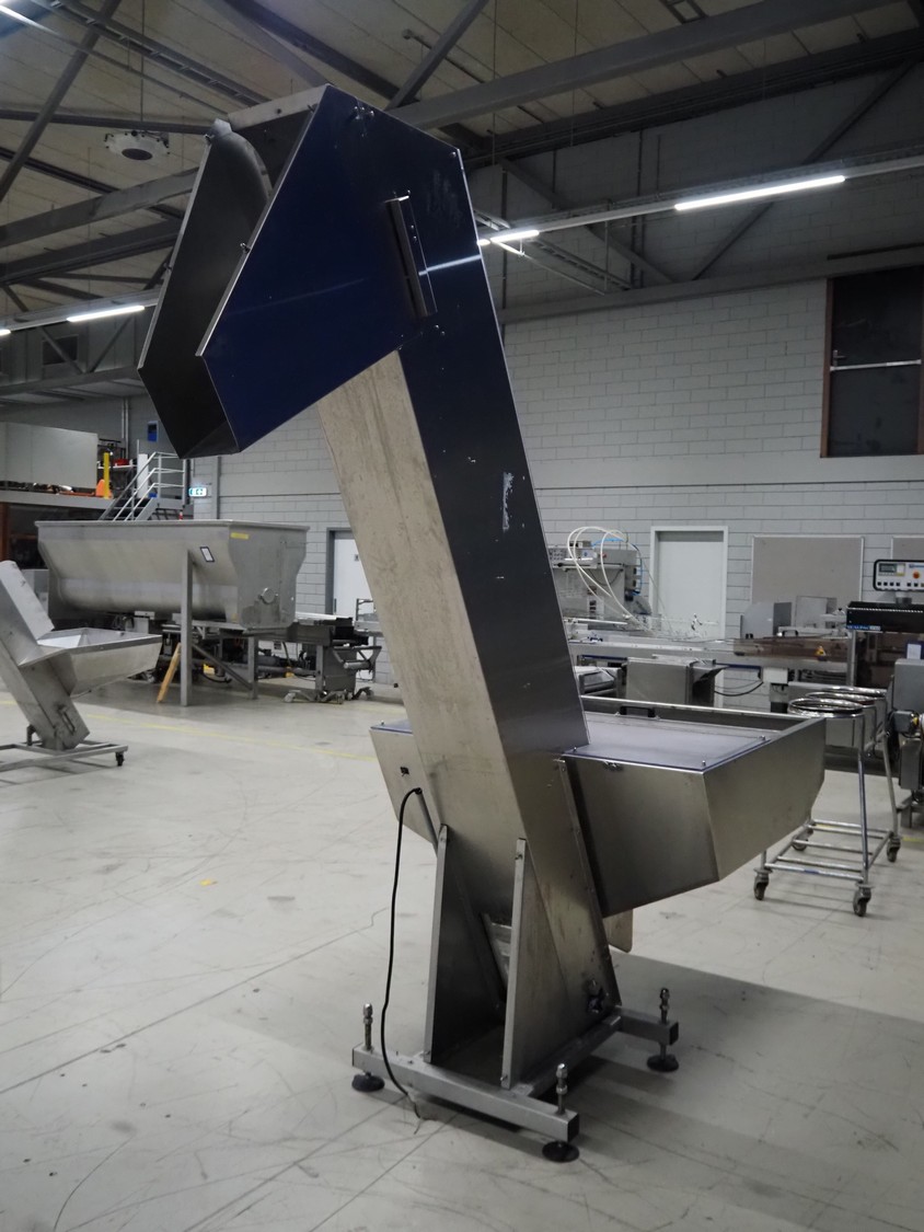 Bonino cap feeding conveyor, serial number: 49265, year of construction: 2015, 400 V, 50 Hz, 0.7 A, 0.18 kW, weight: 210 kg, plastic belt with dividers: 300 mm, divider height: 50 mm, distance between dividers: 125 mm, elevating height: 2450 mm, total dimensions: 2700 mm x 1200 mm x 2650 mm.