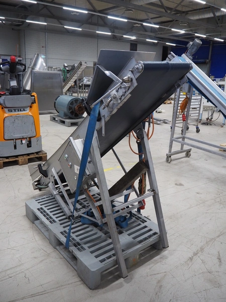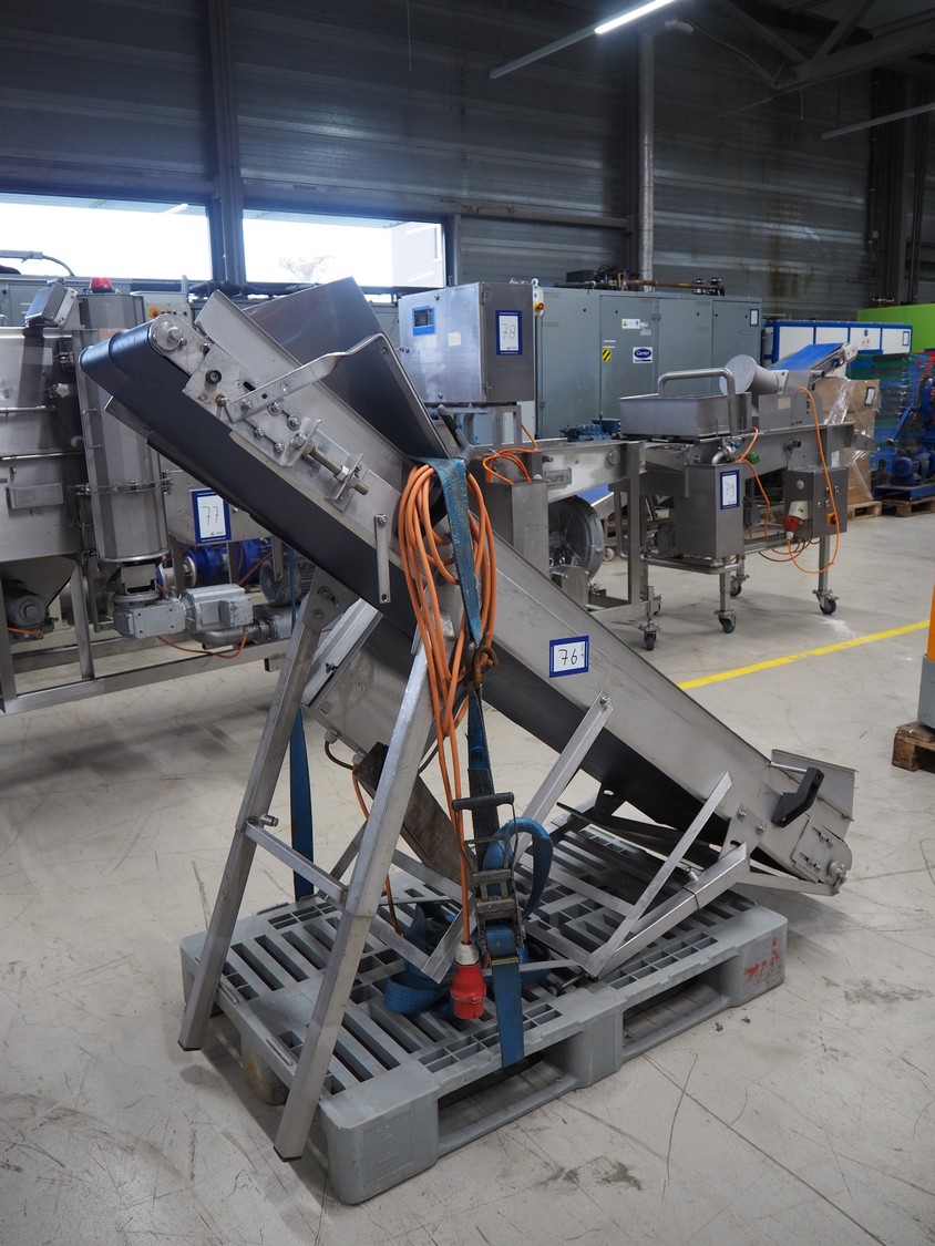 Wichelmann Metallbau elevating belt, plastic belt, belt width: 400 mm, elevating height: 1450 mm, total dimensions: 1750 mm x 620 mm x 1600 mm.