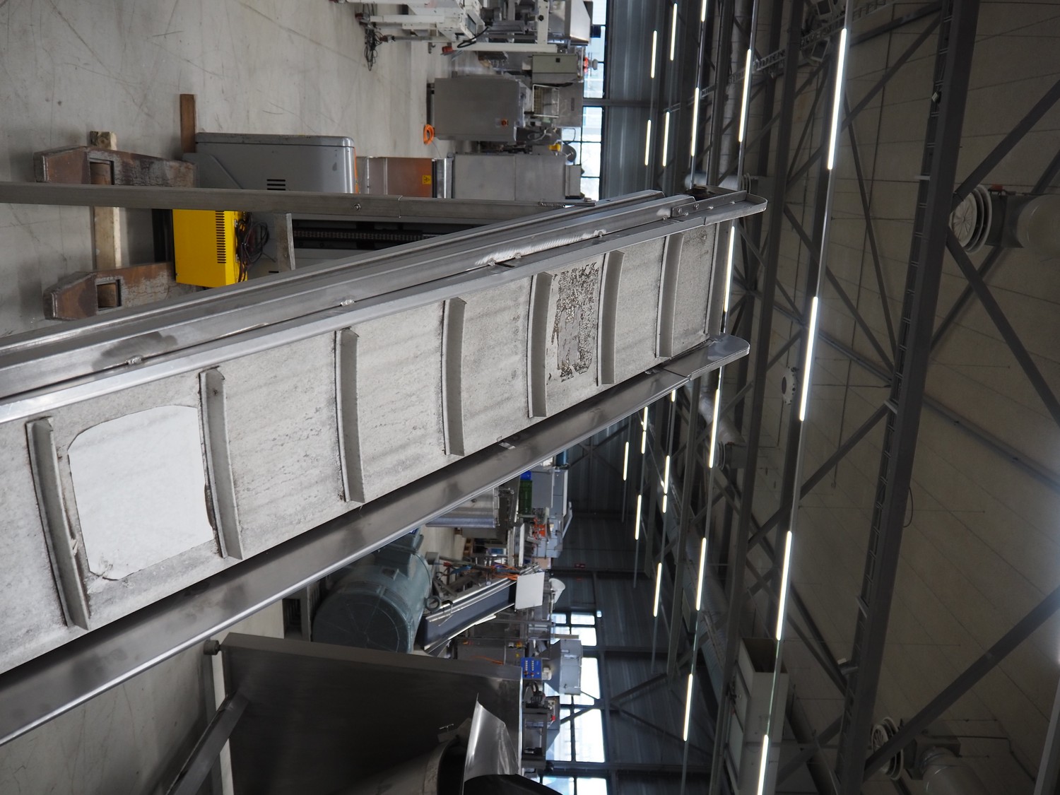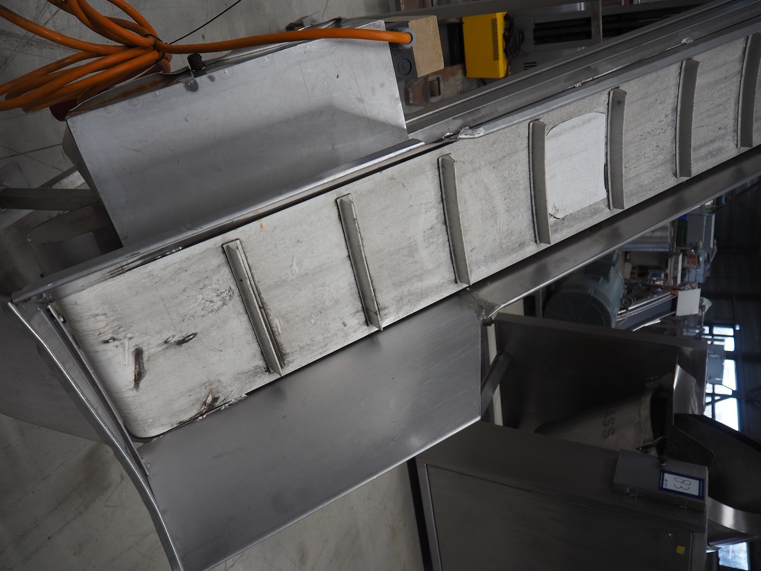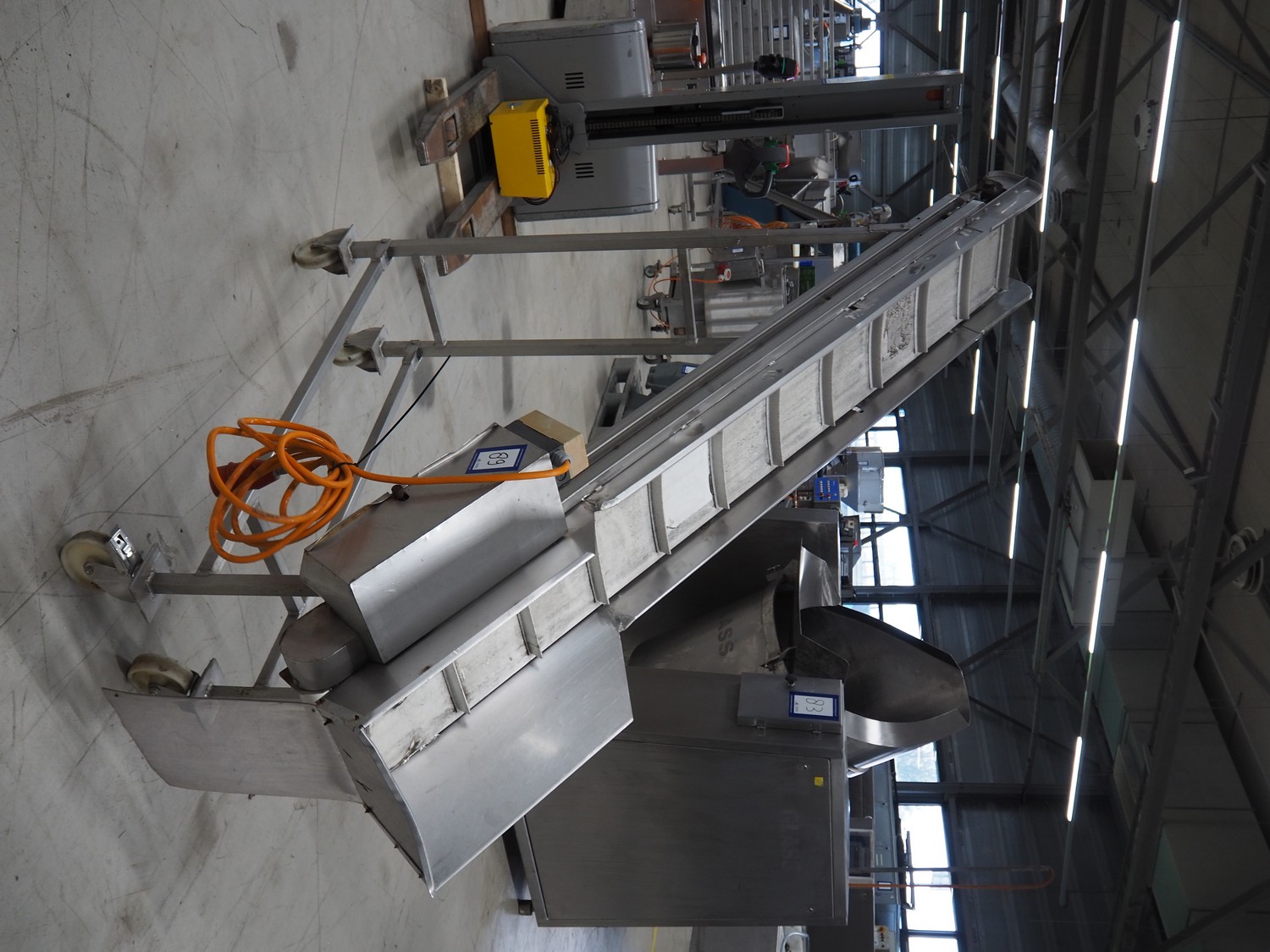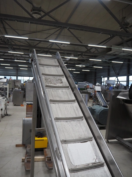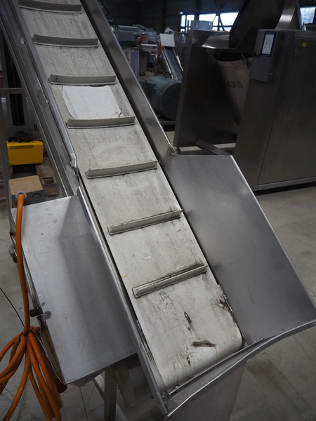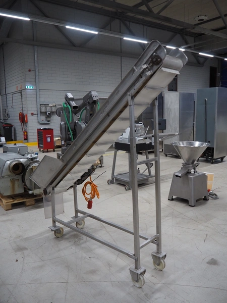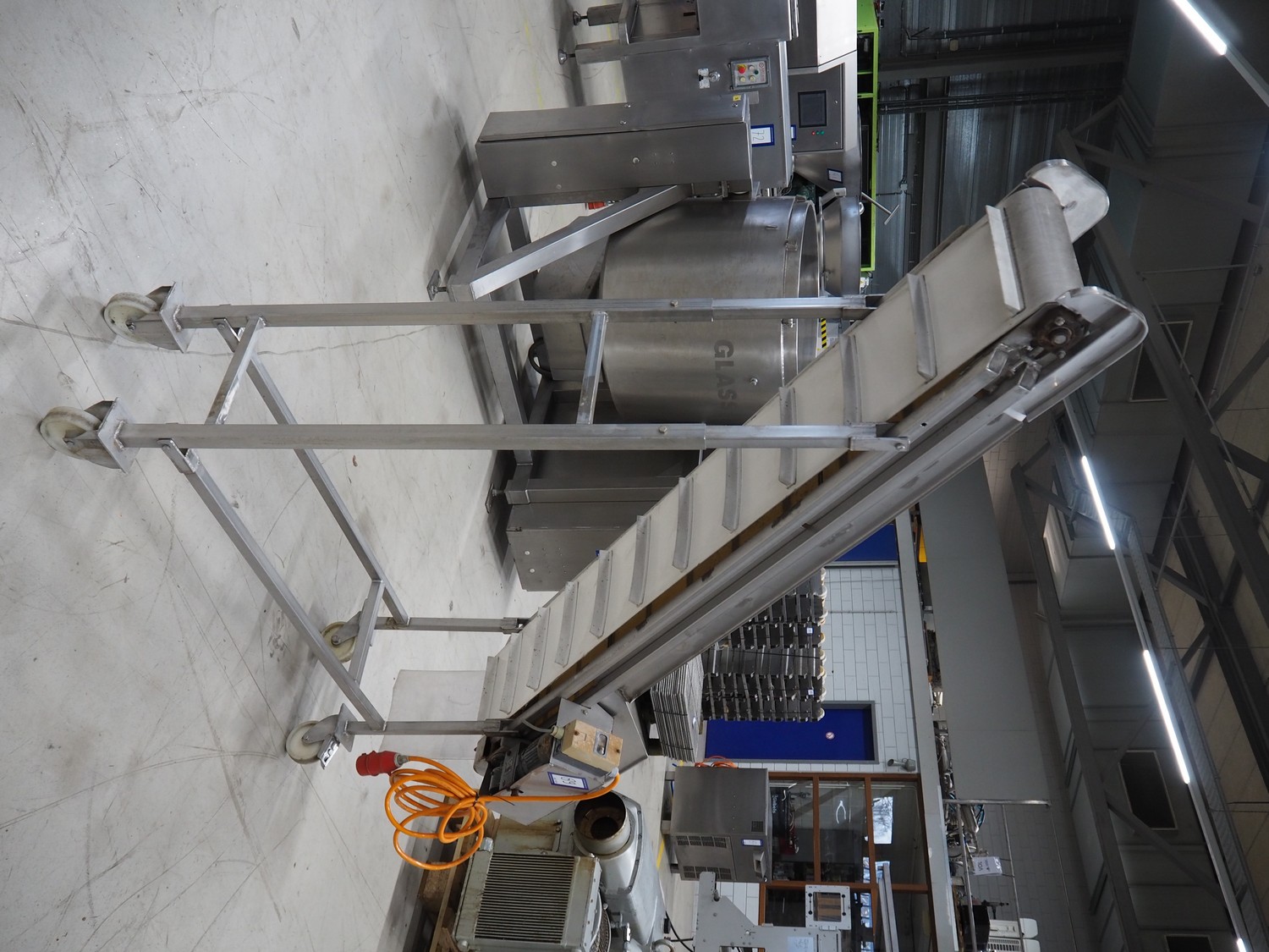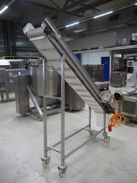 Mobile elevating belt, s/s frame, plastic belt with dividers, belt width: 280 mm, distance between dividers: 180 mm, divider height: 30 mm, elevating height: 1900 mm, total dimensions: 1900 mm x 500 mm x 2000 mm.