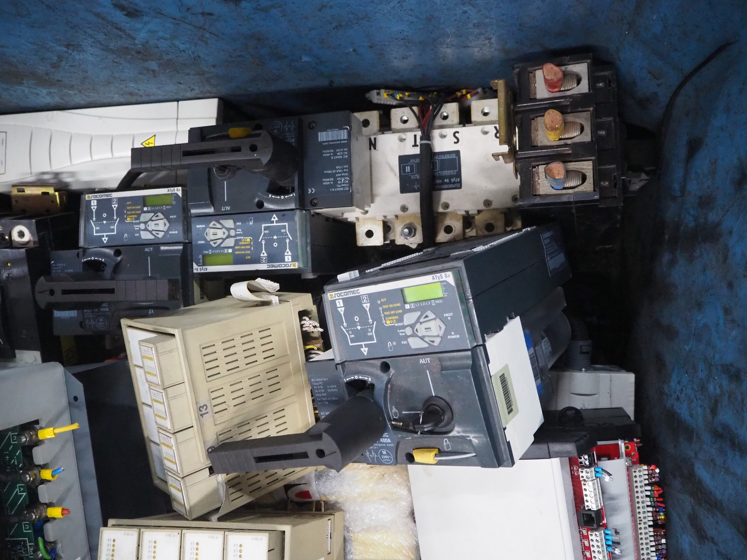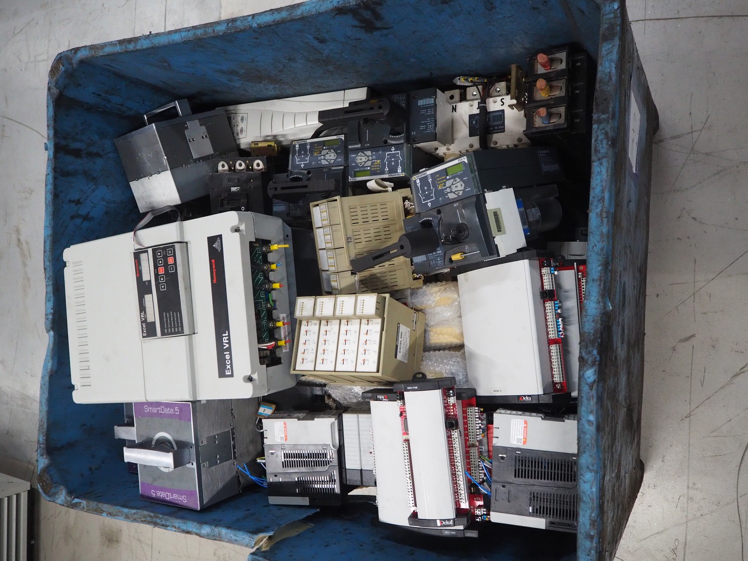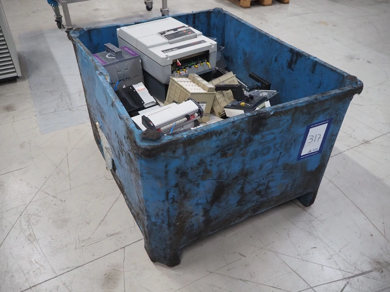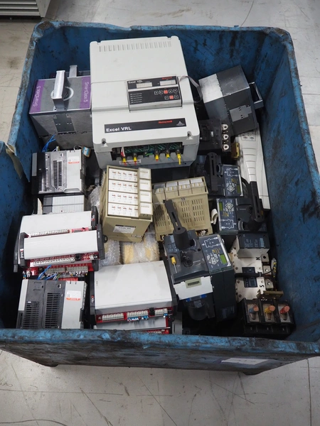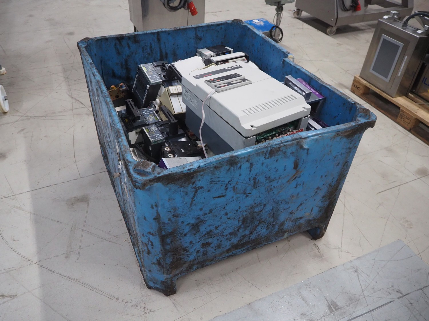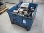 Plastic pallet box with large amount of electric parts, dimensions: 1200 mm x 1000 mm x 750 mm.