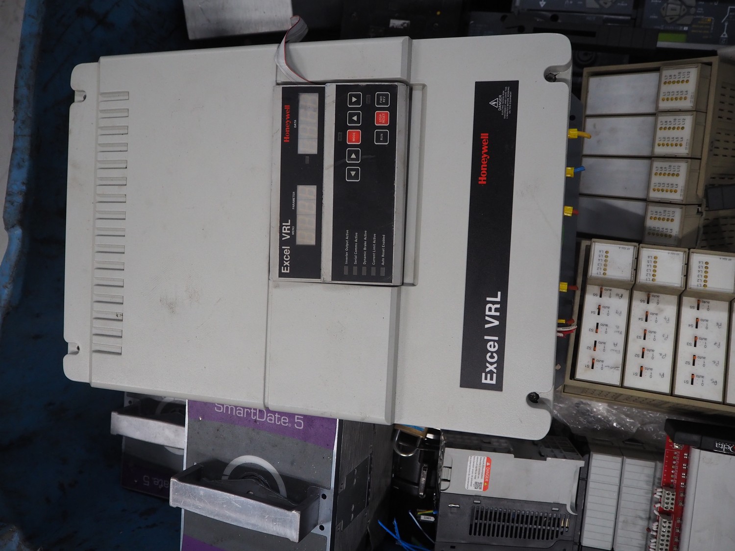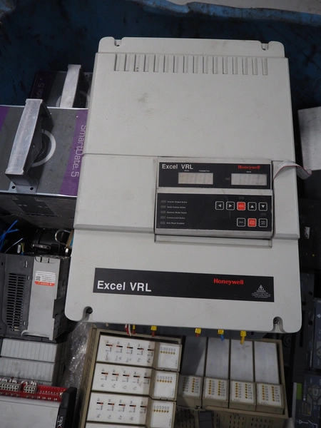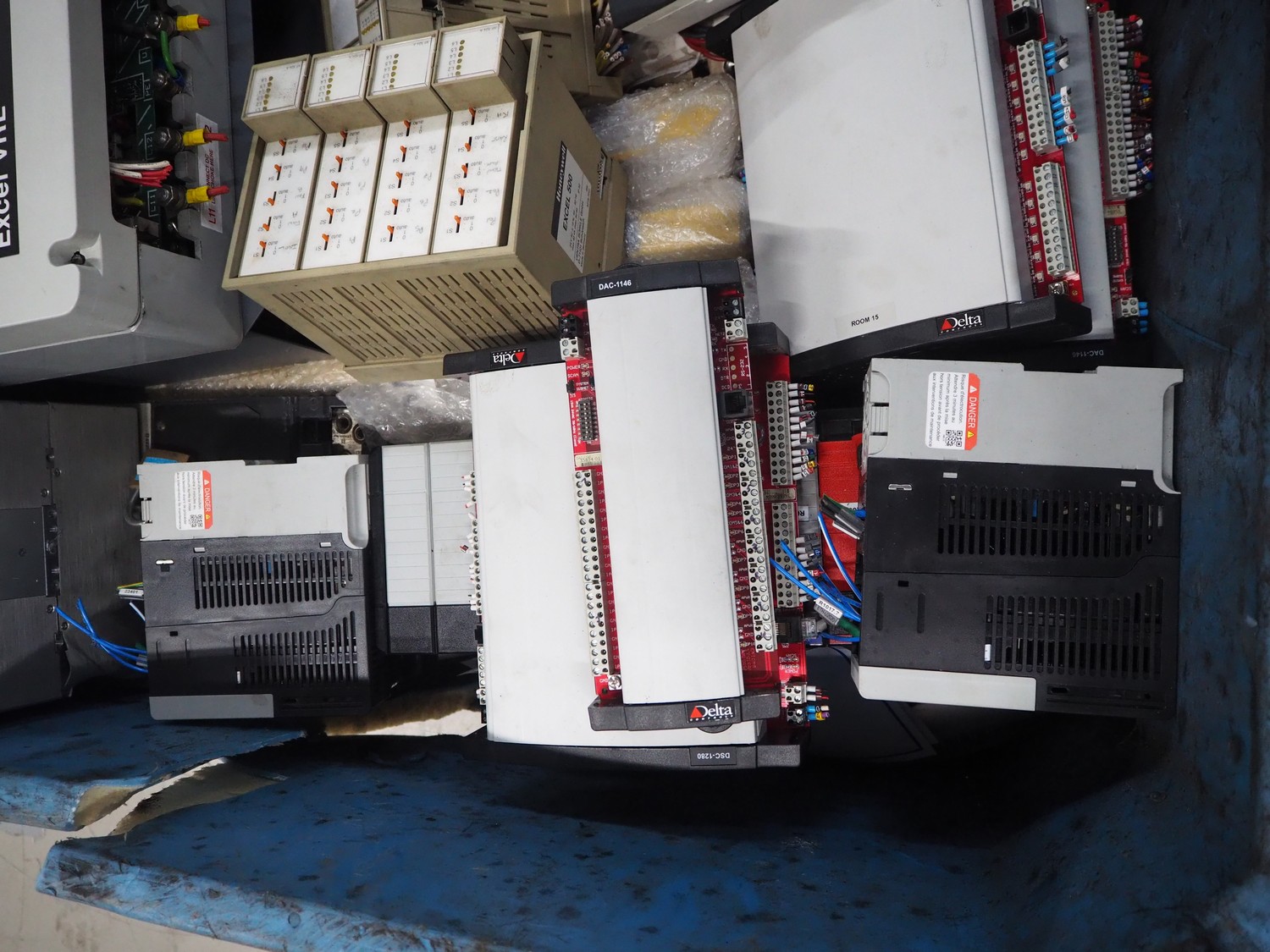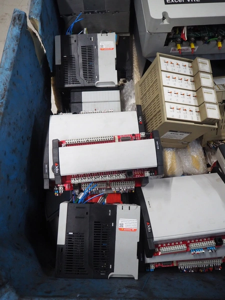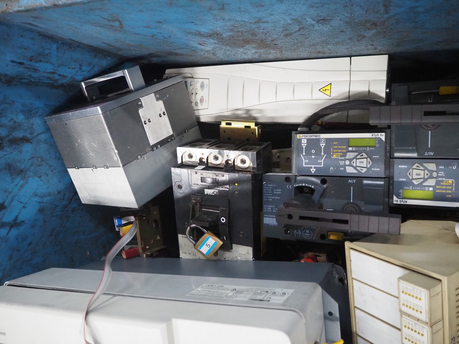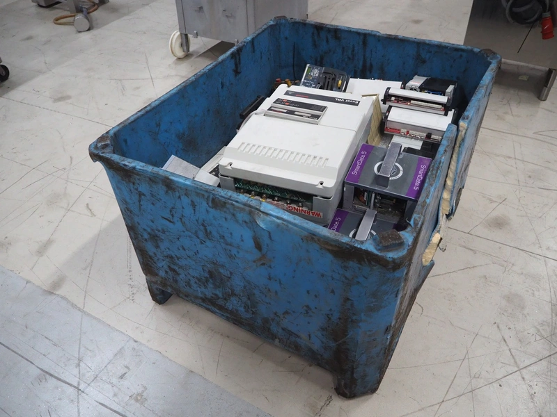 Plastic pallet box with large amount of electric parts, dimensions: 1200 mm x 1000 mm x 750 mm.