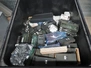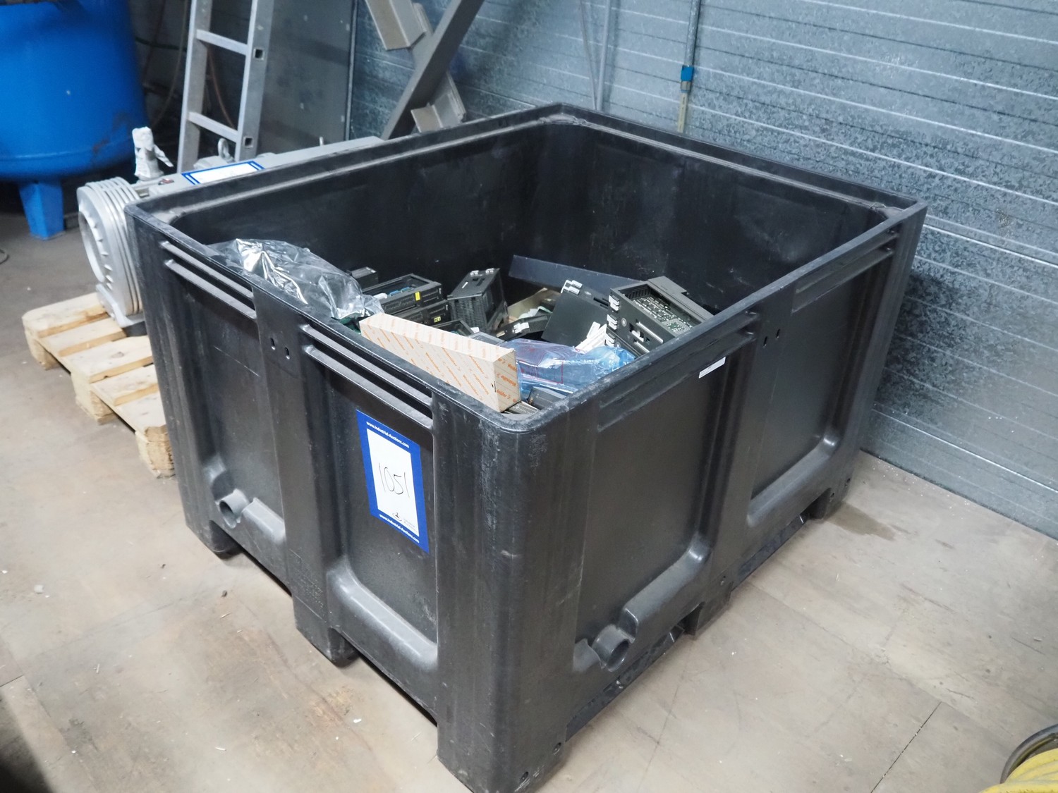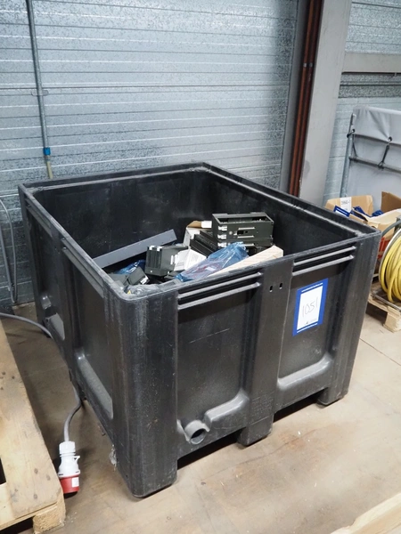 Plastic pallet box with large amount of various frequency converters, dimensions: 1200 mm x 800 mm x 800 mm.