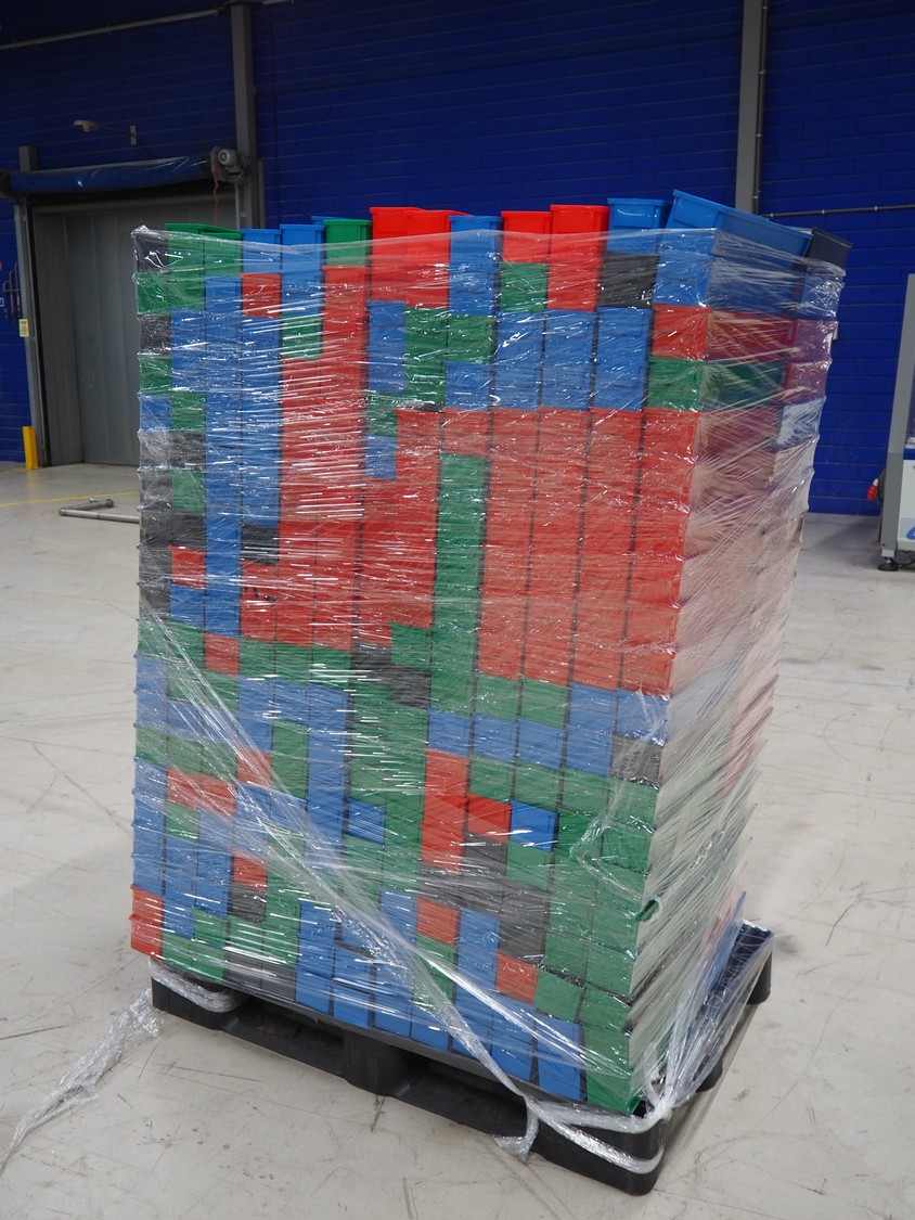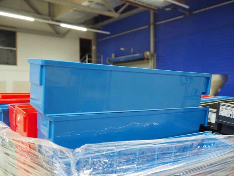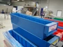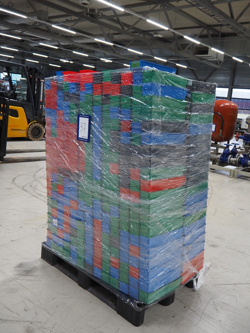 Pallet with approximately 520 plastic boxes for parts, dimensions each box: 400 mm x 90 mm x 80 mm.