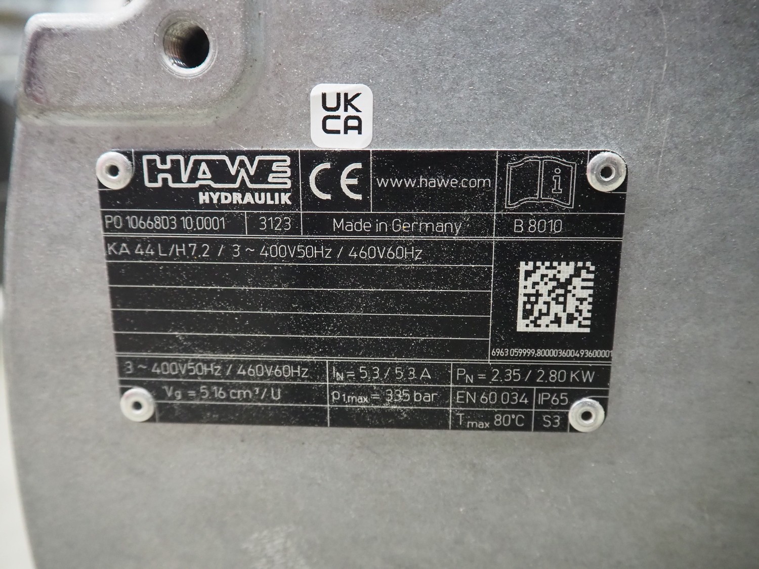 Hawe Hydraulik hydraulic power pack, type: KA 44 L / H 7.2 / 400 / 460 V, 3 Ph, 50 / 60 Hz, dimensions: 540 mm x 230 mm x 240 mm.