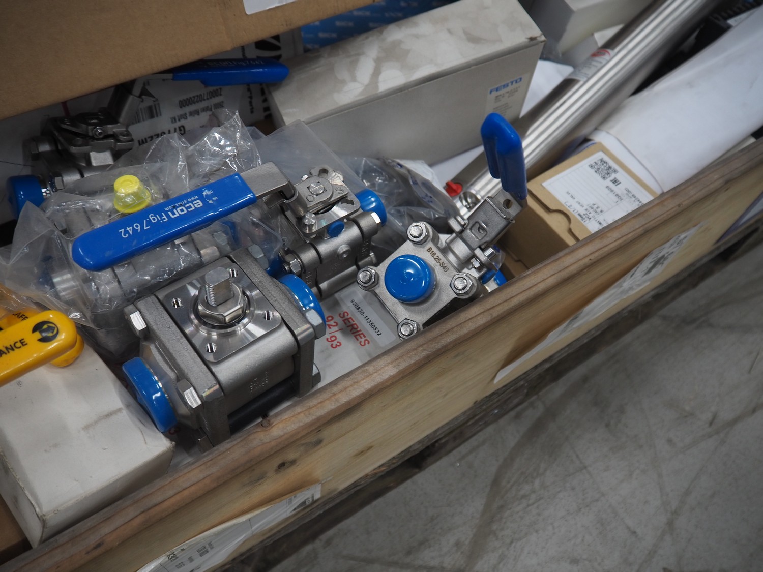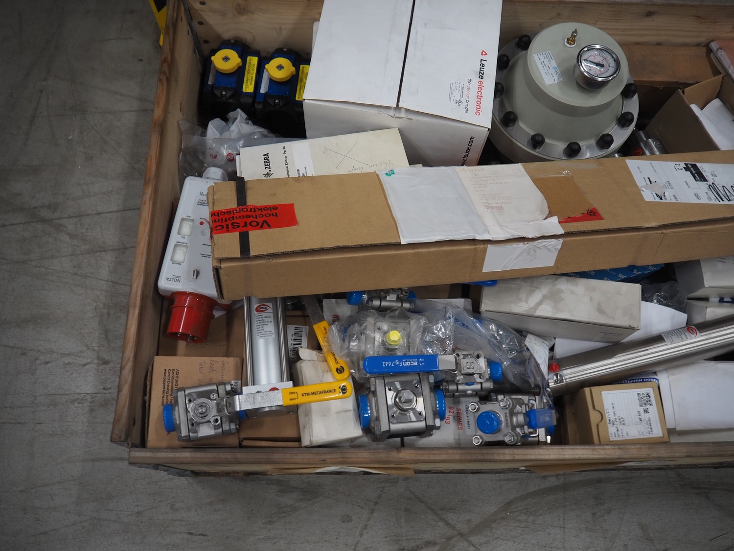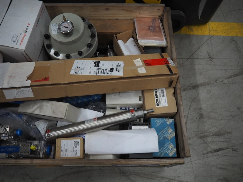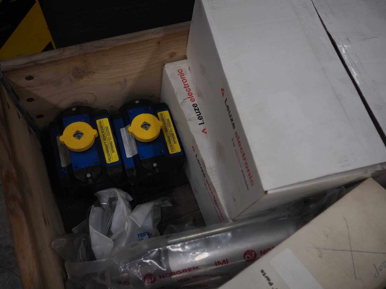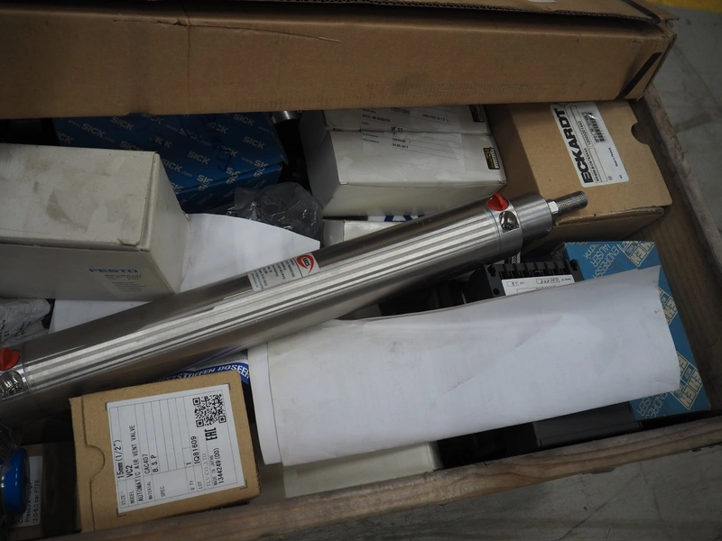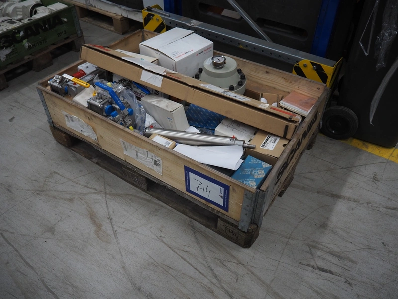 Pallet with various Festo / Sick pneumatic parts, dimensions: 1200 mm x 800 mm x 400 mm.