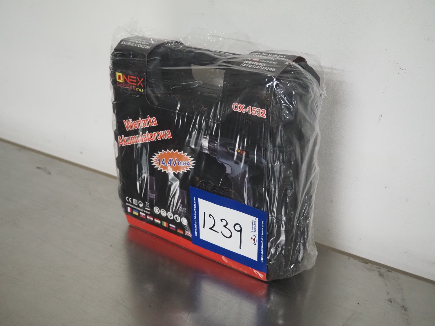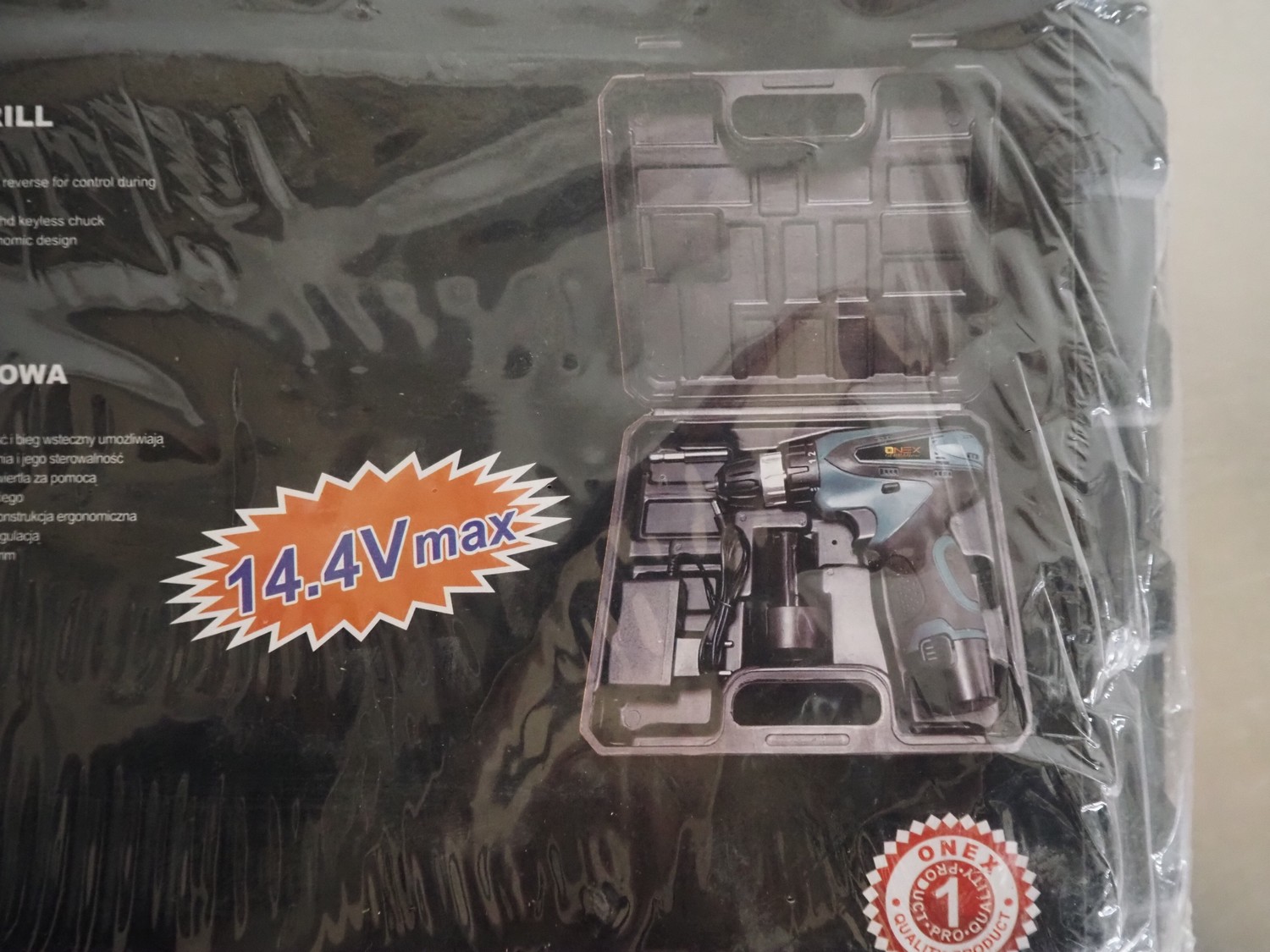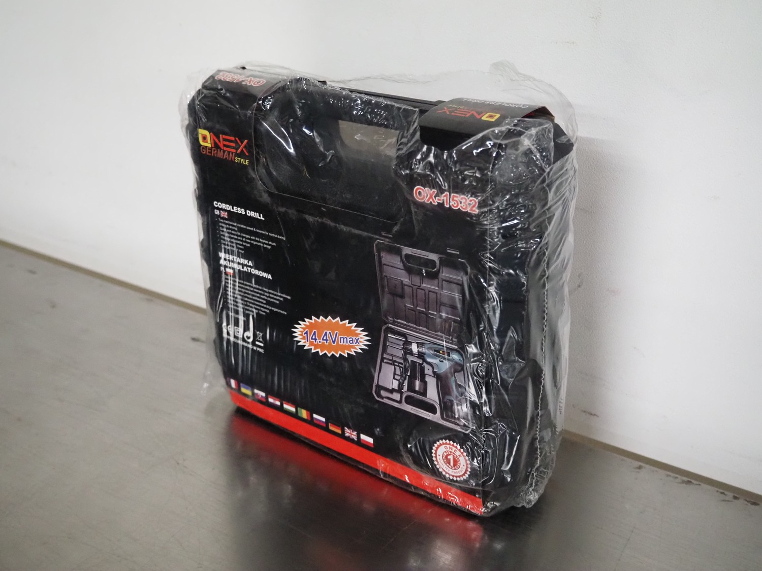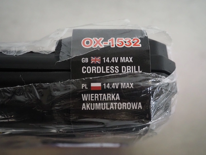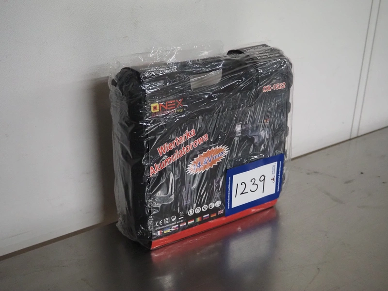 Onex cordless drill, model: OX-1532, 14.4 V, dimensions: 260 mm x 230 mm x 80 mm.