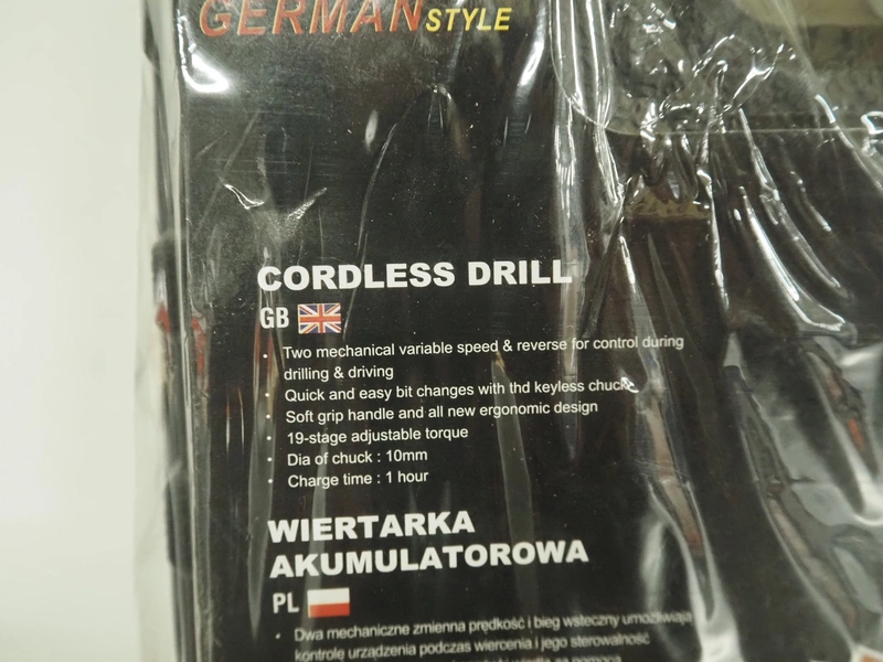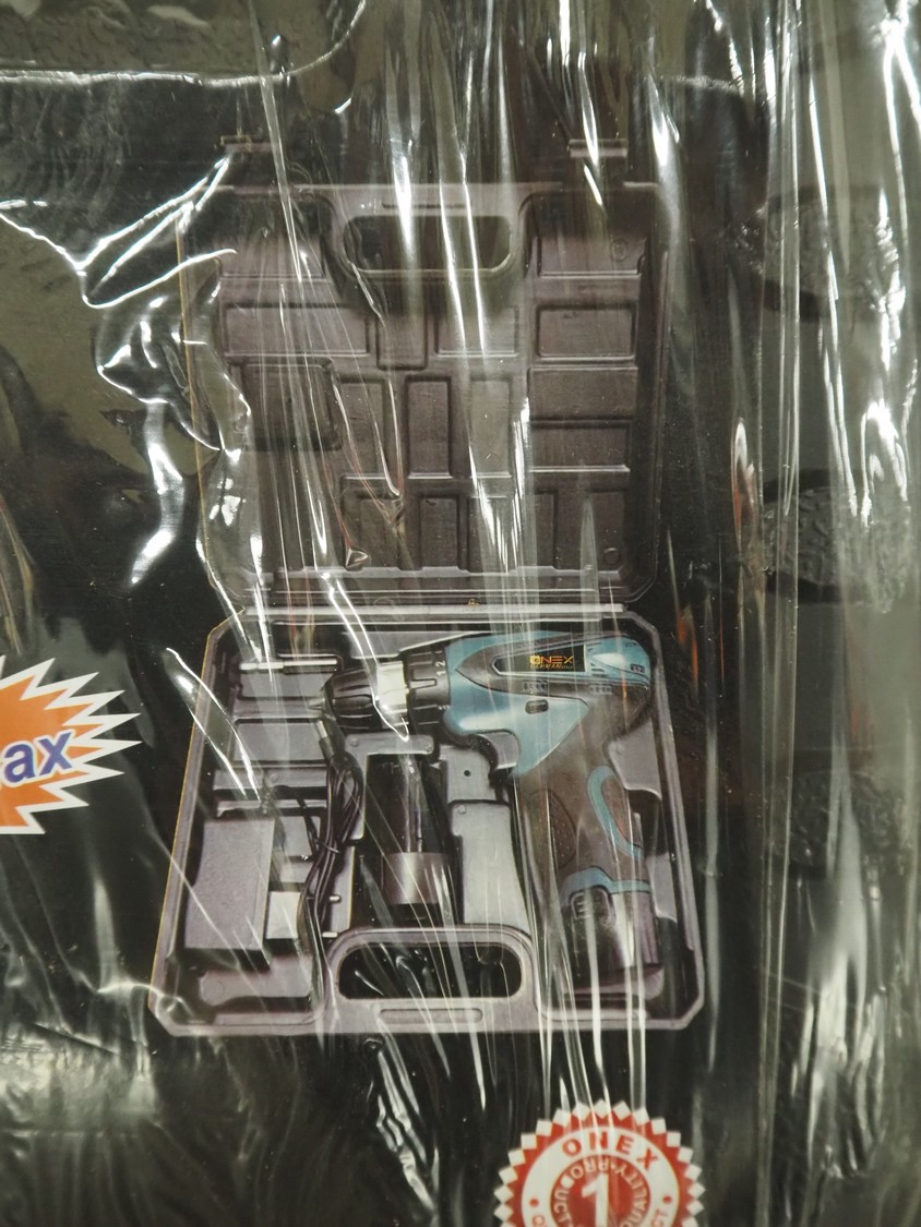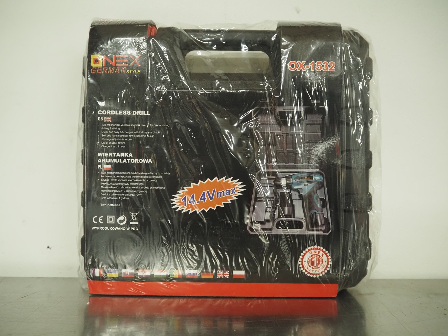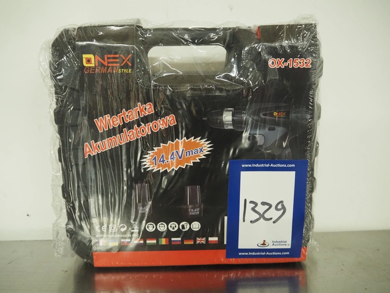 Onex cordless drill, model: OX-1532, 14.4 V, dimensions: 260 mm x 230 mm x 80 mm.