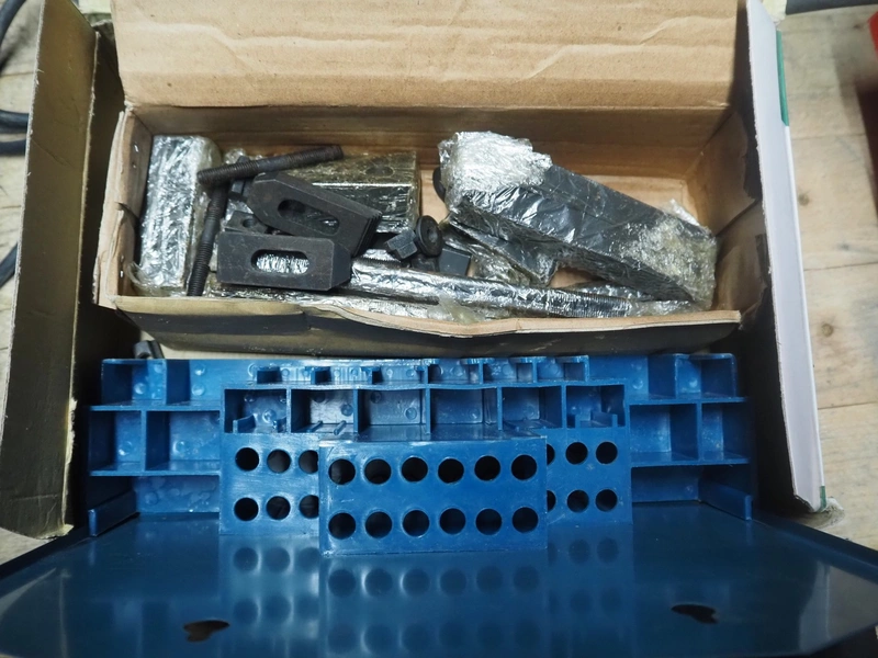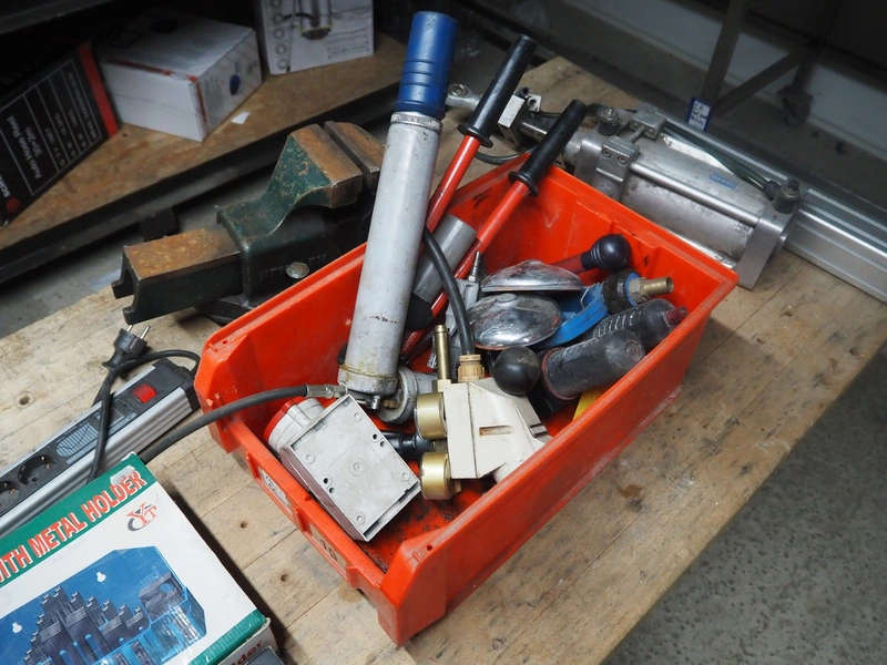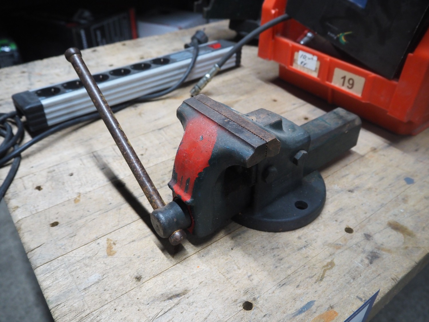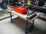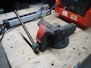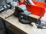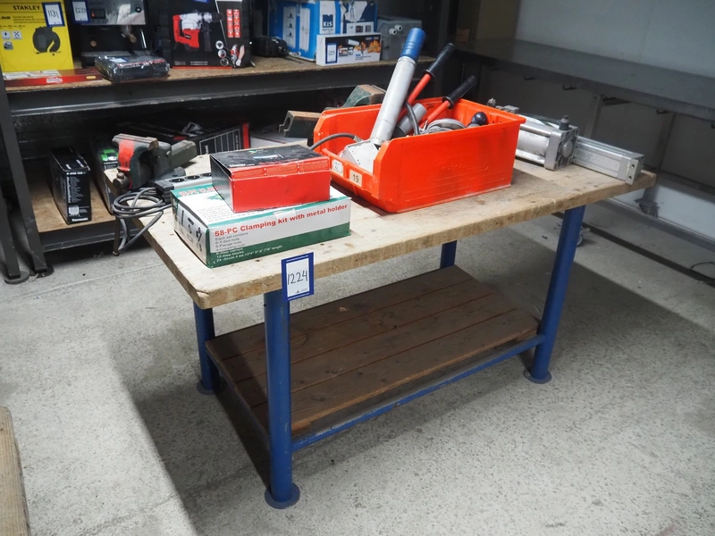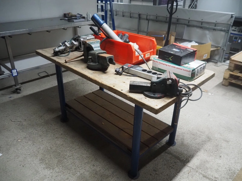 Wooden workbench, steel frame, 2 steel vises, dimensions: 1500 mm x 800 mm x 800 mm.