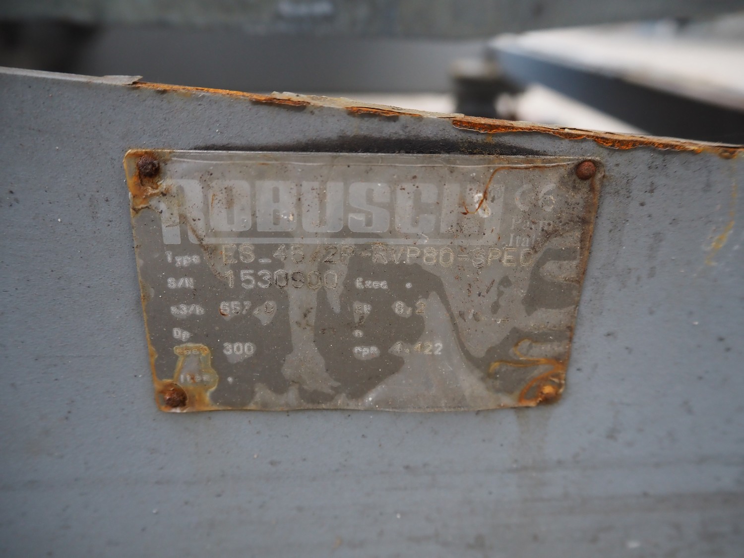 Robuschi positive displacement blower, type: ES_45/2P-RVP80-SPEC, serial number: 1530900, capacity: 657 m³ per hour, dimensions: 1100 mm x 11580 mm x 1100 mm.