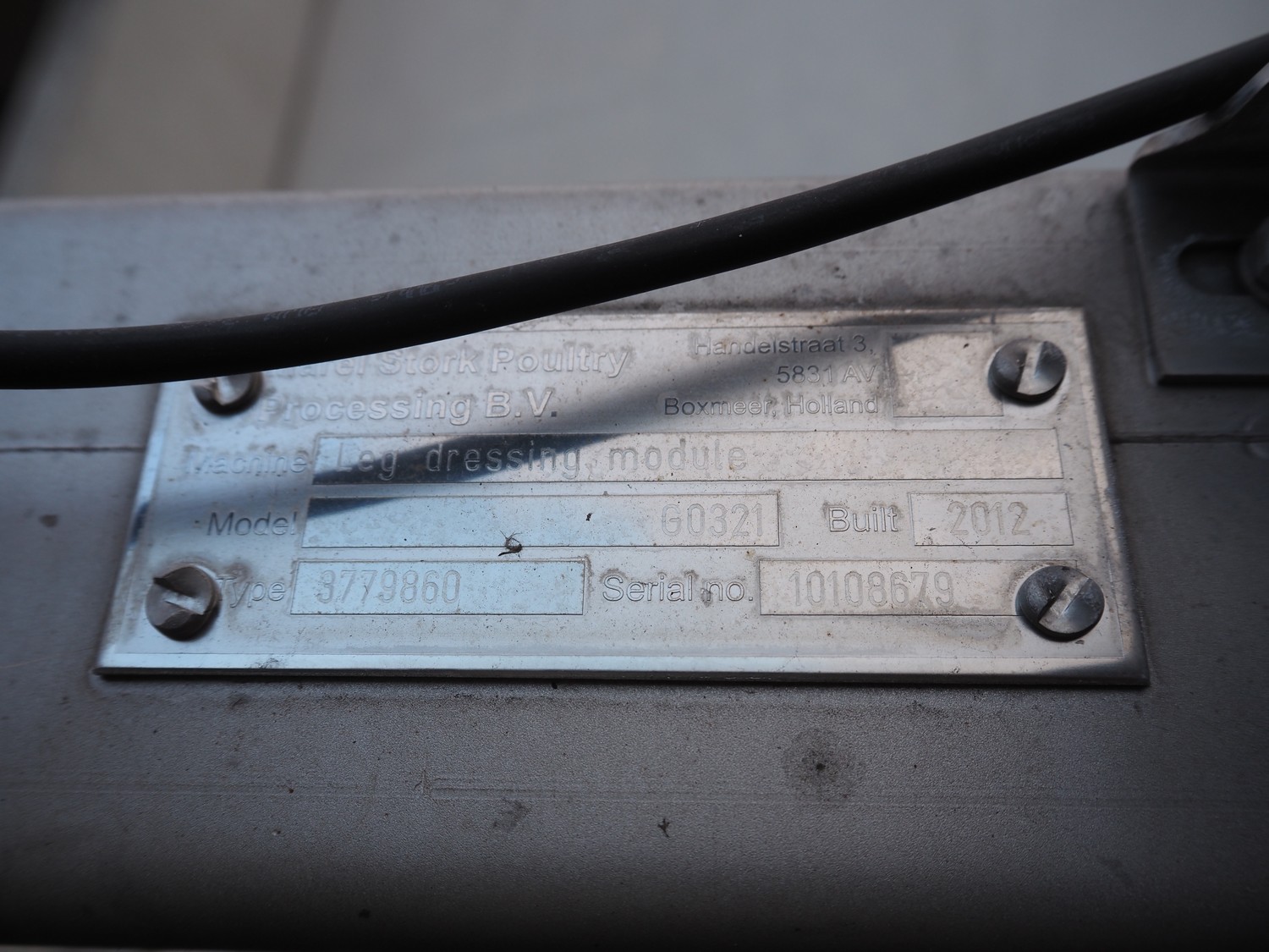 Marel Stork Poultry Processing B.V. leg dressing module, model: G0321, type: 3779860, serial number: 10108679, year of construction: 2012, total dimensions: 2000 mm x 1600 mm x 2450 mm. Missing one wheel.
