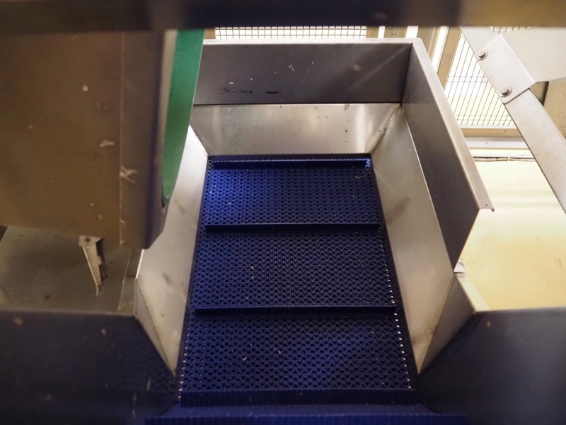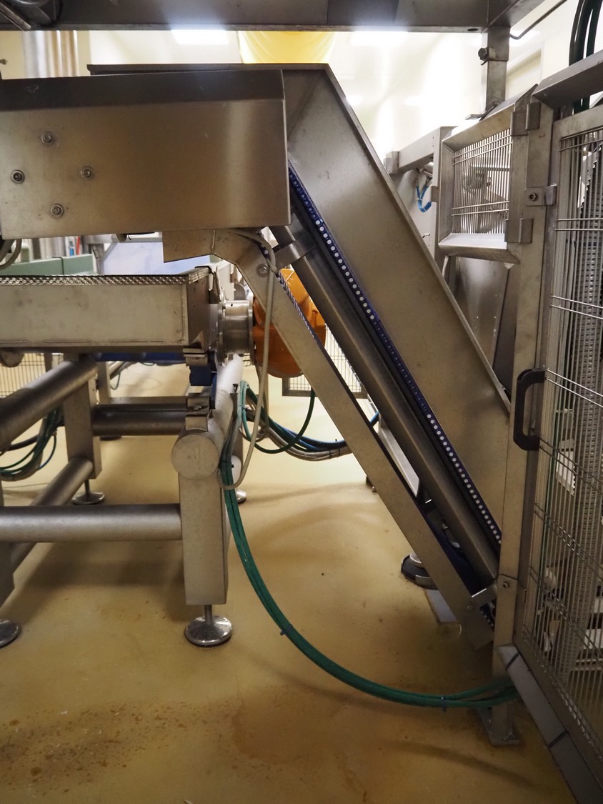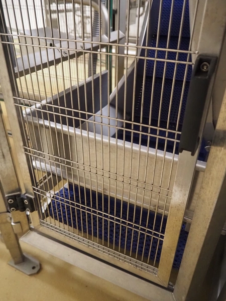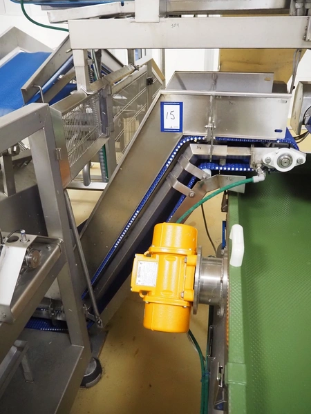 Cosmo Food Machinery s.r.l. elevating belt, plastic mesh belt with dividers, belt width: 450 mm, divider height: 25 mm, distance between dividers: 210 mm, elevating height: 1150 mm, total dimensions: 1600 mm x 700 mm x 1300 mm.