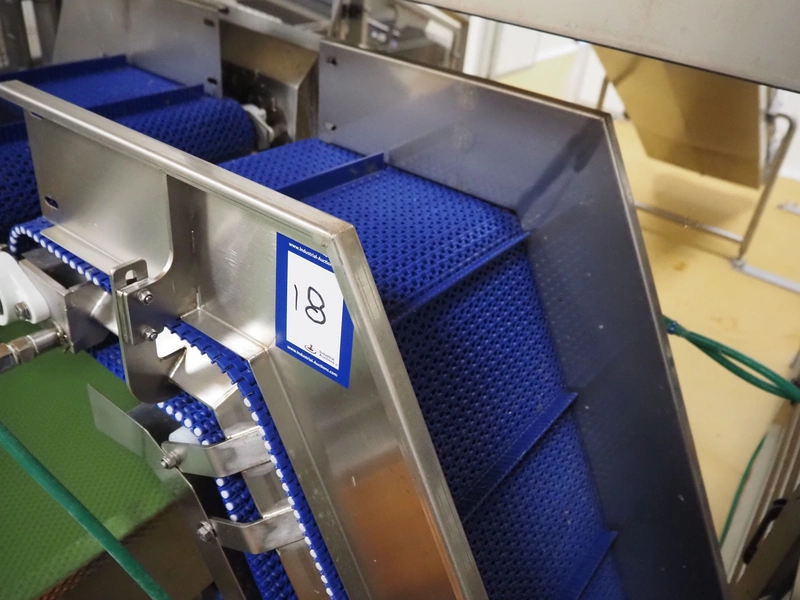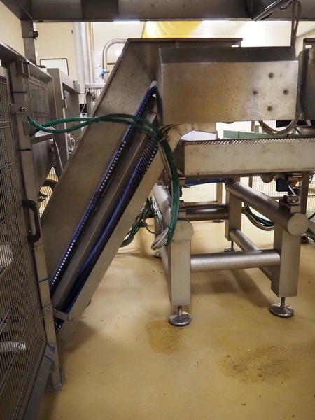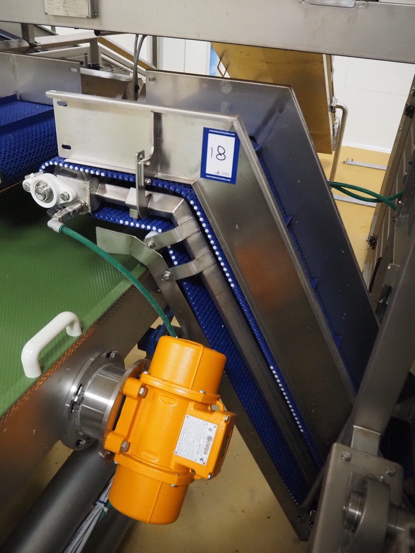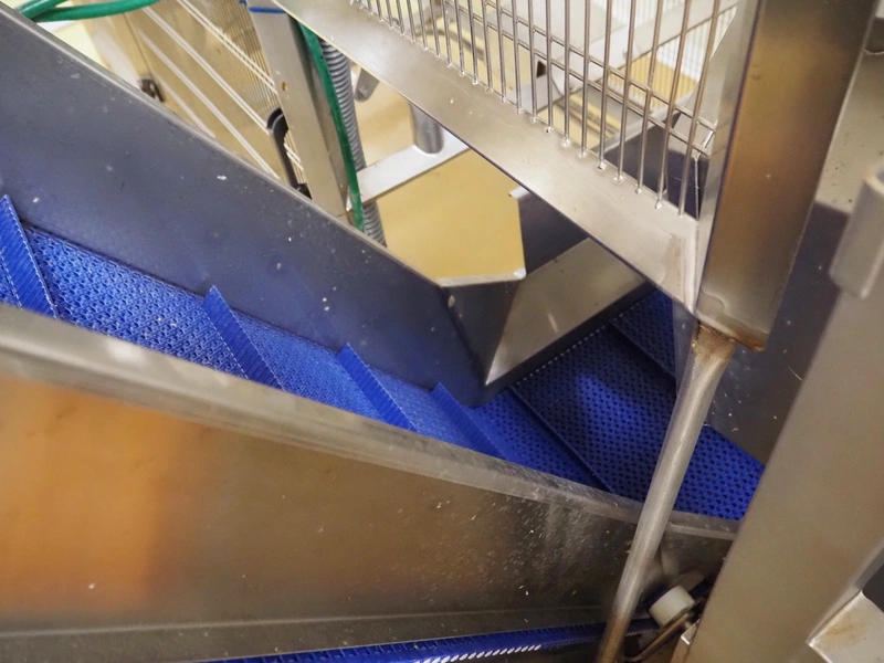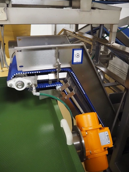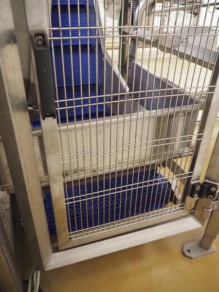 Cosmo Food Machinery s.r.l. elevating belt, plastic mesh belt width dividers, belt width: 450 mm, divider height: 25 mm, distance between dividers: 210 mm, elevating height: 1150 mm, total dimensions: 1600 mm x 700 mm x 1300 mm.