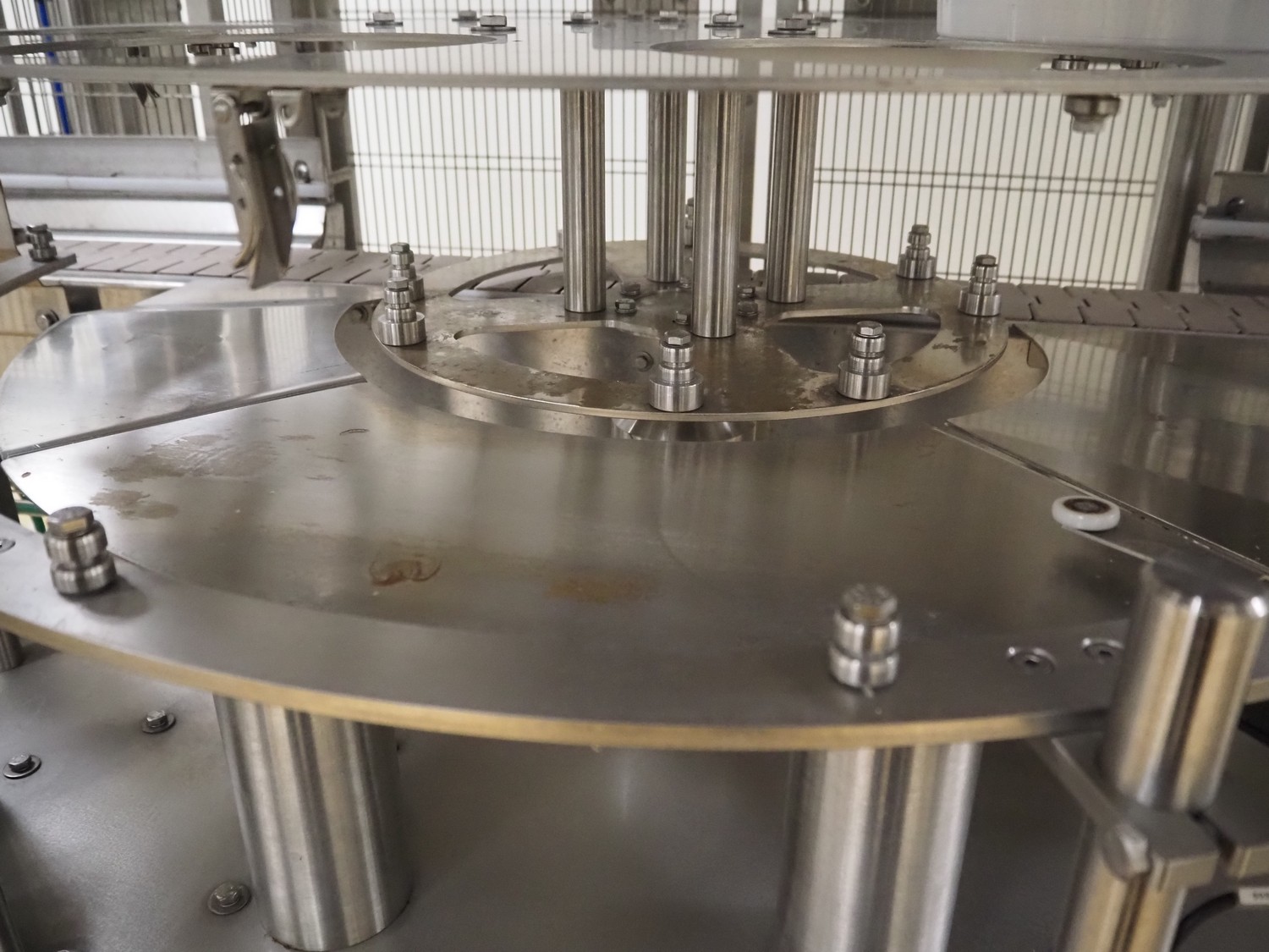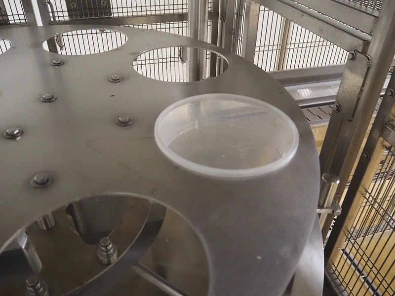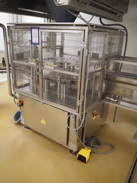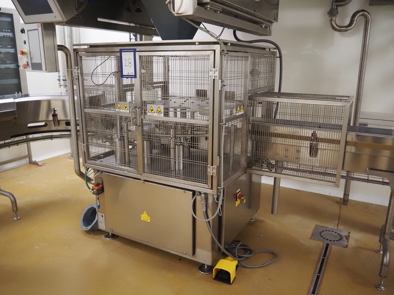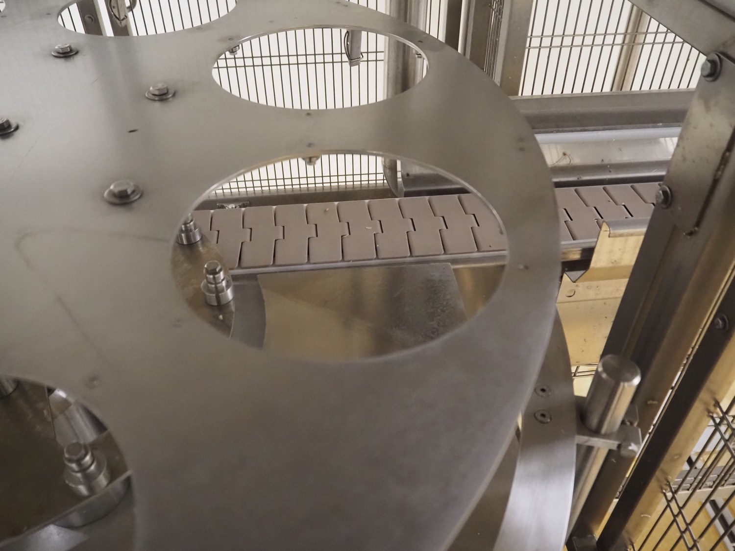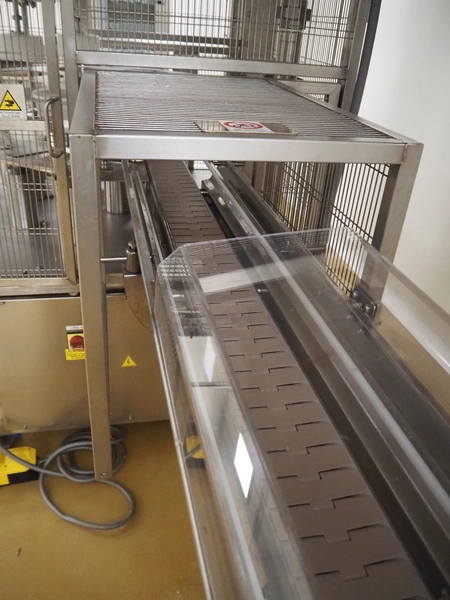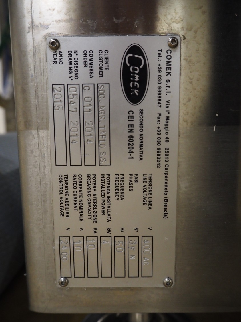 Comek filling machine with infeed- and outfeed belt, model: SIST. ROTATIVO A PASSO, type: RIEMPITRICE, serial number: 0547, year of construction: 2015, 400 V, 3 Ph, 50 Hz, 10 A, 4 kW, 8 stations, diameter cups: 200 mm, total dimensions filling machine: 1200 mm x 1300 mm x 1800 mm, total length belt: 8000 mm. Including plastic bin with parts.