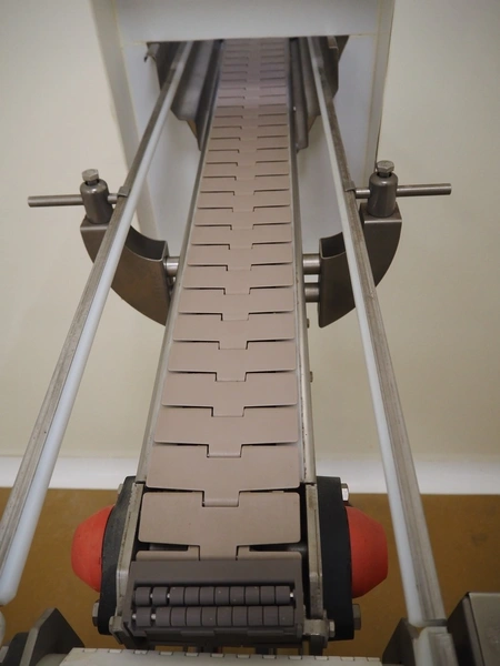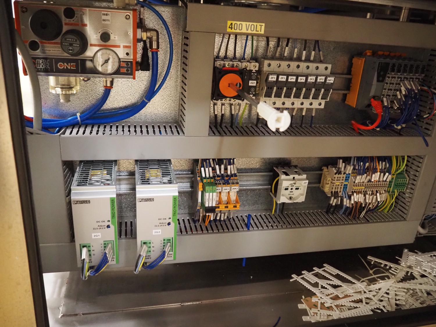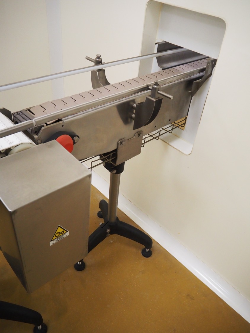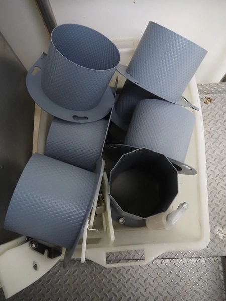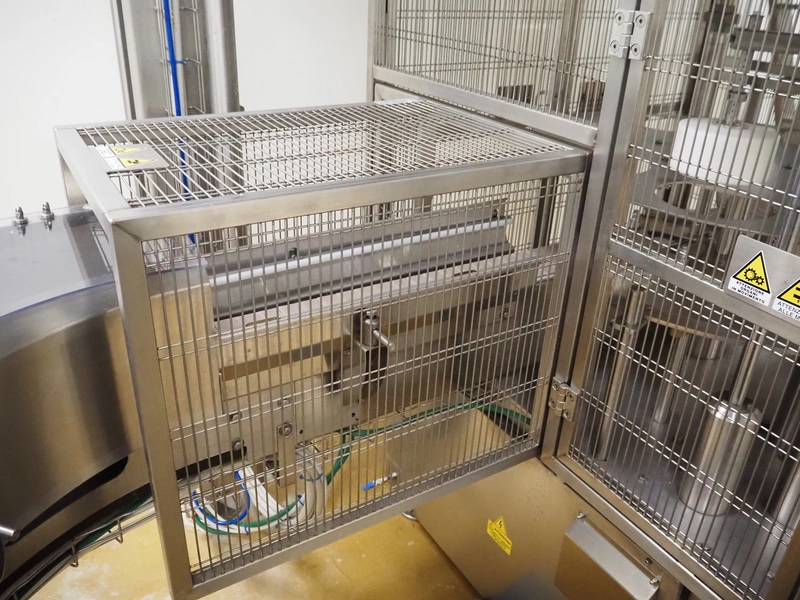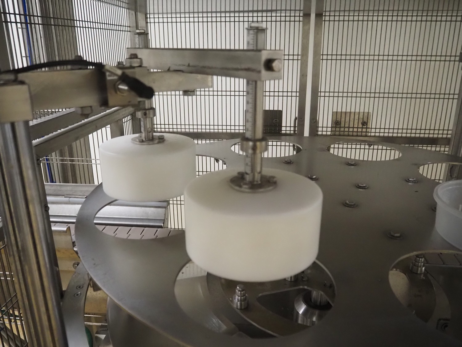 Comek filling machine with infeed- and outfeed belt, model: SIST. ROTATIVO A PASSO, type: RIEMPITRICE, serial number: 0547, year of construction: 2015, 400 V, 3 Ph, 50 Hz, 10 A, 4 kW, 8 stations, diameter cups: 200 mm, total dimensions filling machine: 1200 mm x 1300 mm x 1800 mm, total length belt: 8000 mm. Including plastic bin with parts.