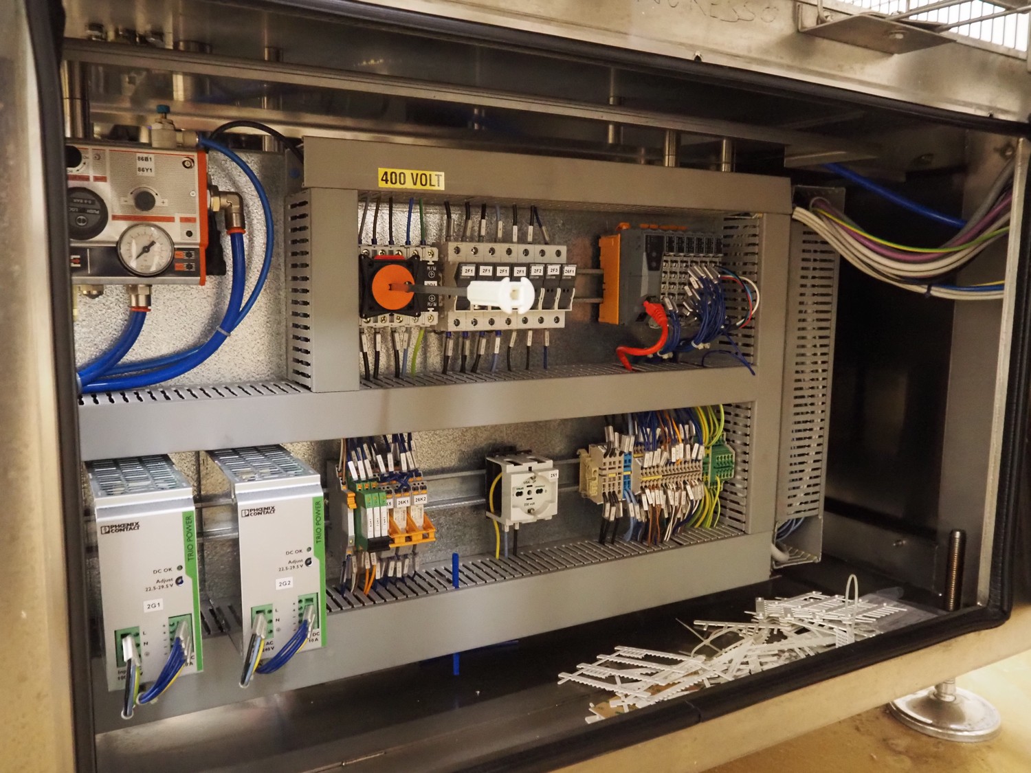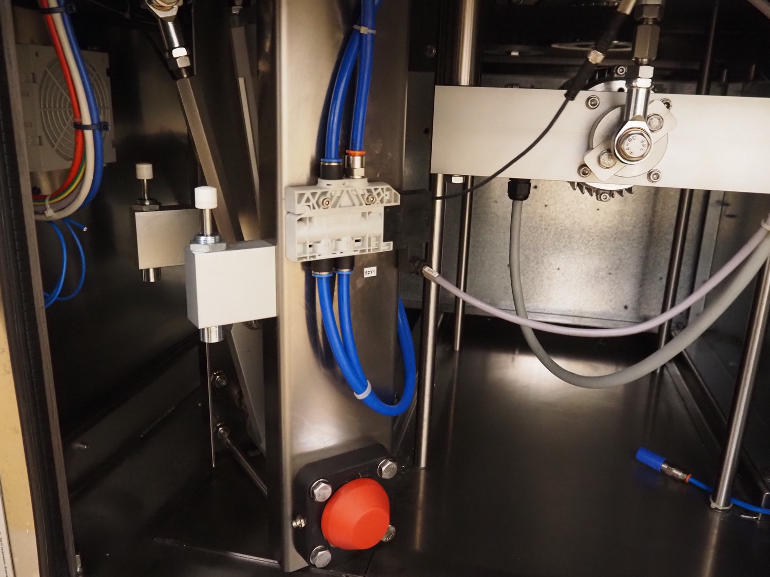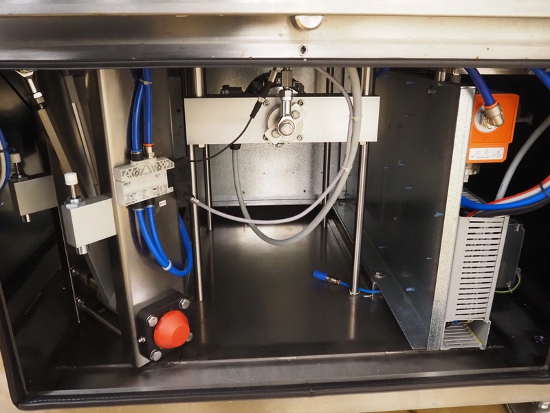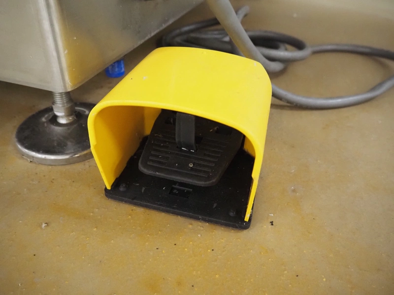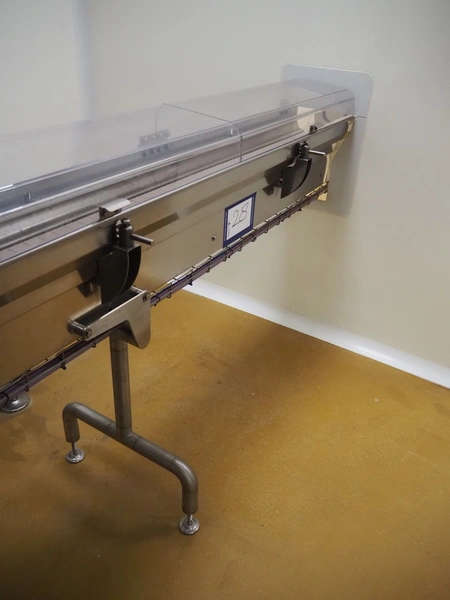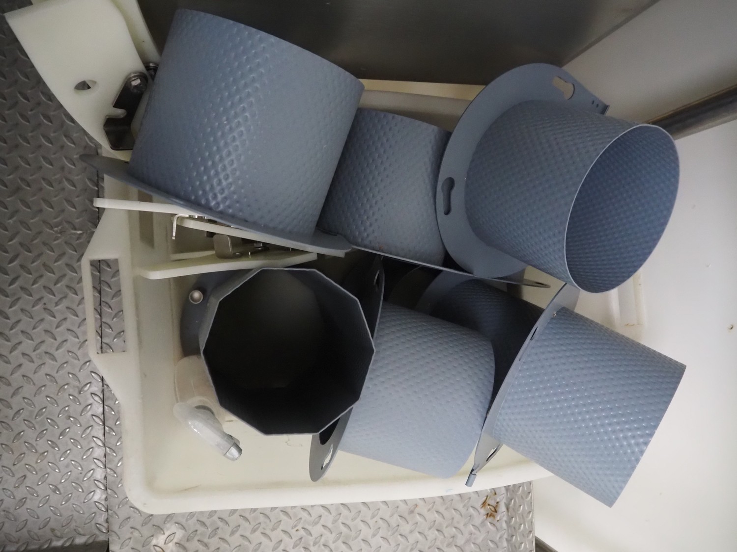 Comek filling machine with infeed- and outfeed belt, model: SIST. ROTATIVO A PASSO, type: RIEMPITRICE, serial number: 0547, year of construction: 2015, 400 V, 3 Ph, 50 Hz, 10 A, 4 kW, 8 stations, diameter cups: 200 mm, total dimensions filling machine: 1200 mm x 1300 mm x 1800 mm, total length belt: 8000 mm. Including plastic bin with parts.