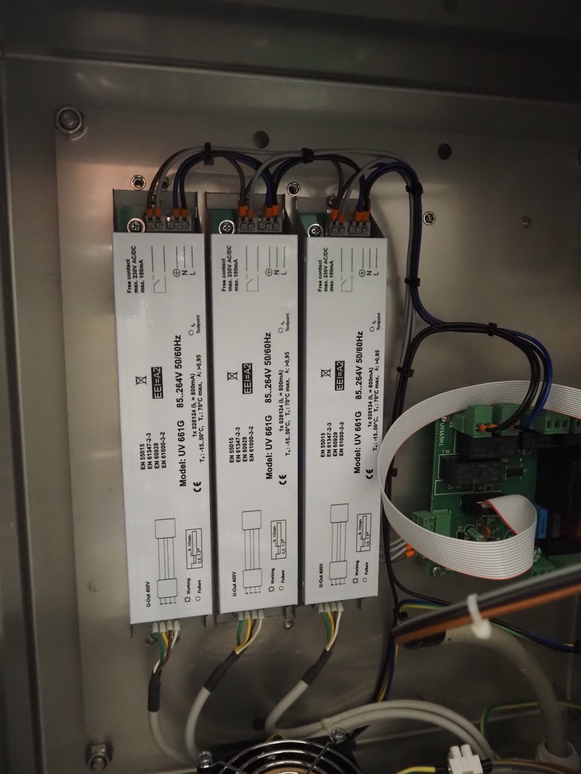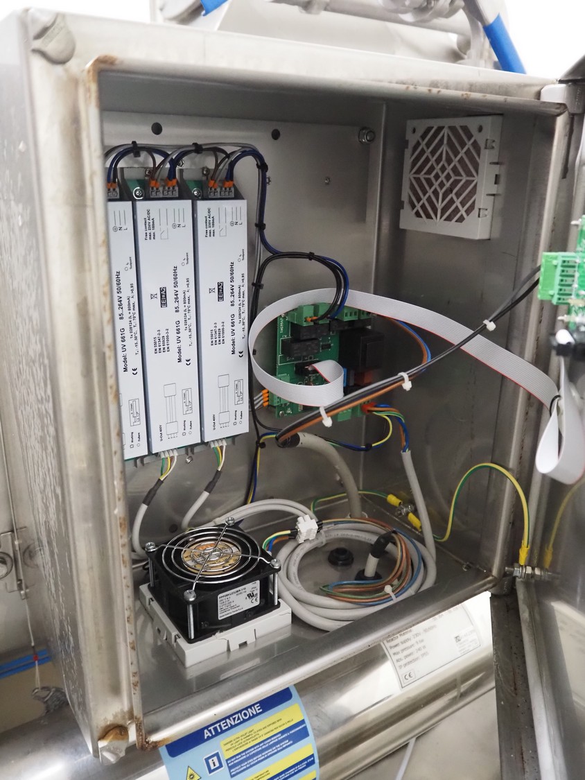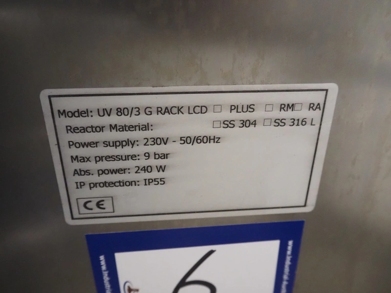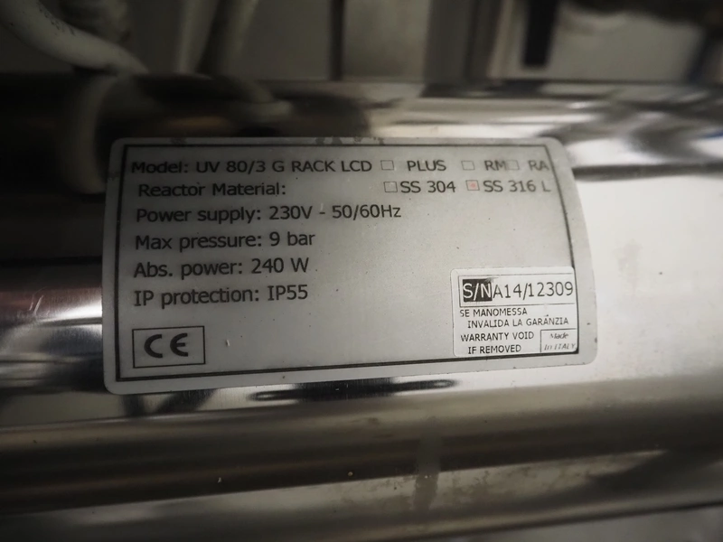 De Nora Next UV filter for water treatment, model: UV 80/3 G RACK LCD, 230 V, 50/60 Hz, 240 W, 9 bar, dimensions: 1600 mm x 650 mm x 1400 mm.
