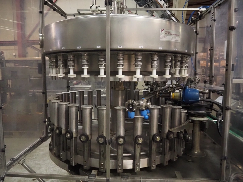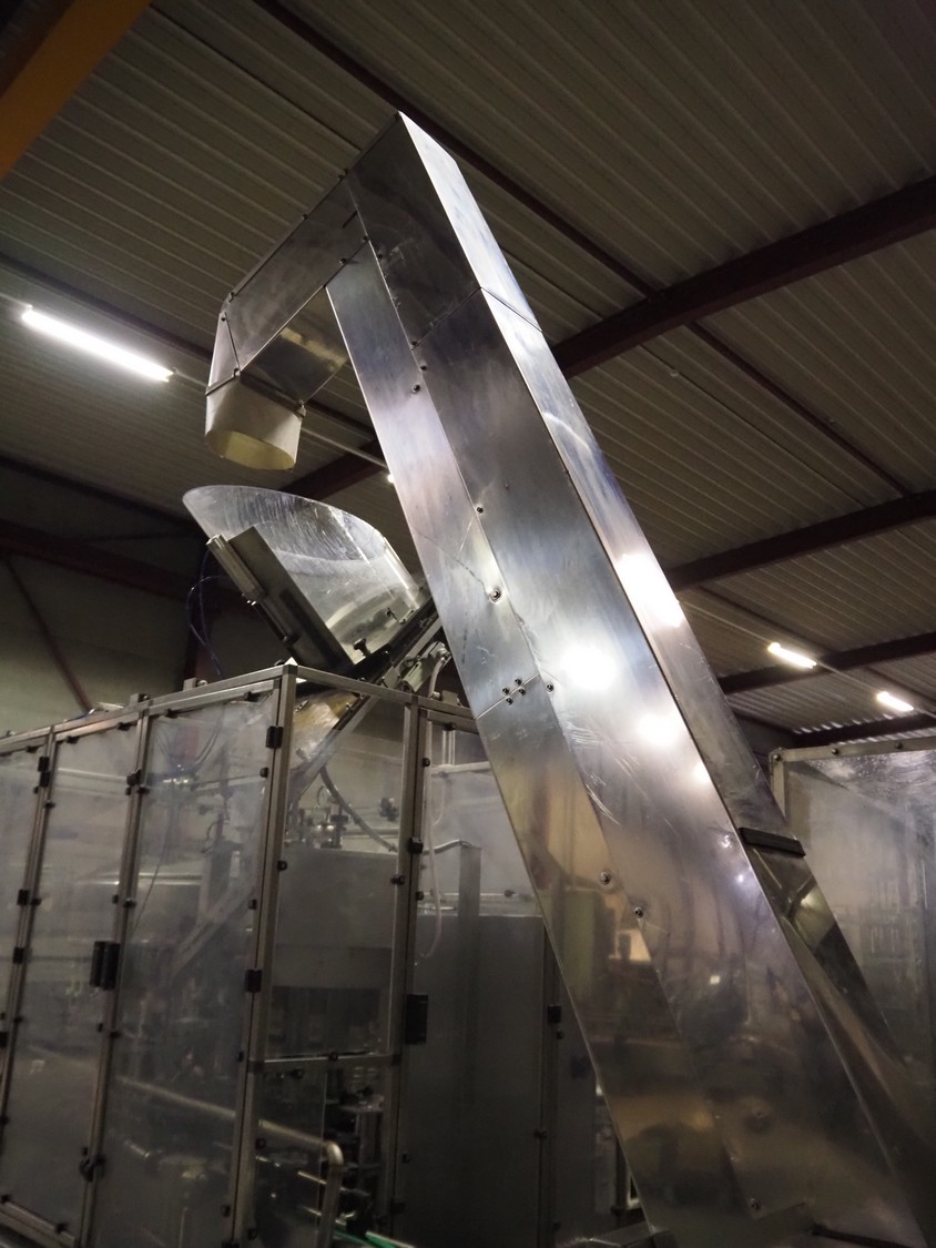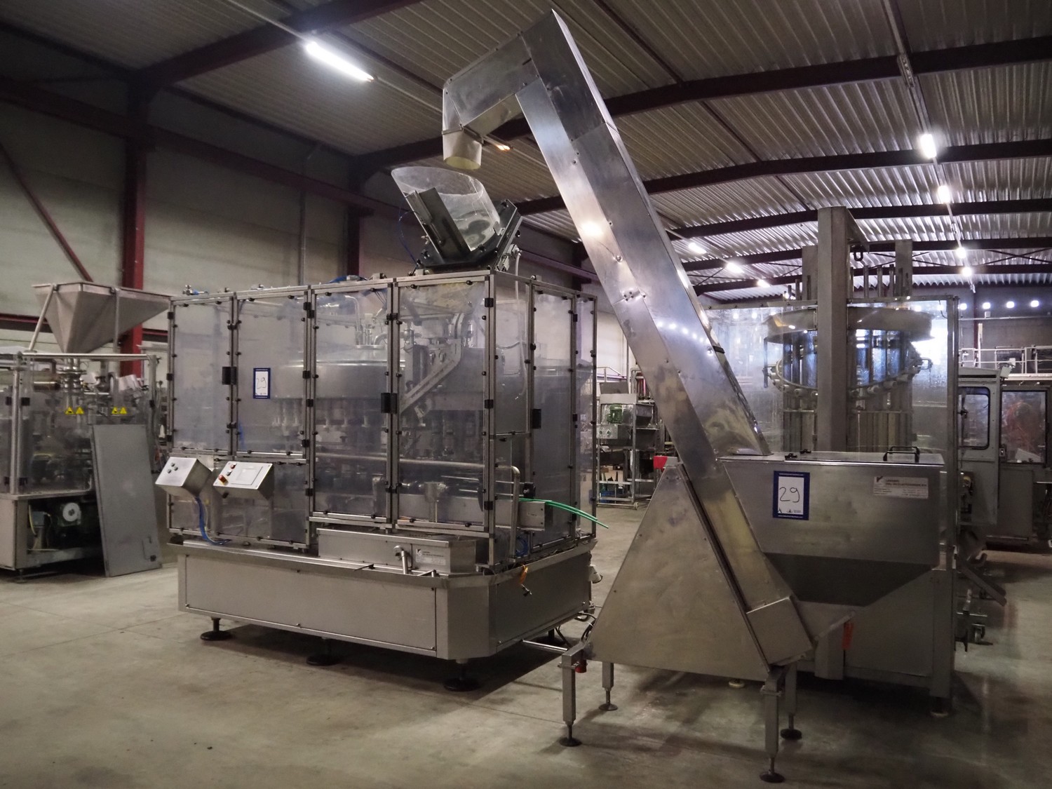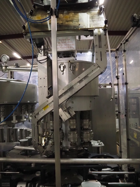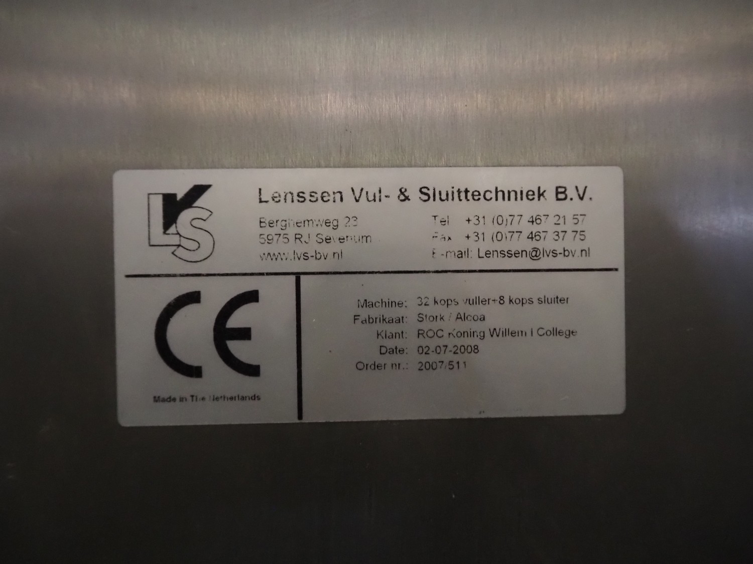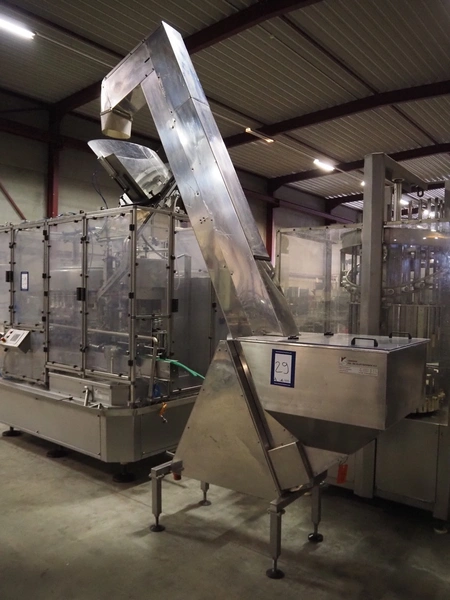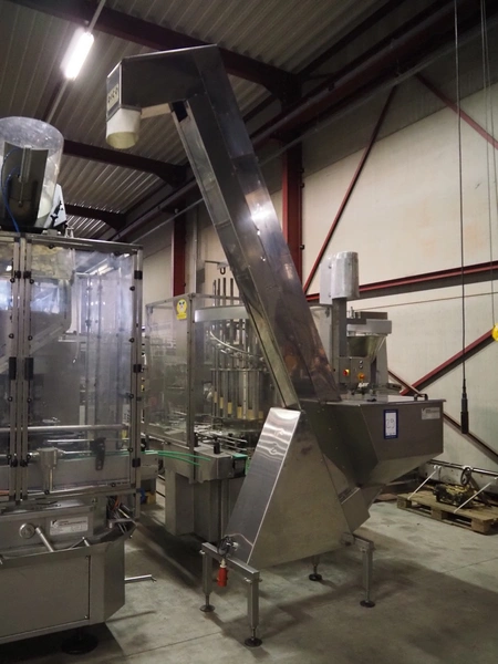 Stork/Alcoa bottle filling and closing machine with elevating belt, type filling and closing machine: 32 kops vuller + 8 kops sluiter, year of construction: 02-07-2008, dimensions: 3050 mm x 2300 mm x 3000 mm. Elevating belt, plastic belt, belt width: 200 mm, divider height: 55 mm, distance between dividers: 130 mm, total dimensions: 2450 mm x 800 mm x 3350 mm.