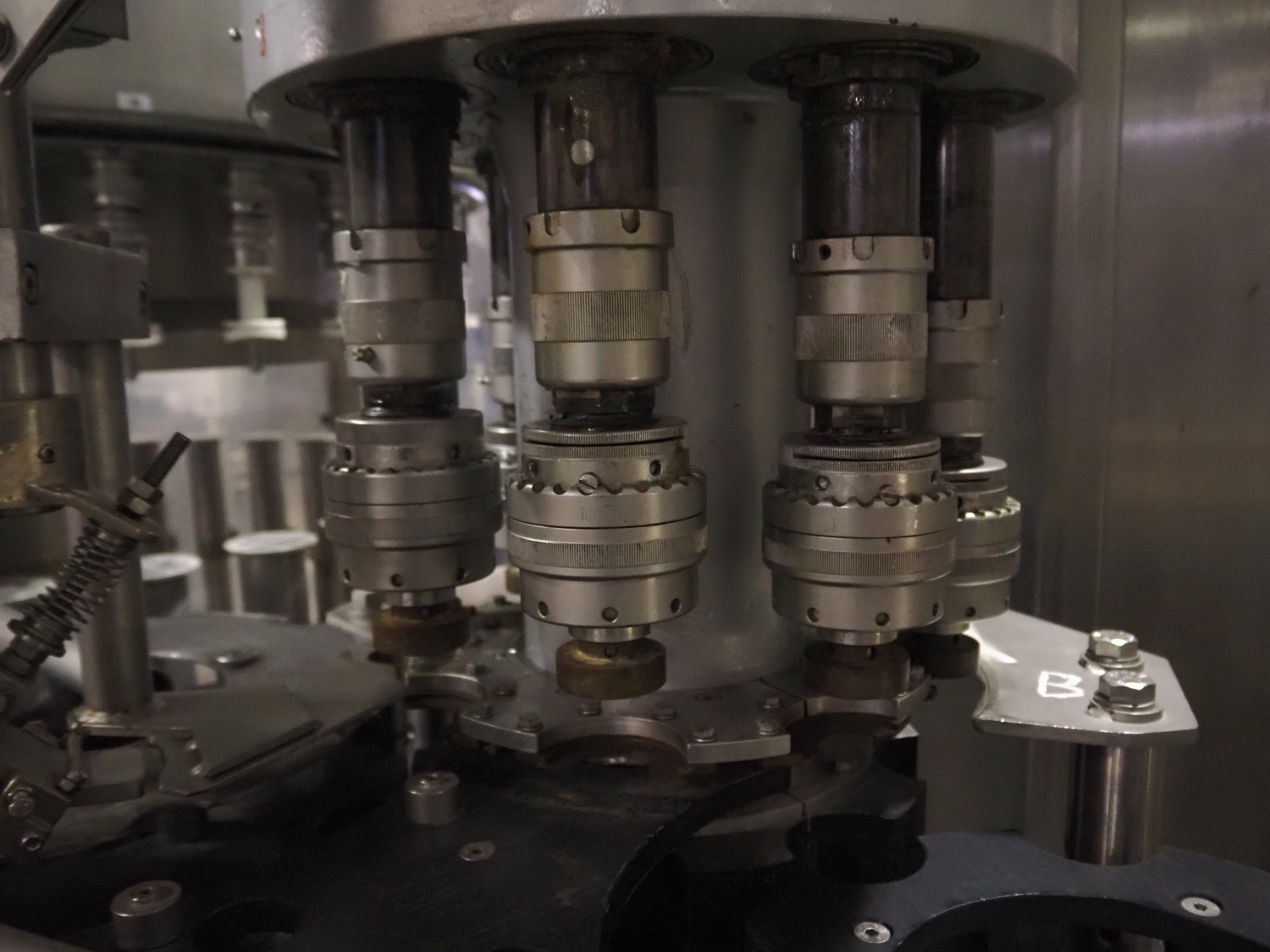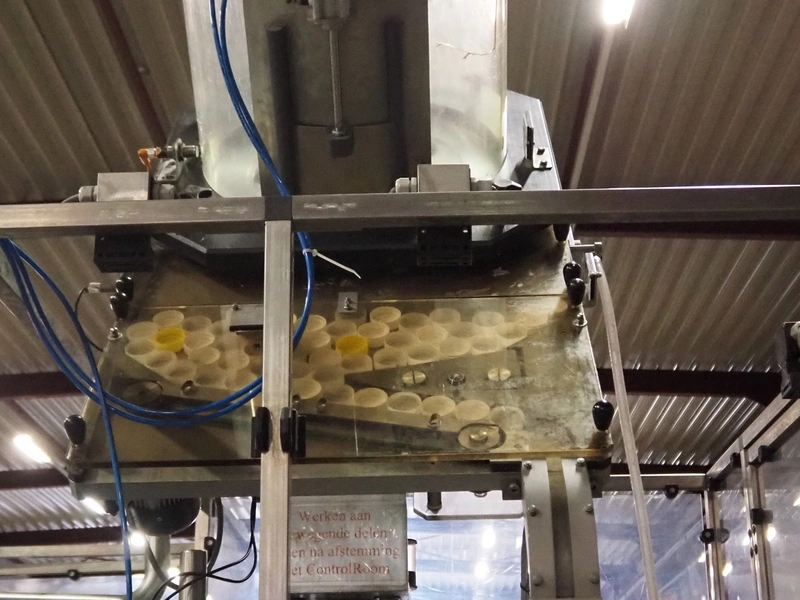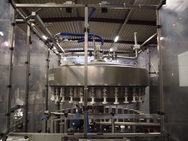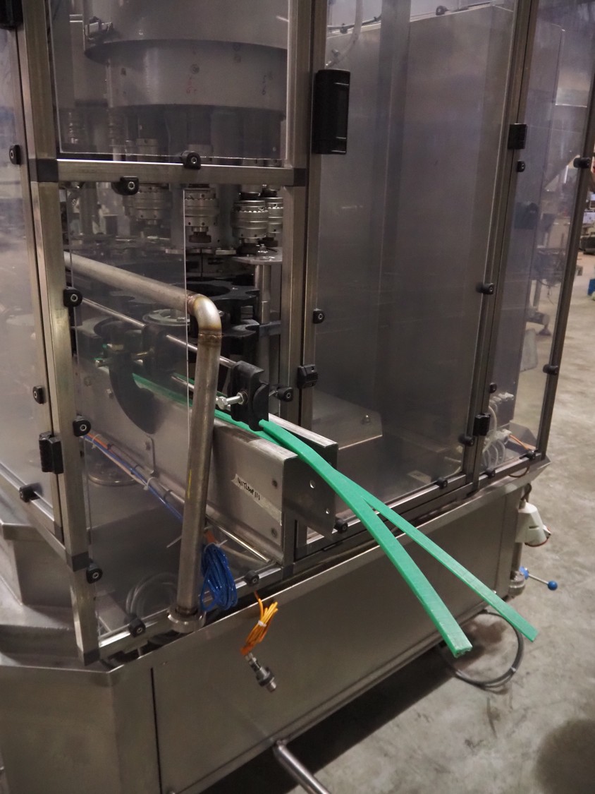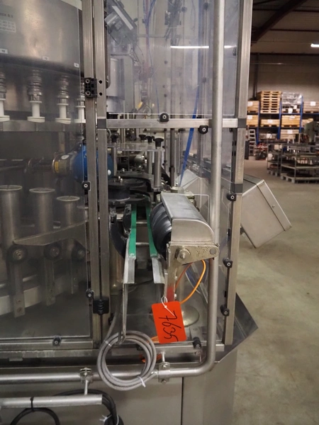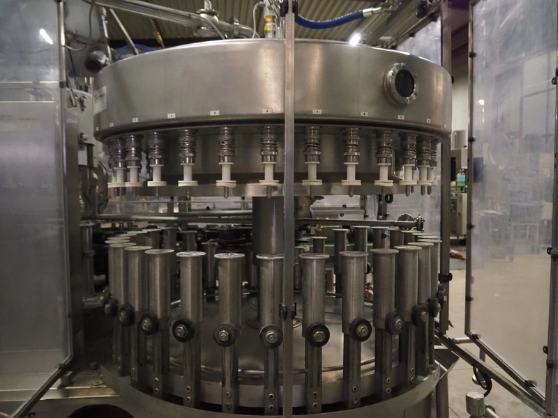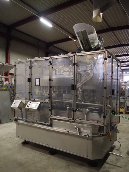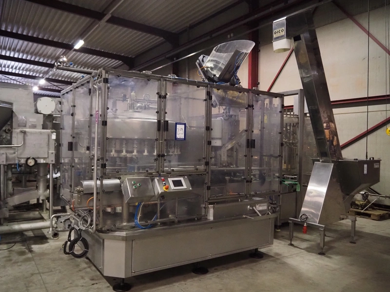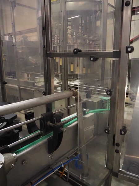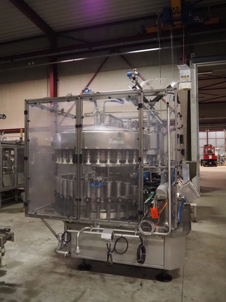 Stork/Alcoa bottle filling and closing machine with elevating belt, type filling and closing machine: 32 kops vuller + 8 kops sluiter, year of construction: 02-07-2008, dimensions: 3050 mm x 2300 mm x 3000 mm. Elevating belt, plastic belt, belt width: 200 mm, divider height: 55 mm, distance between dividers: 130 mm, total dimensions: 2450 mm x 800 mm x 3350 mm.