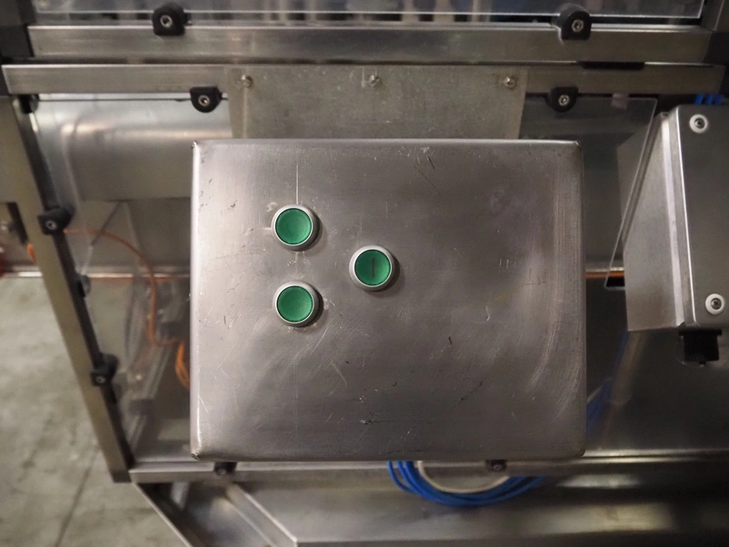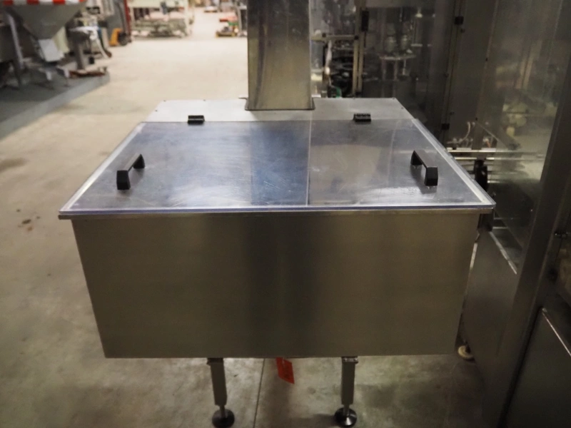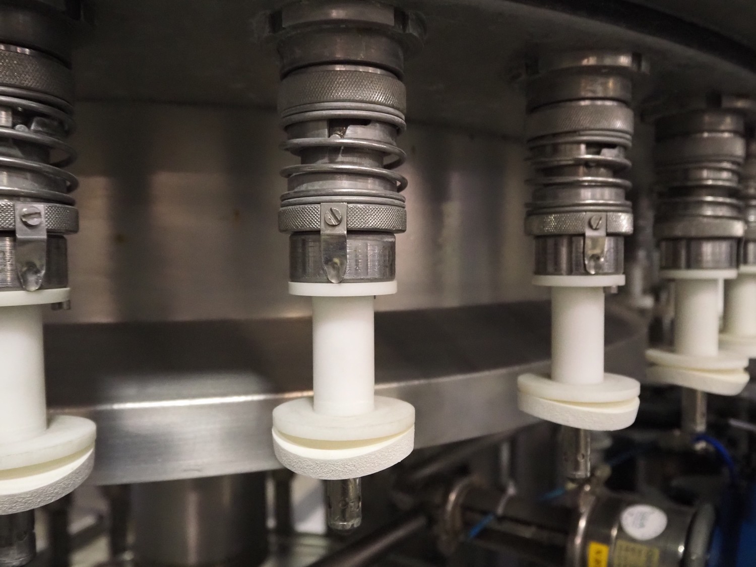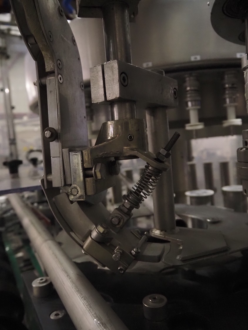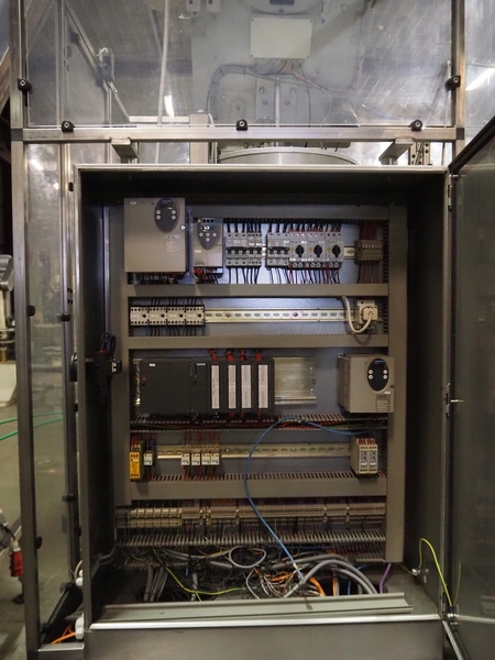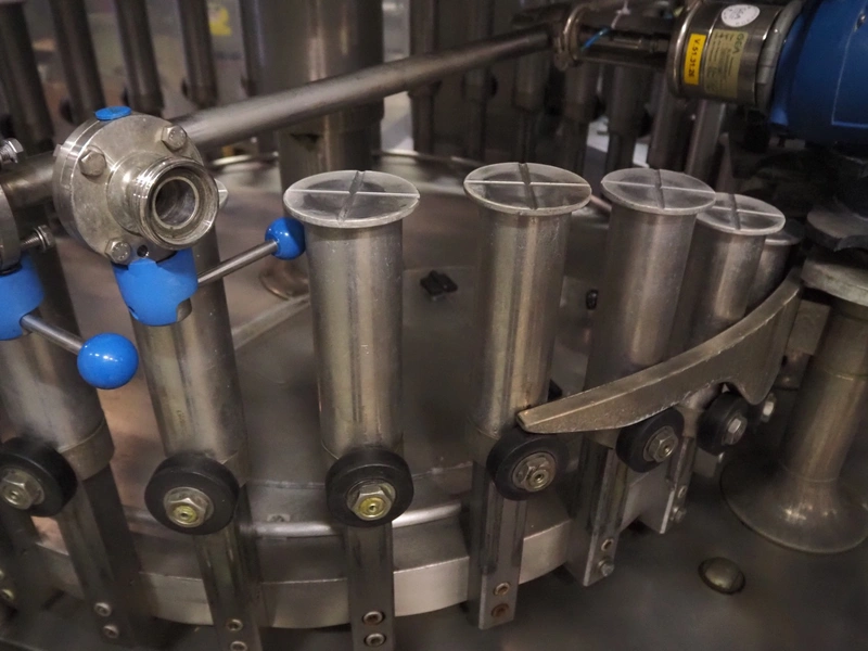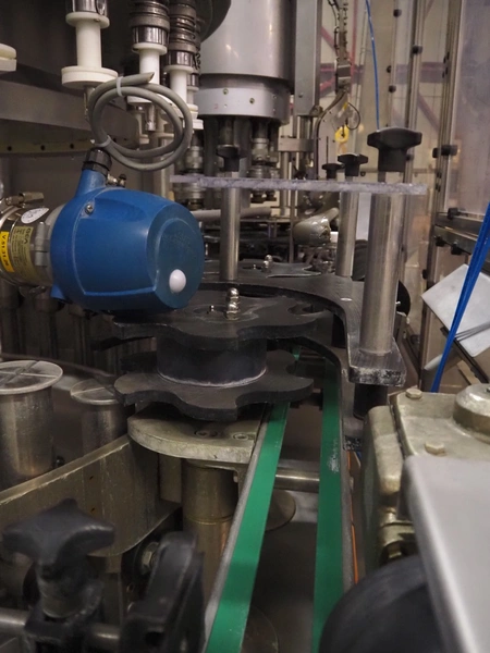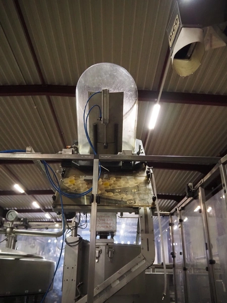 Stork/Alcoa bottle filling and closing machine with elevating belt, type filling and closing machine: 32 kops vuller + 8 kops sluiter, year of construction: 02-07-2008, dimensions: 3050 mm x 2300 mm x 3000 mm. Elevating belt, plastic belt, belt width: 200 mm, divider height: 55 mm, distance between dividers: 130 mm, total dimensions: 2450 mm x 800 mm x 3350 mm.