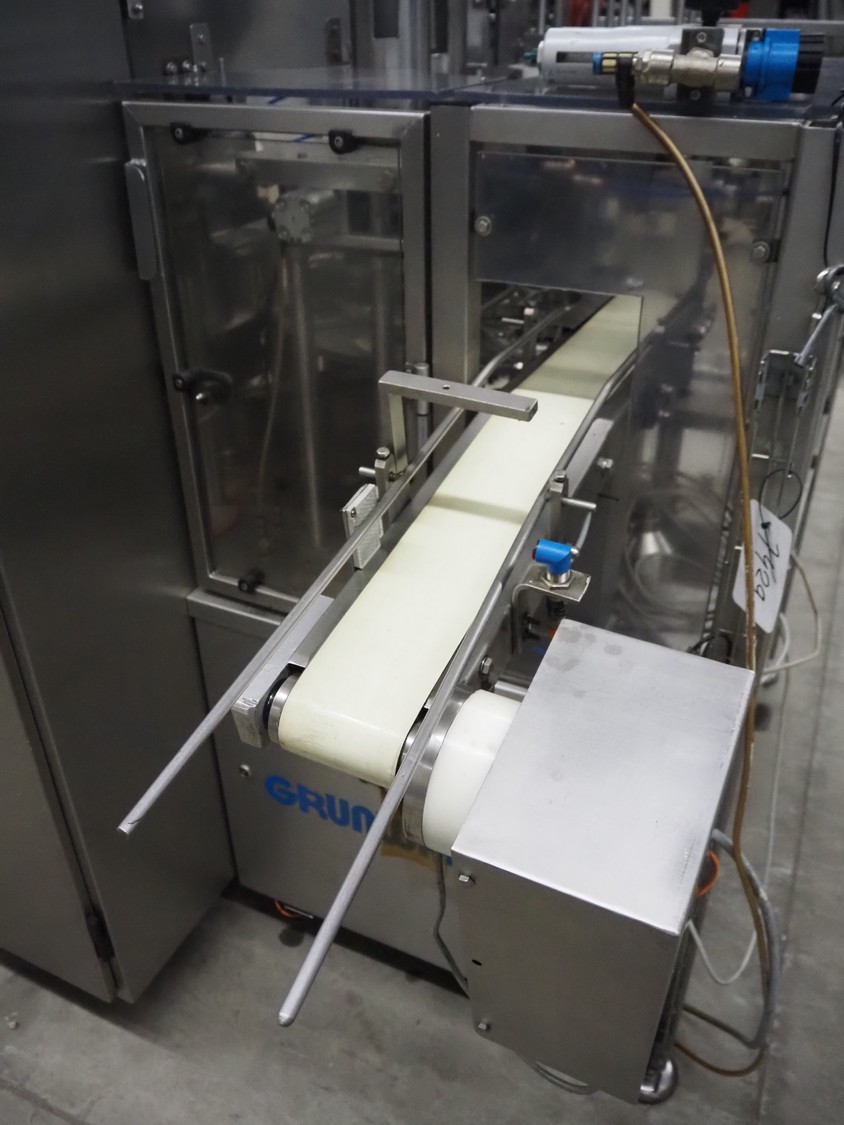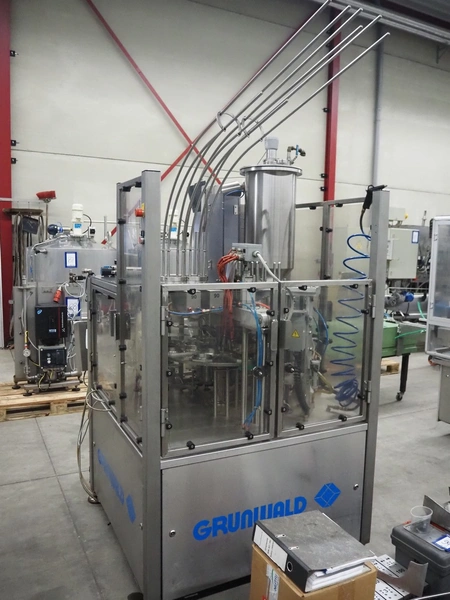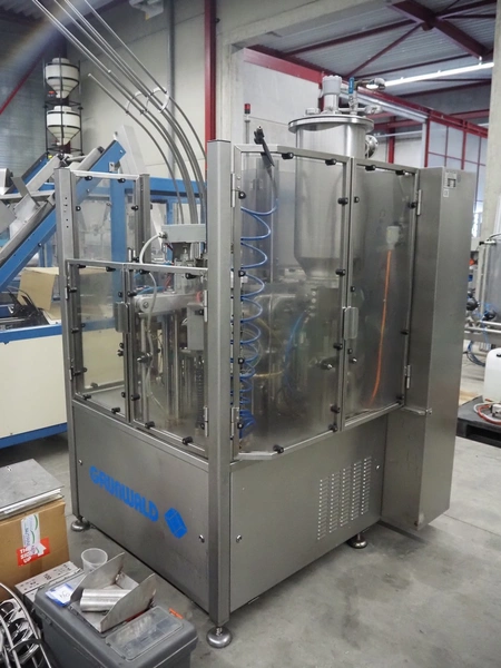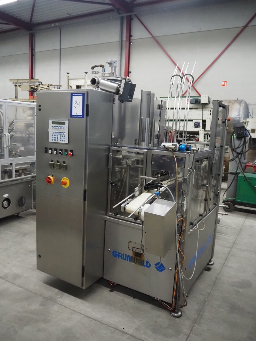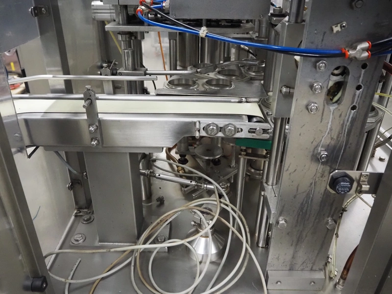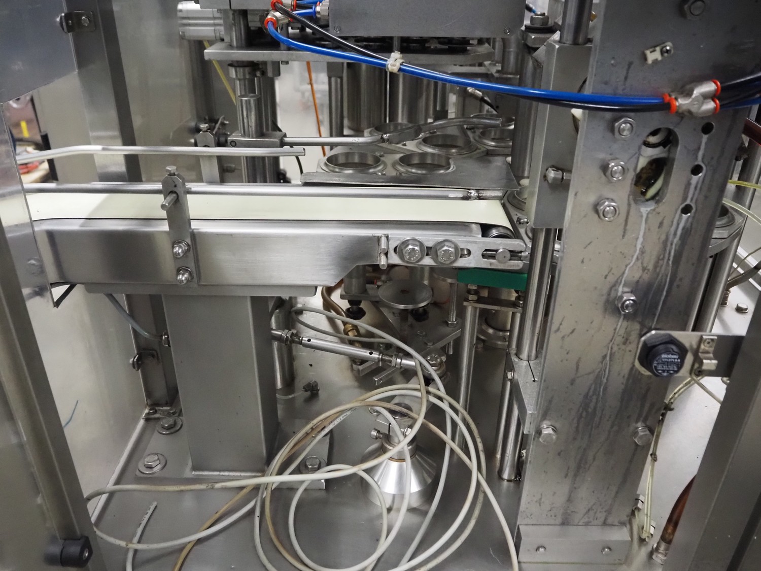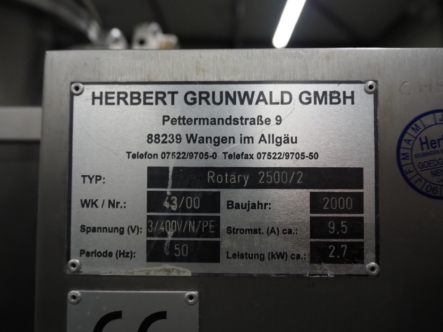 Herbert Grunwald GmbH cup filling and closing machine, type: Rotary 2500/2, number: 43/00, year of construction: 2000, 400 V, 3 Ph, 50 Hz, 9.5 A, 2.7 kW, 8x 2 dye's, dimensions dye's: Ø 80 mm, plastic outfeed belt, belt width: 100 mm, total dimensions: 1800 mm x 1380 mm x 2400 mm. Including pallet with parts.