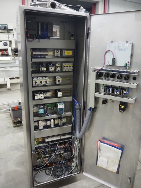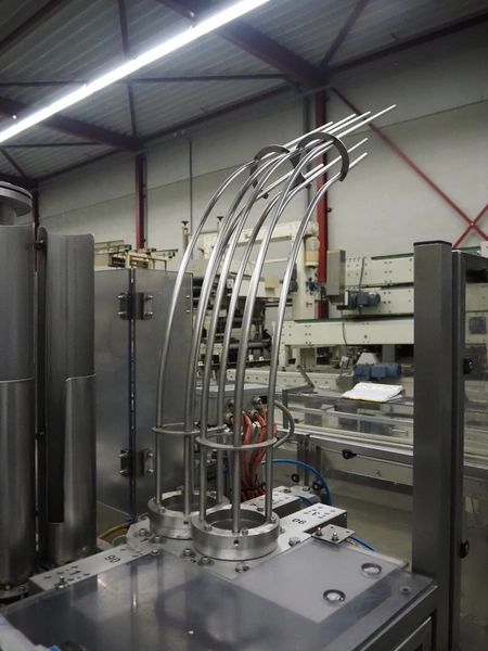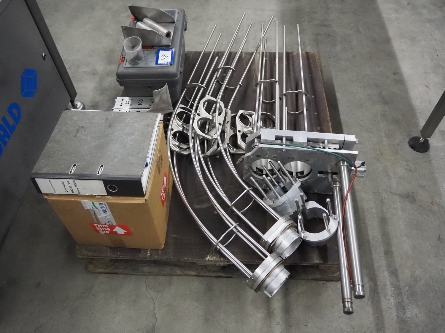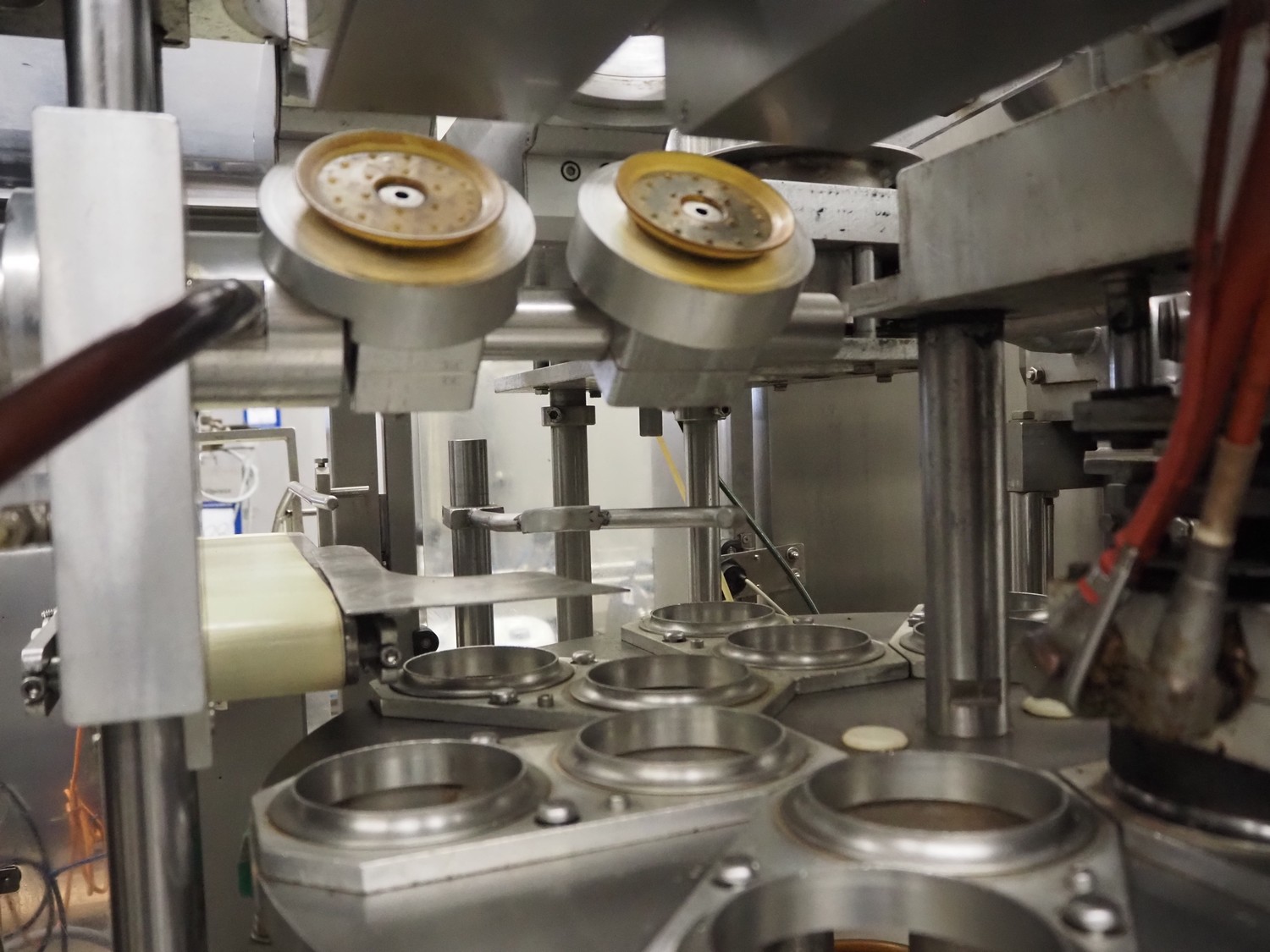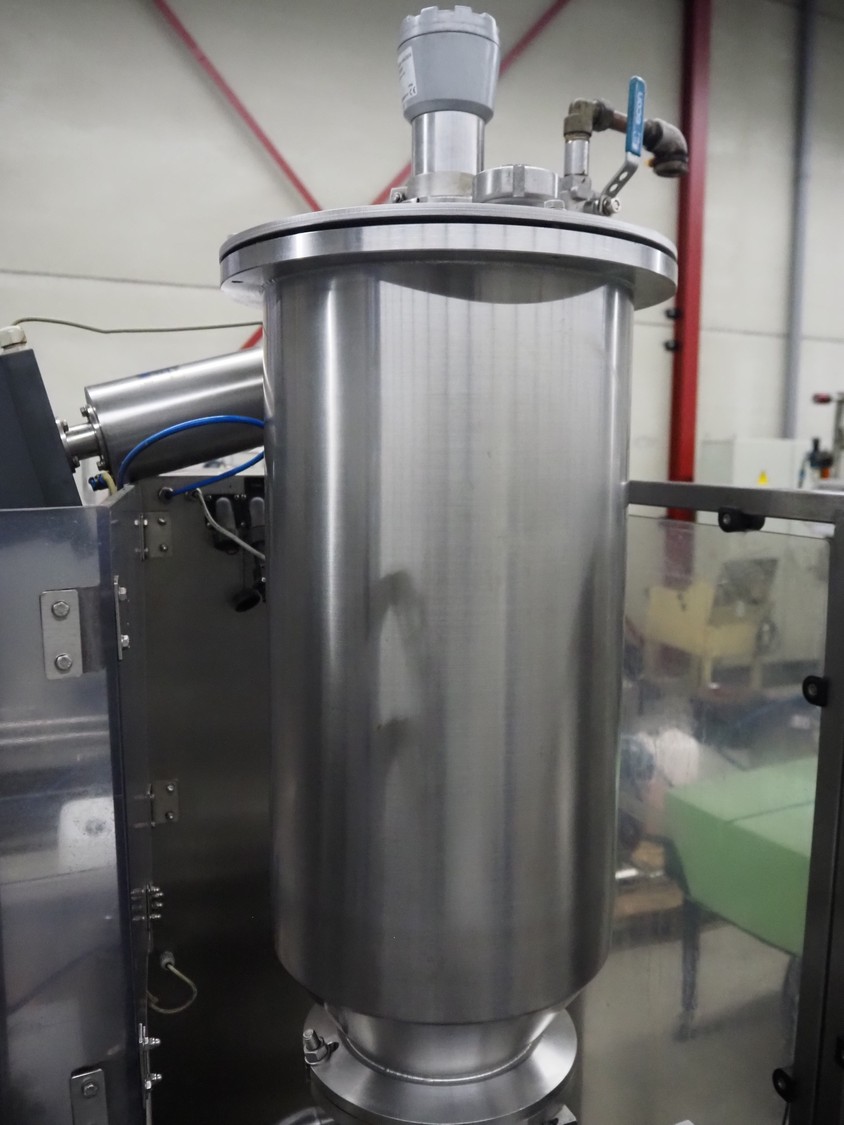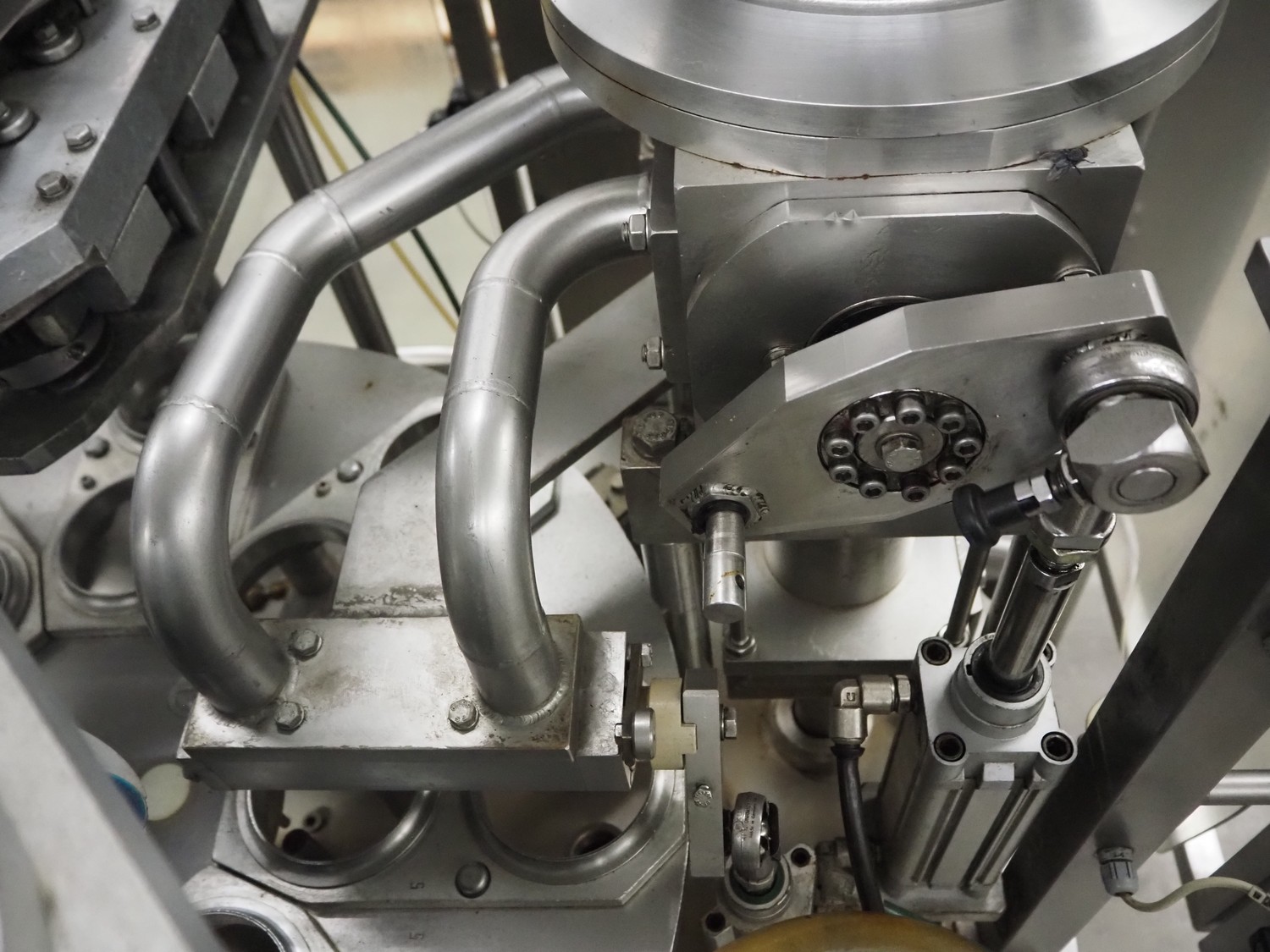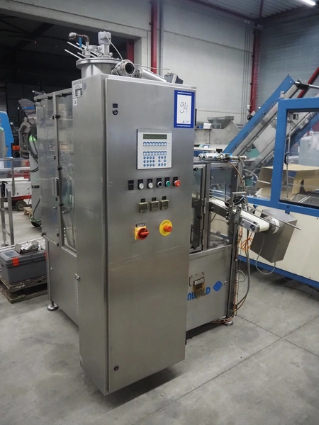 Herbert Grunwald GmbH cup filling and closing machine, type: Rotary 2500/2, number: 43/00, year of construction: 2000, 400 V, 3 Ph, 50 Hz, 9.5 A, 2.7 kW, 8x 2 dye's, dimensions dye's: Ø 80 mm, plastic outfeed belt, belt width: 100 mm, total dimensions: 1800 mm x 1380 mm x 2400 mm. Including pallet with parts.