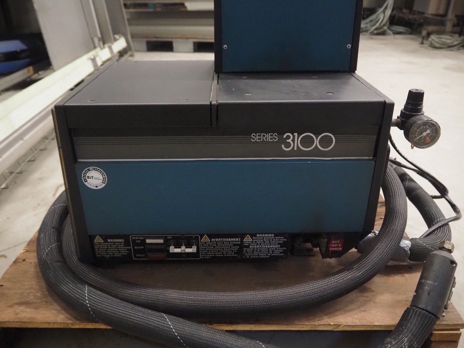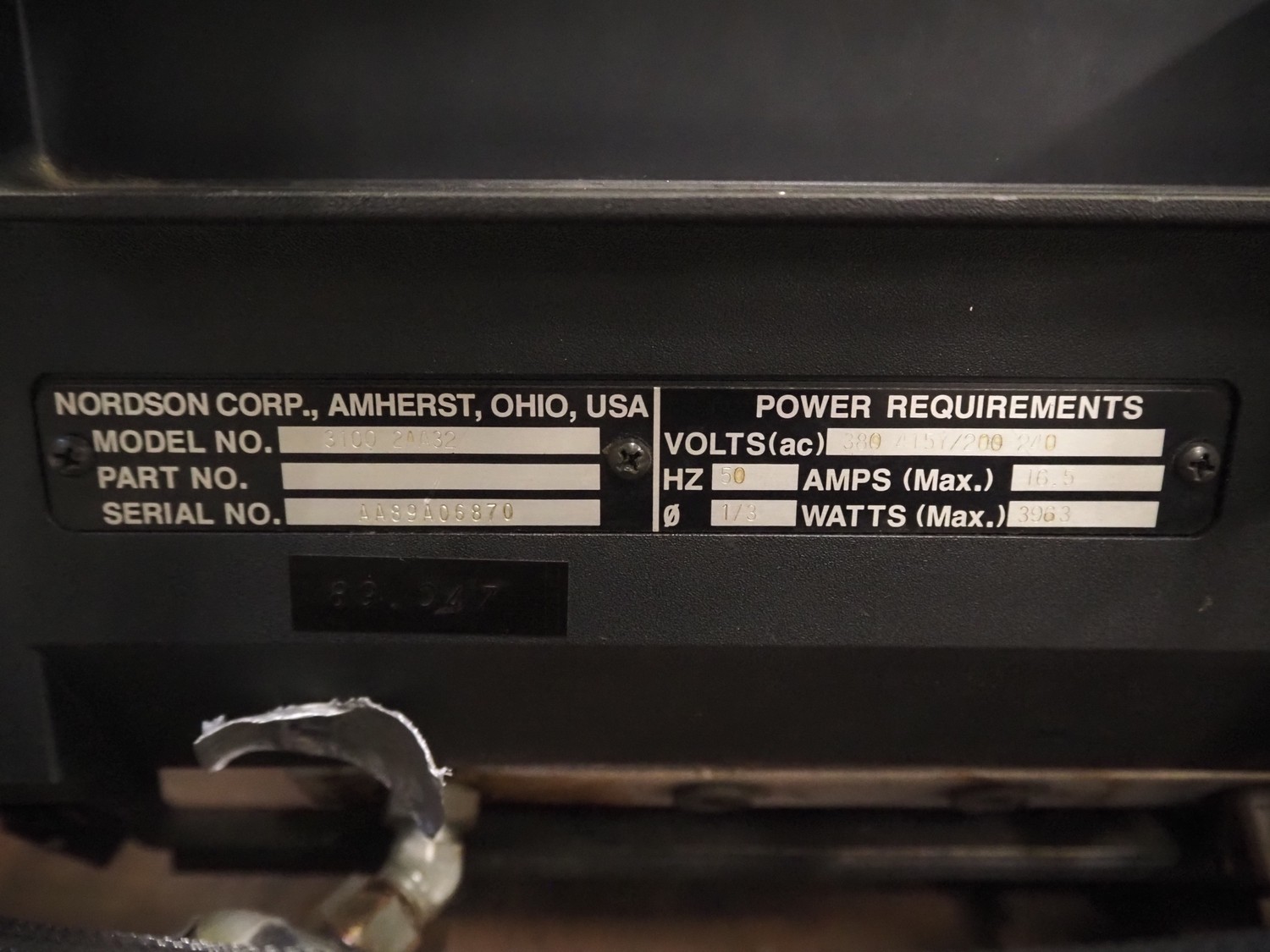 Nordson glue unit, unit number: 3100 2AA32, serial number: AA89A06870, 380-415/200-240 V, 50 Hz, 16.5 A, 3963 W, dimensions: 630 mm x 340 mm x 560 mm.