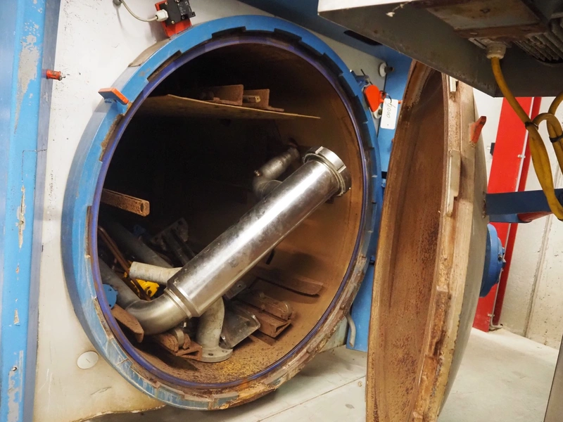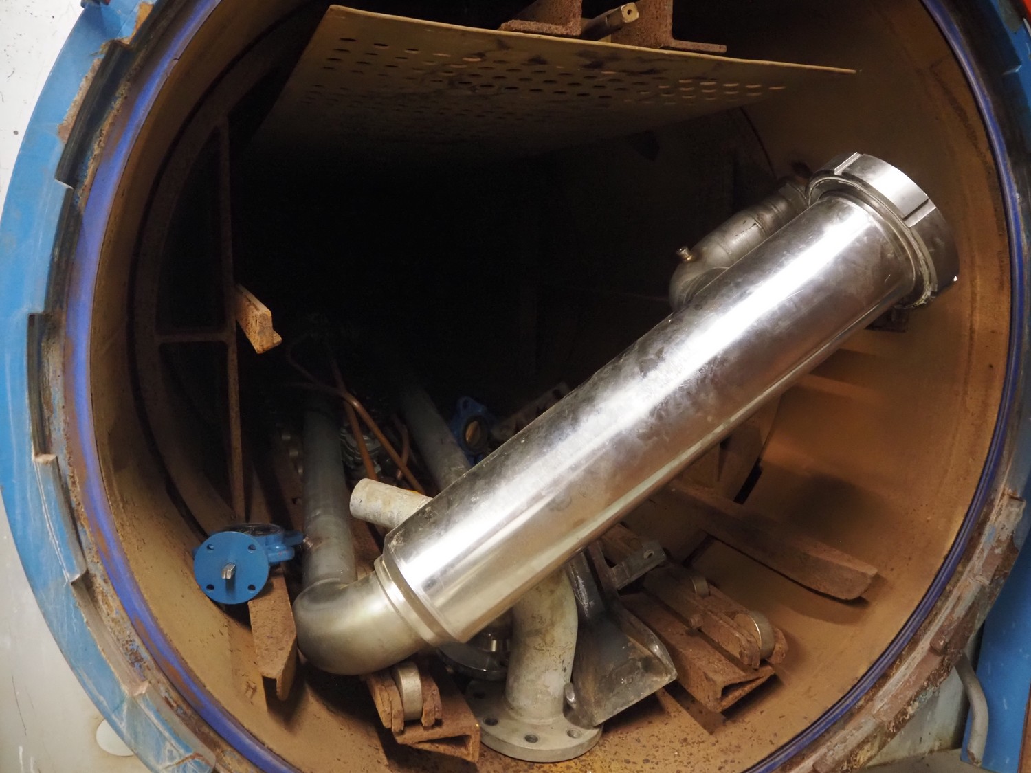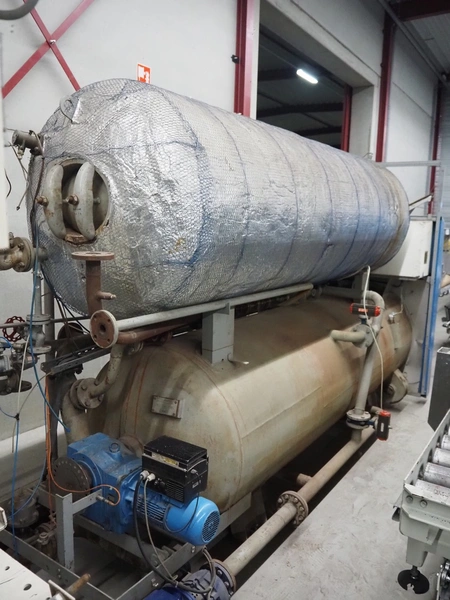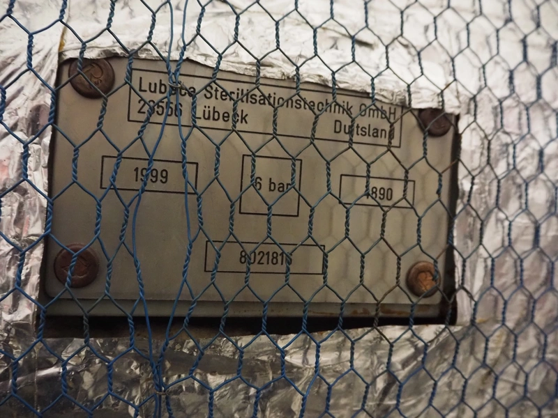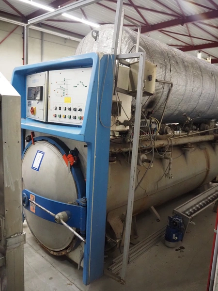 Lubeca rotating autoclave for 4 baskets, type: LW 2020, manufacturing number: 4218, year of construction: 1999, 400 V, 50 Hz, 40 A, permissible working pressure: 6 bar, permissible working temperature: 164°C, capacity: 3300 liter, for basket with dimensions 700 mm x 700 mm, Alfa Laval heat exchanger, type: CB76-80H, serial number: 18538341, year of construction: 2008, total dimensions autoclave: 1700 mm x 4500 mm x 2600 mm.